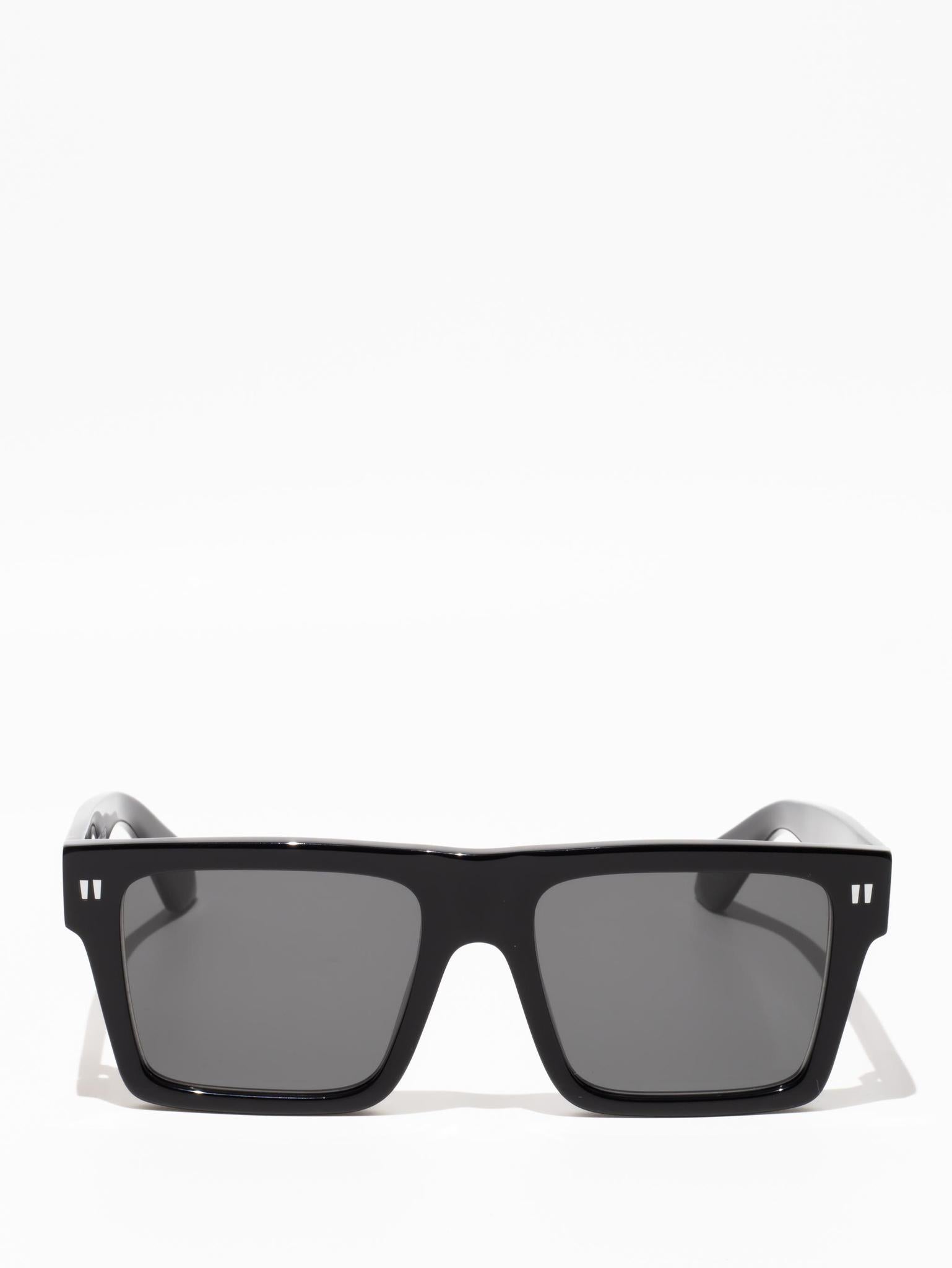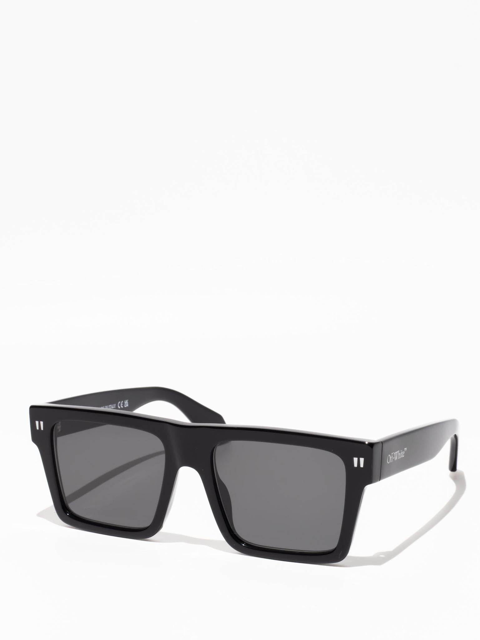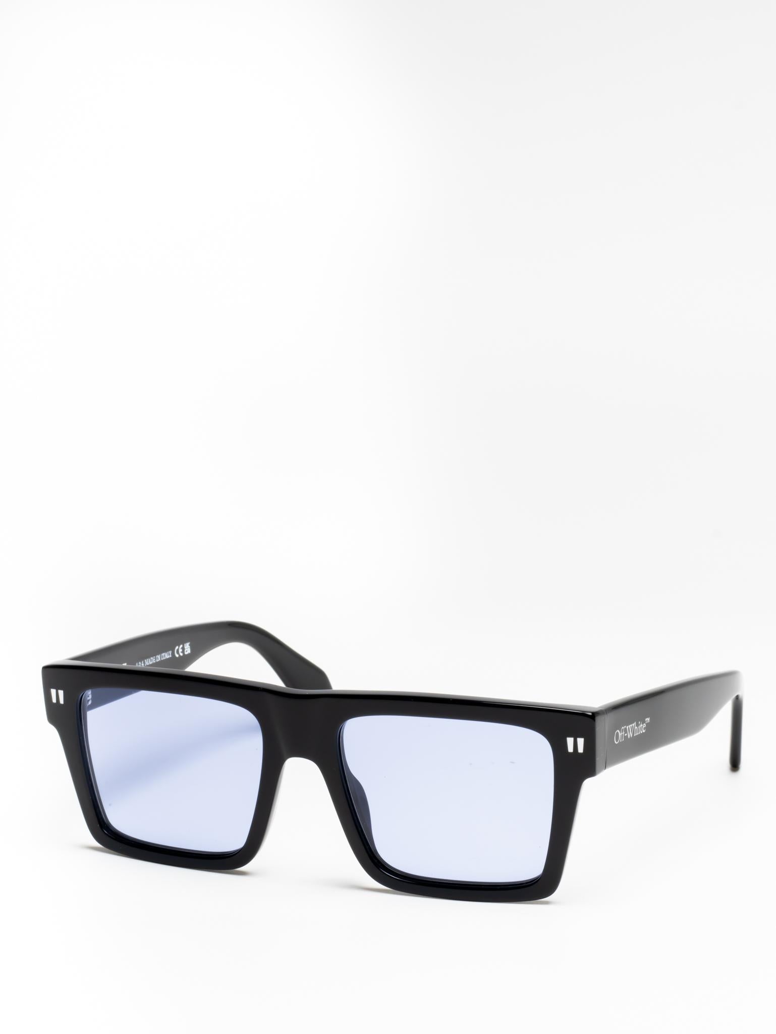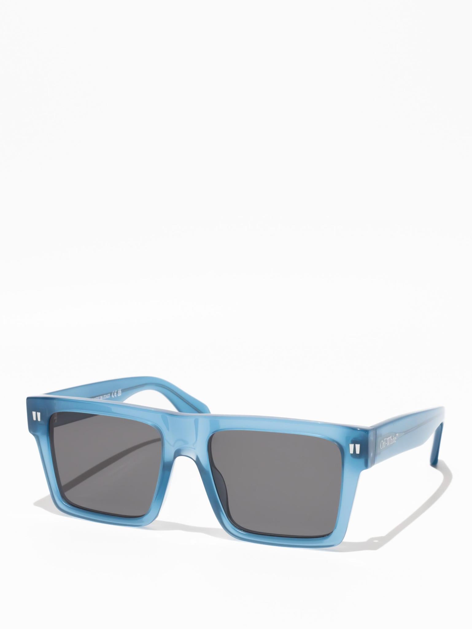 These acetate sunglasses feature an oversized geometric silhouette with a flattened top edge and elongated side tips. They are completed with signature quotation marks on the temples and metal logos on the arms. Made in Italy.