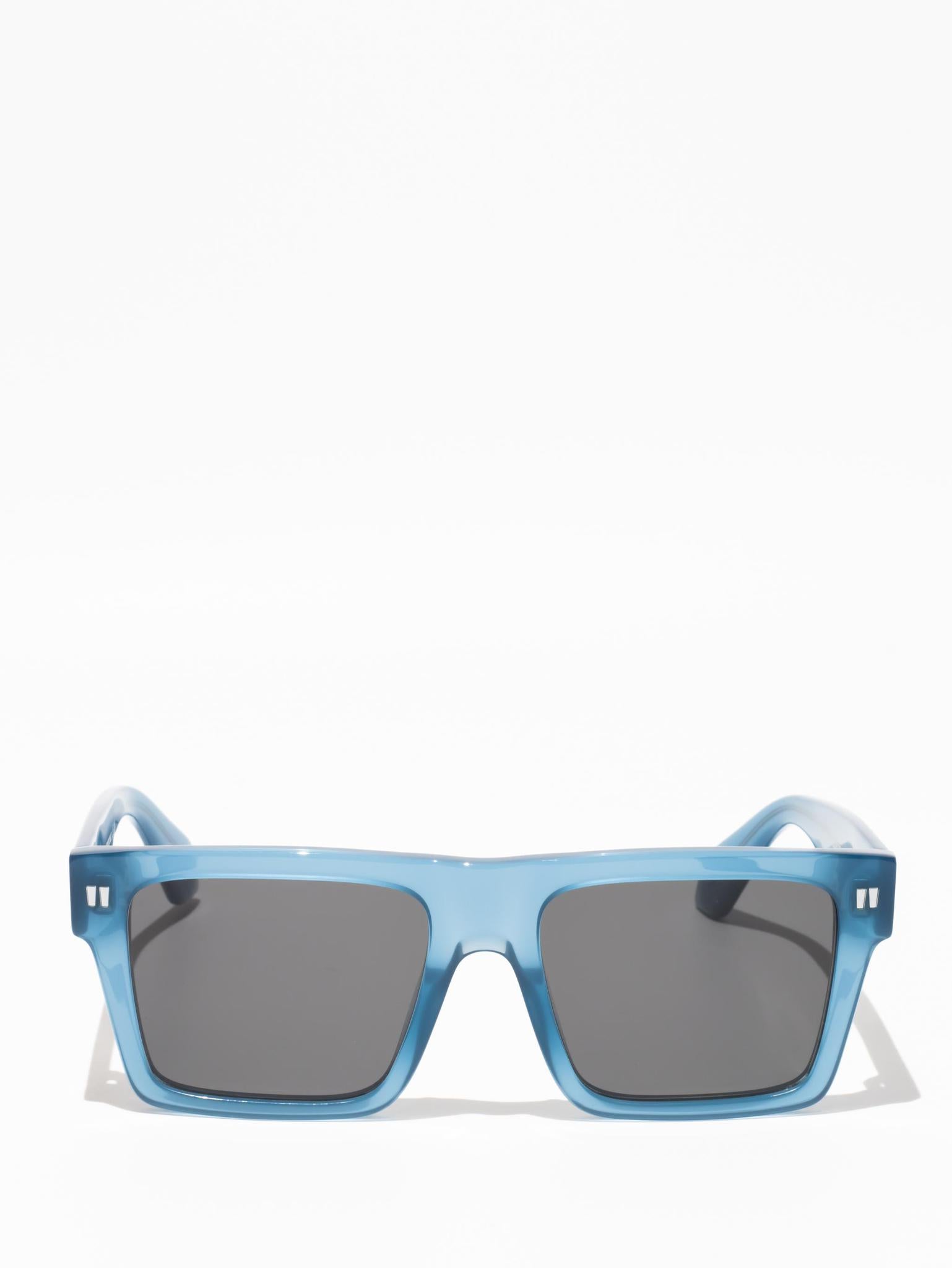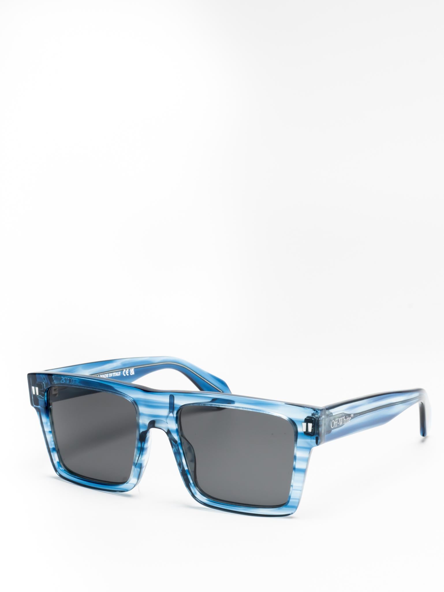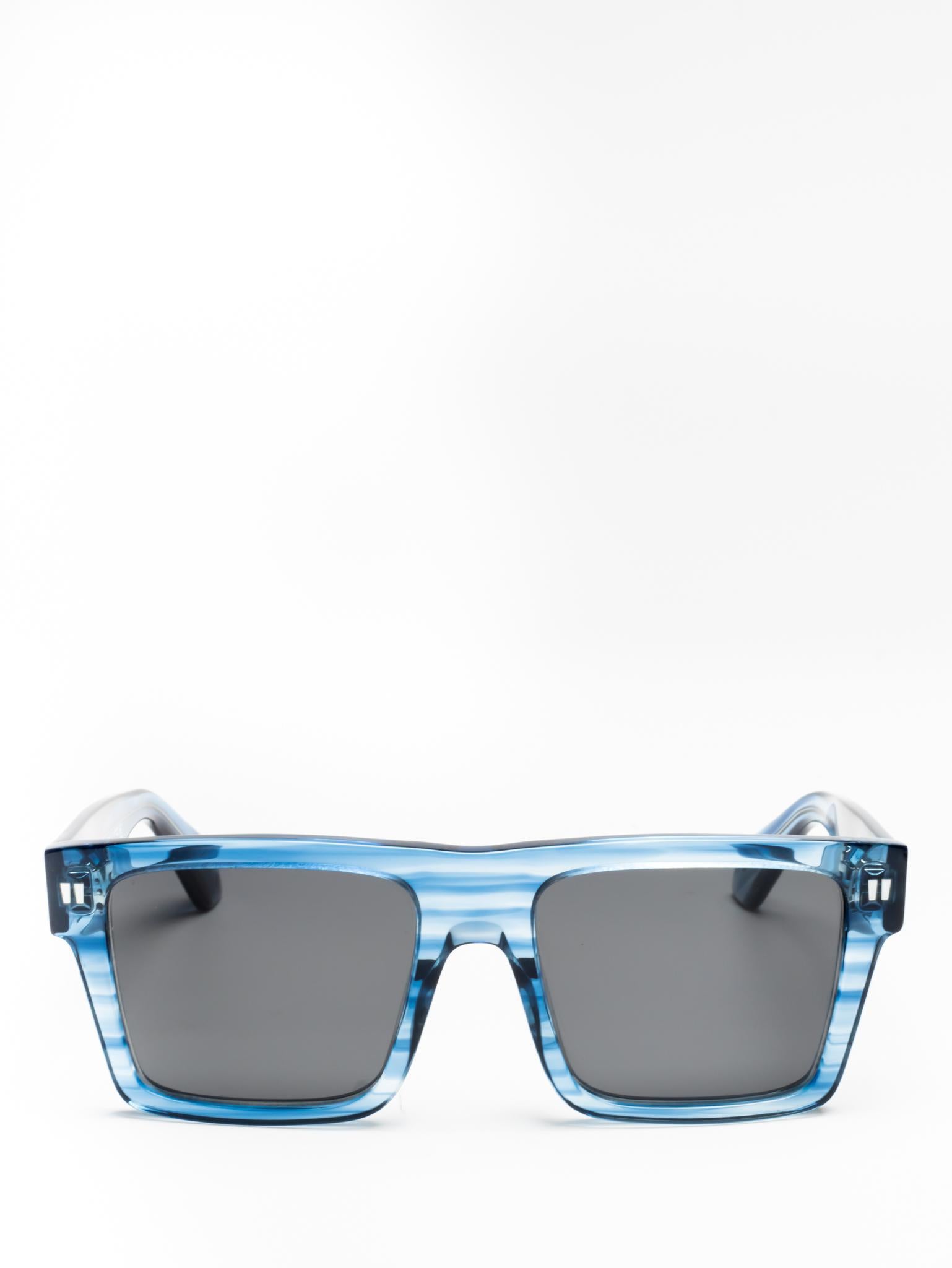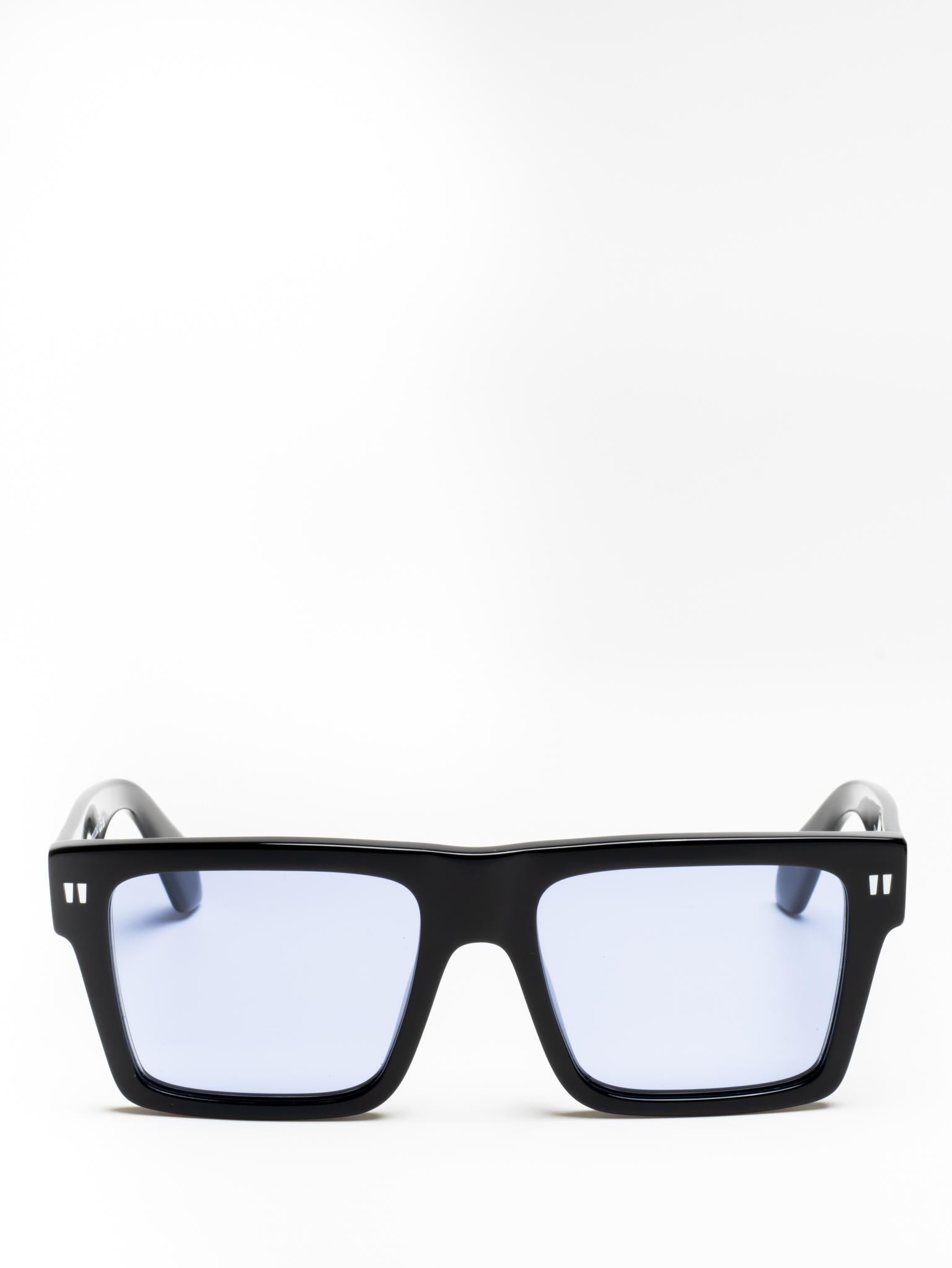 These acetate sunglasses feature an oversized geometric silhouette with a flattened top edge and elongated side tips. They are completed with signature quotation marks on the temples and metal logos on the arms. Made in Italy.