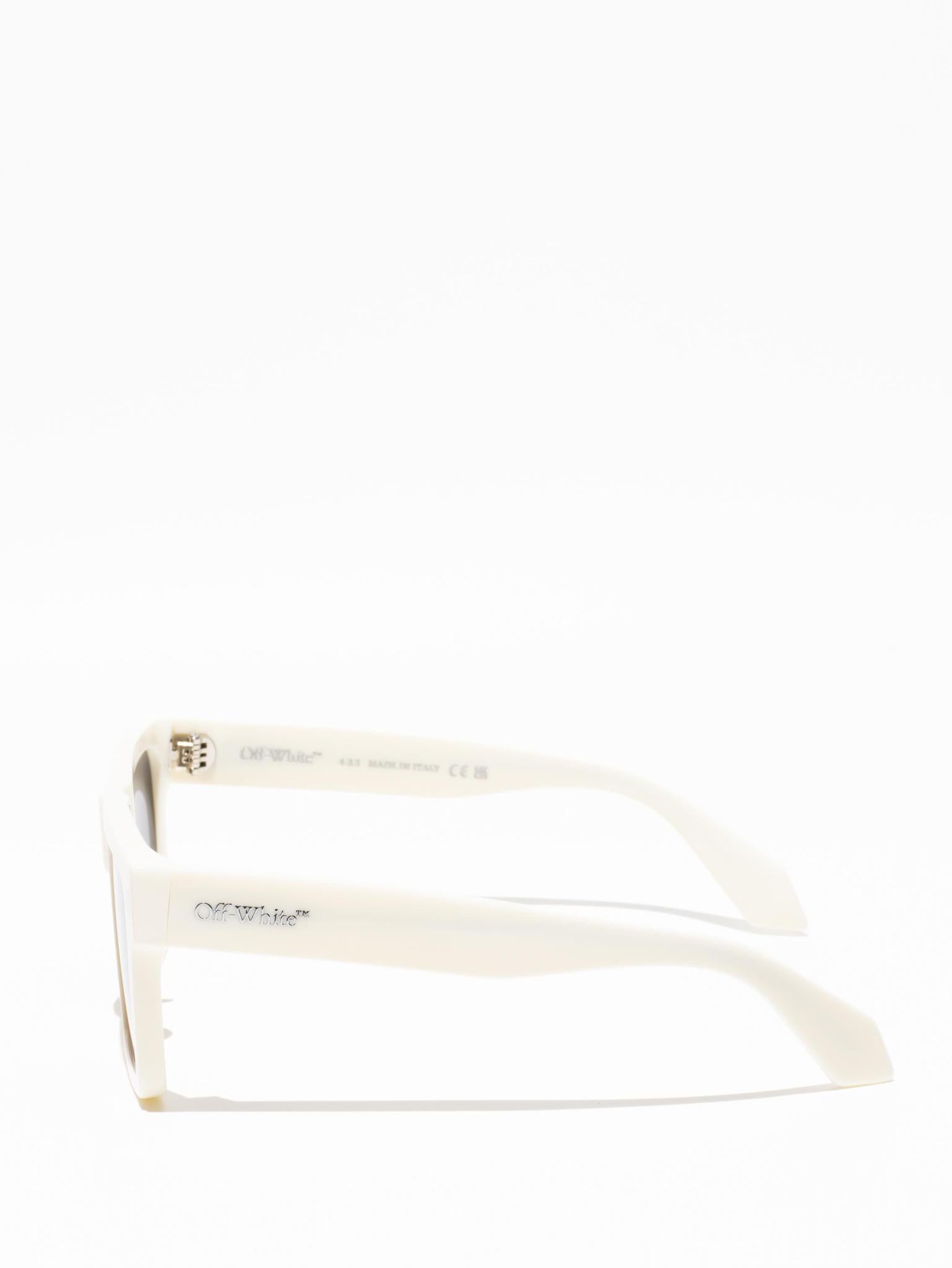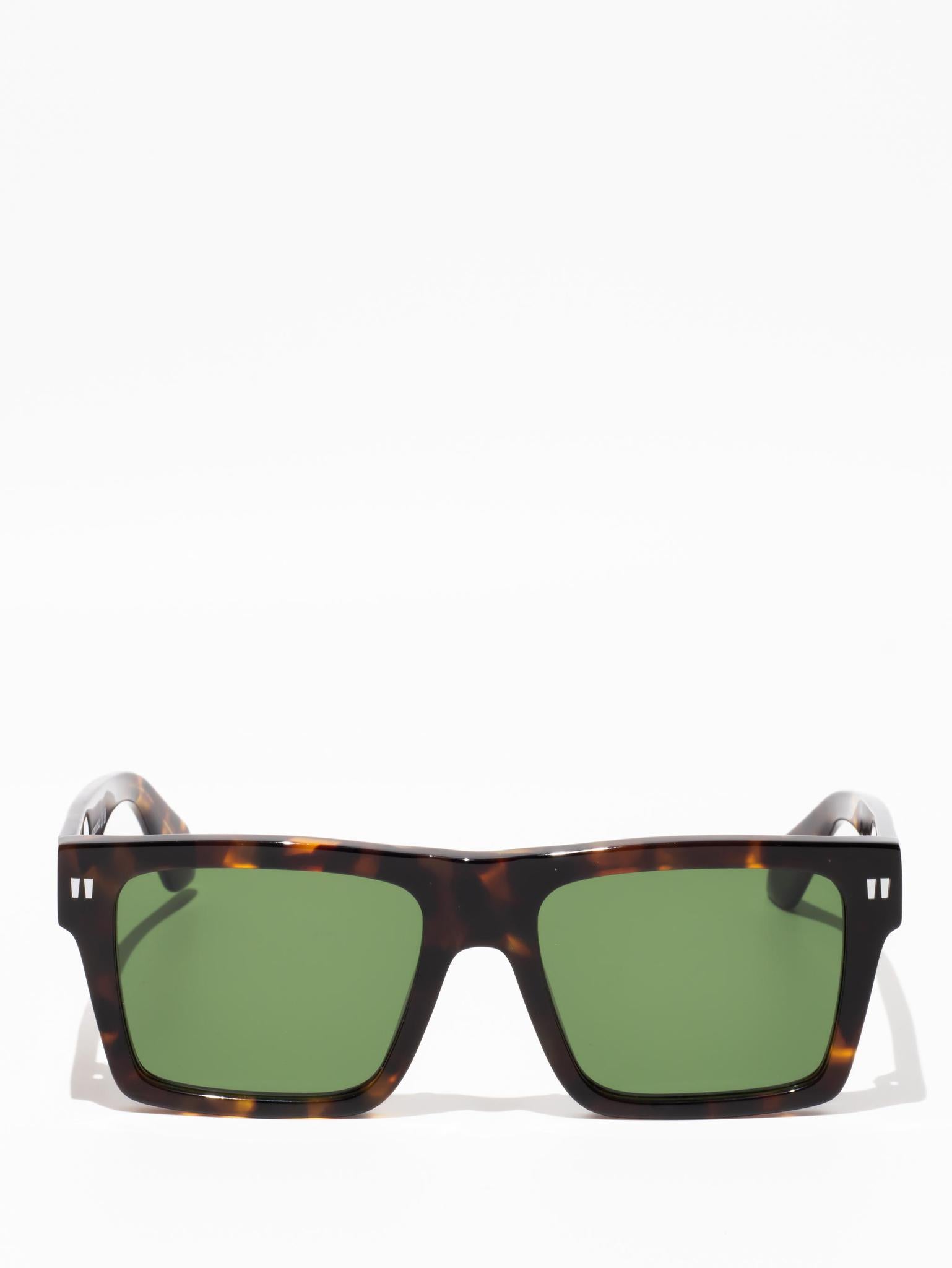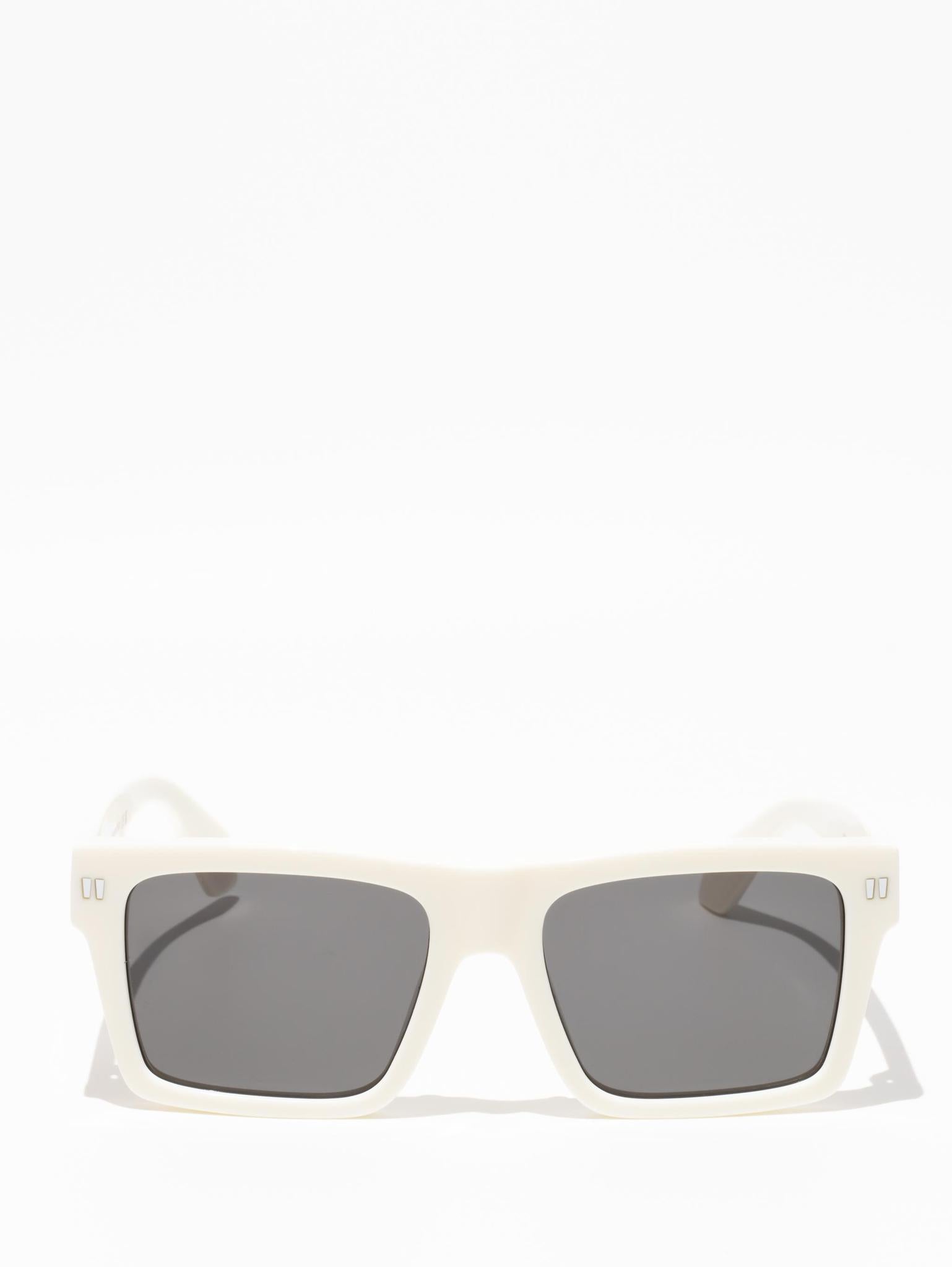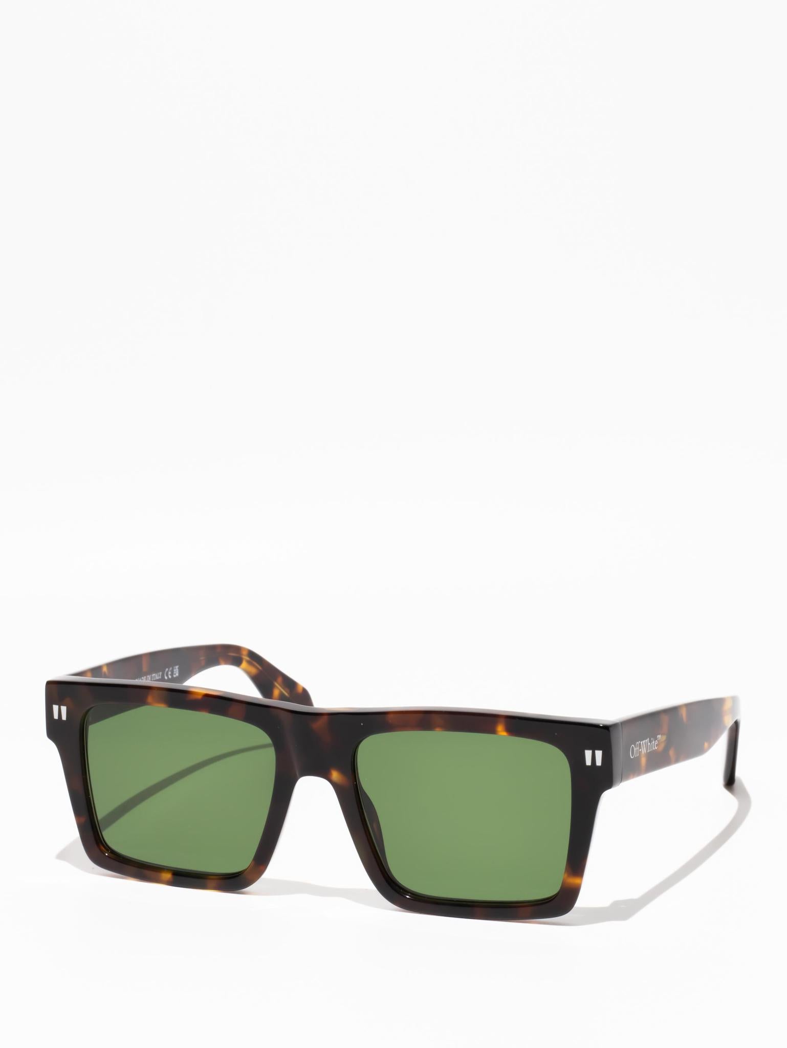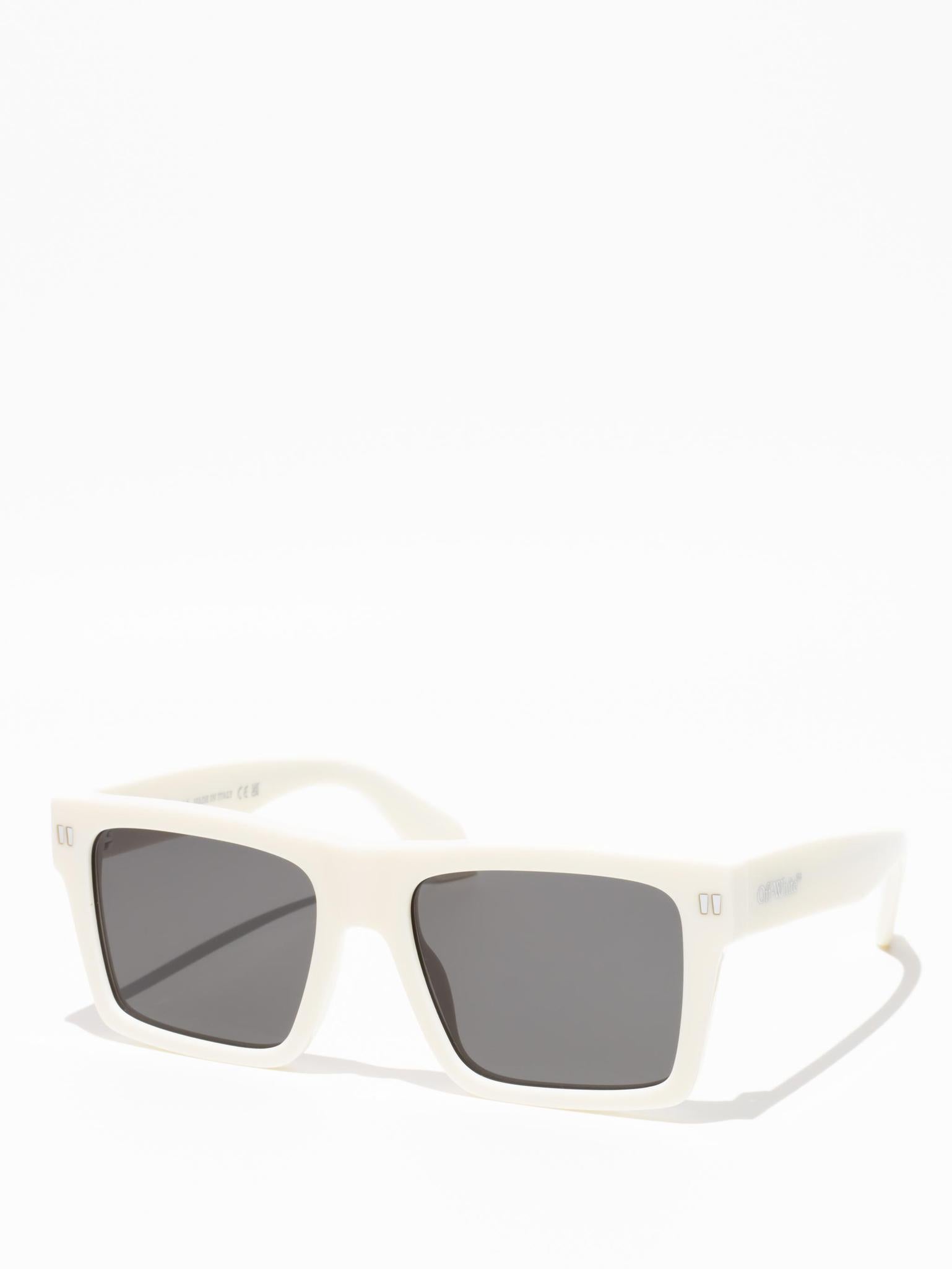 These acetate sunglasses feature an oversized geometric silhouette with a flattened top edge and elongated side tips. They are completed with signature quotation marks on the temples and metal logos on the arms. Made in Italy.