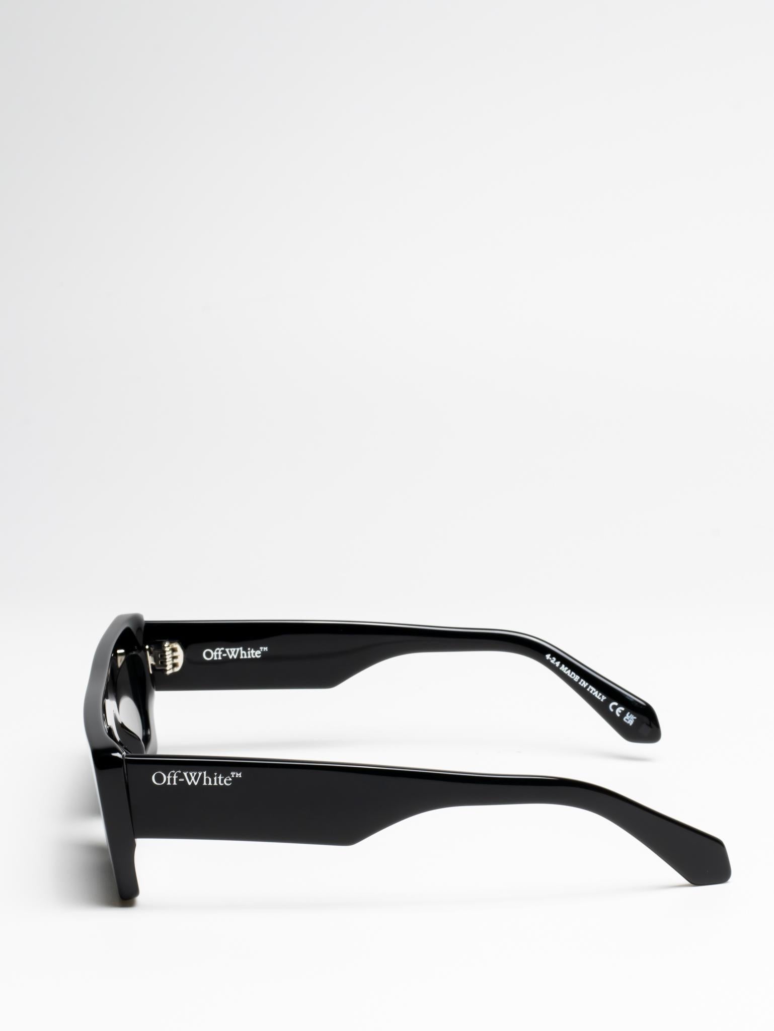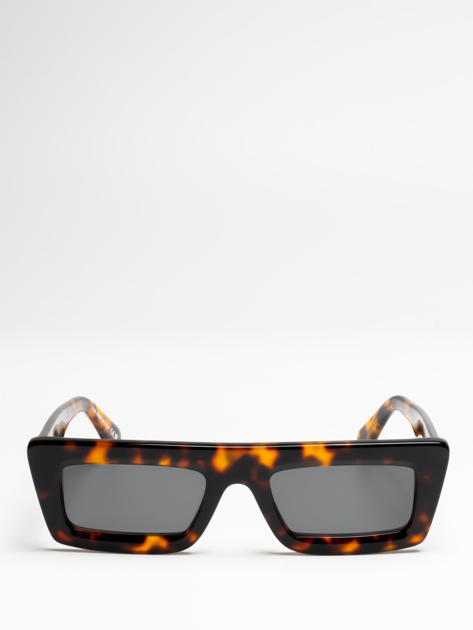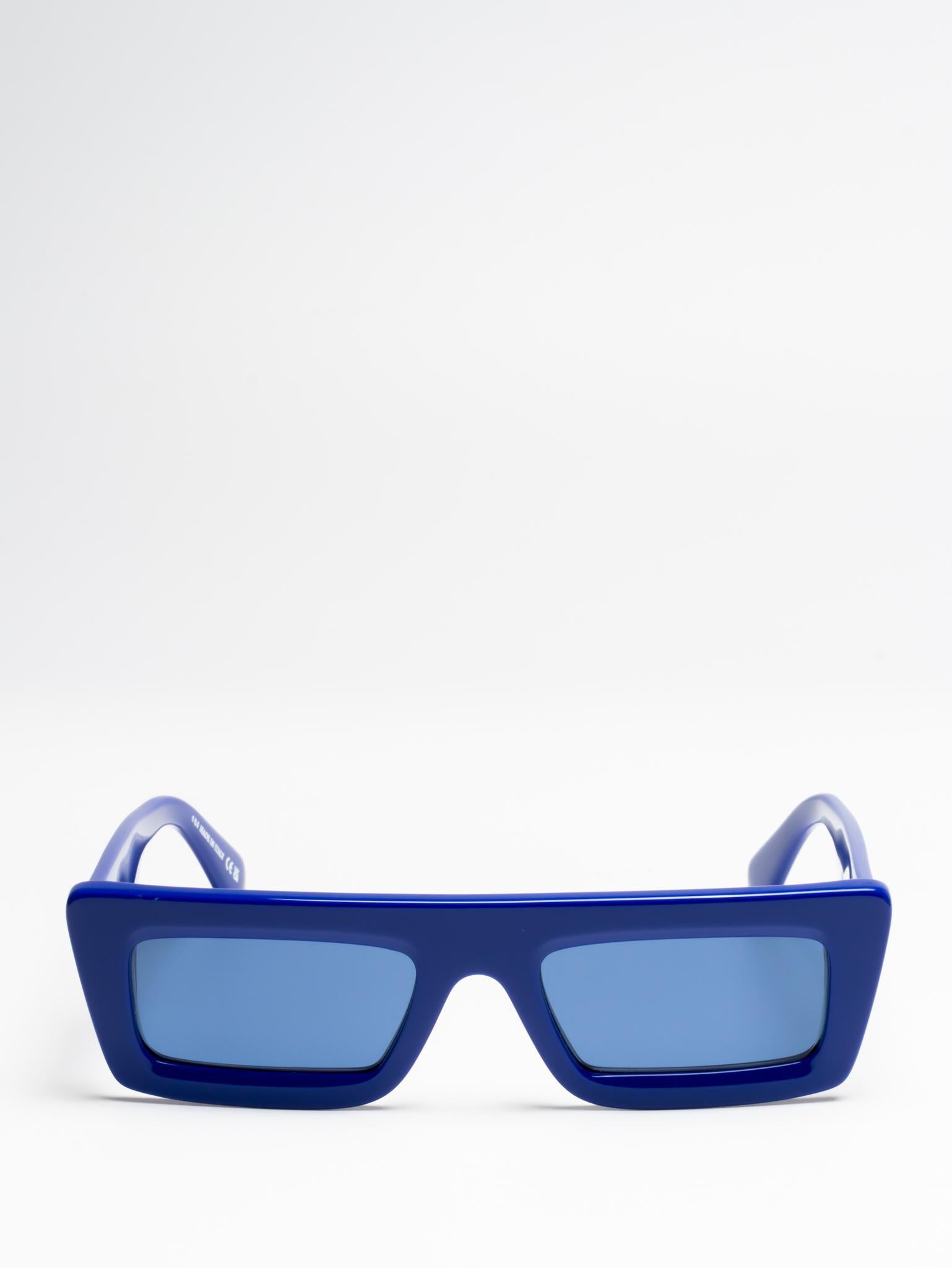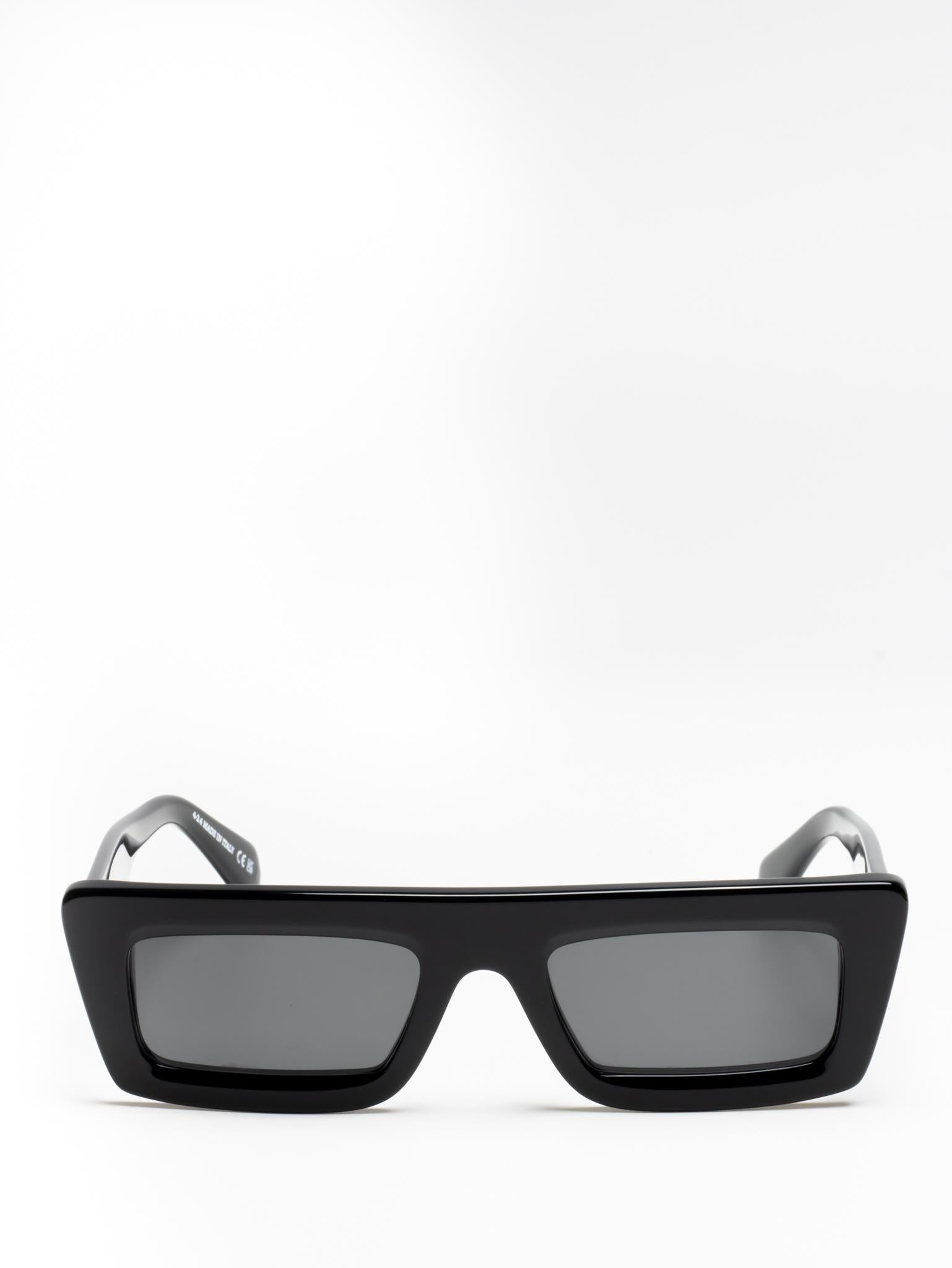 These acetate sunglasses feature a completely flat frame and a rectangular silhouette for an architectural look. They are completed with metal foil logos on the arms. Made in Italy.