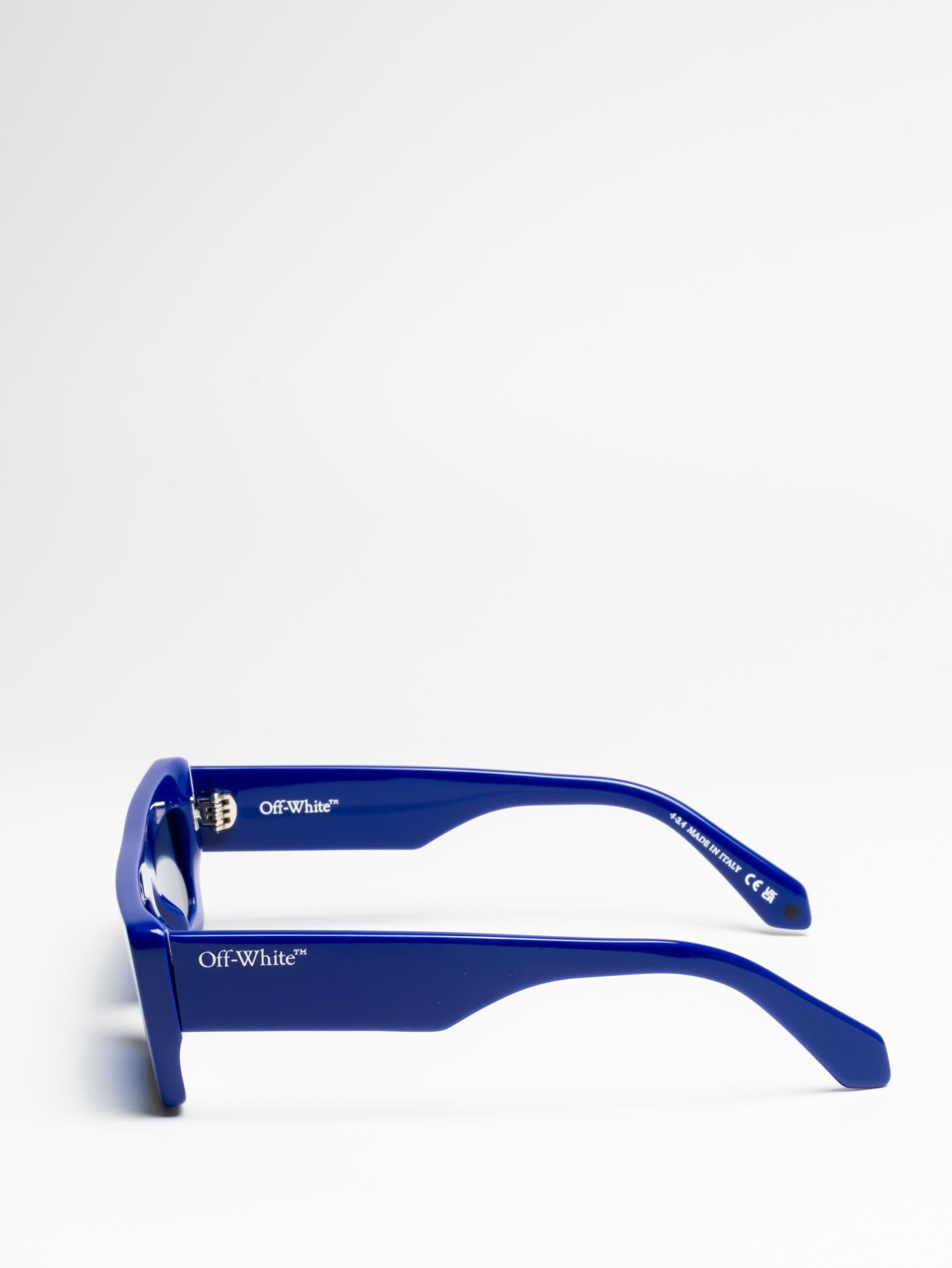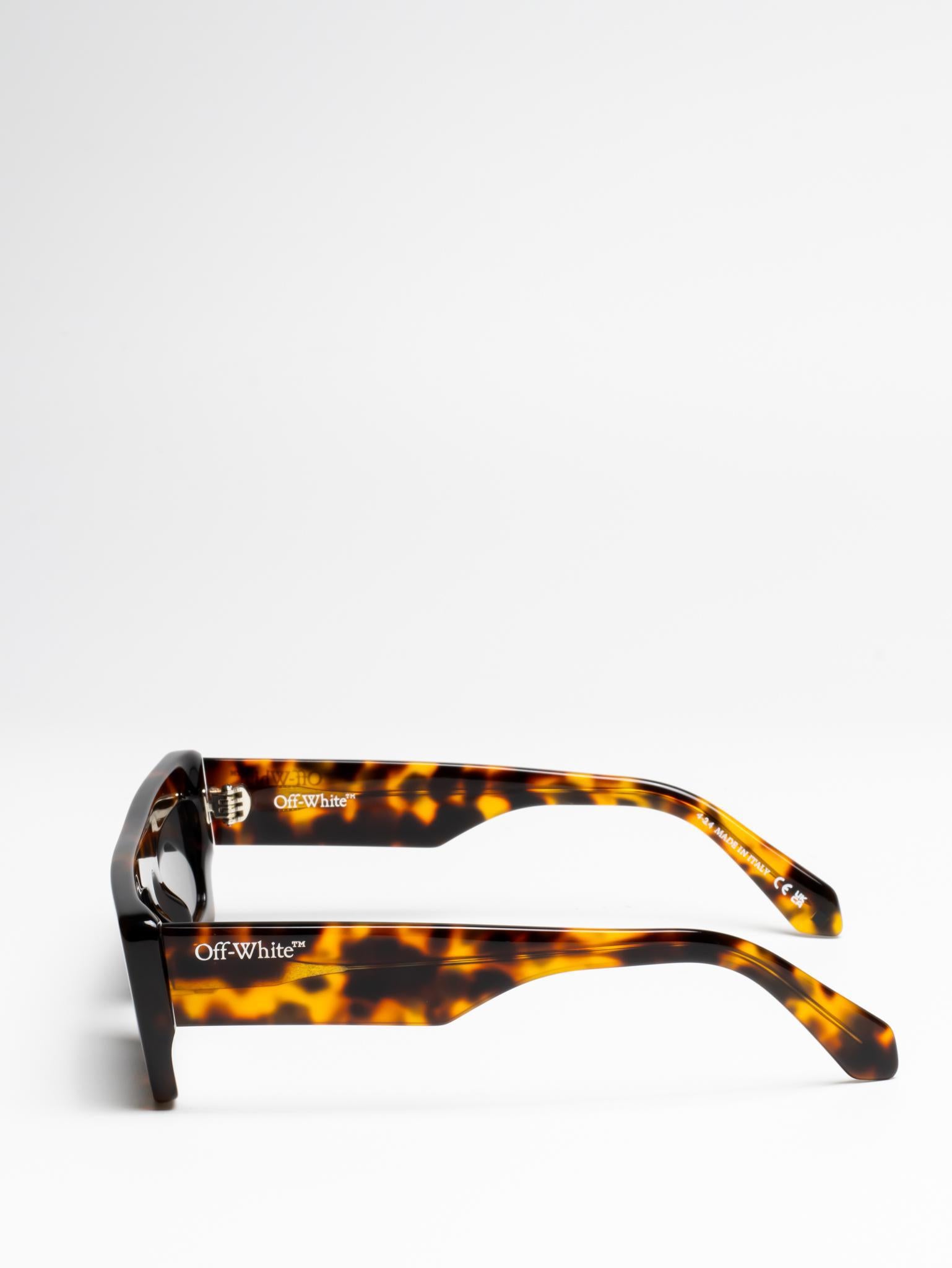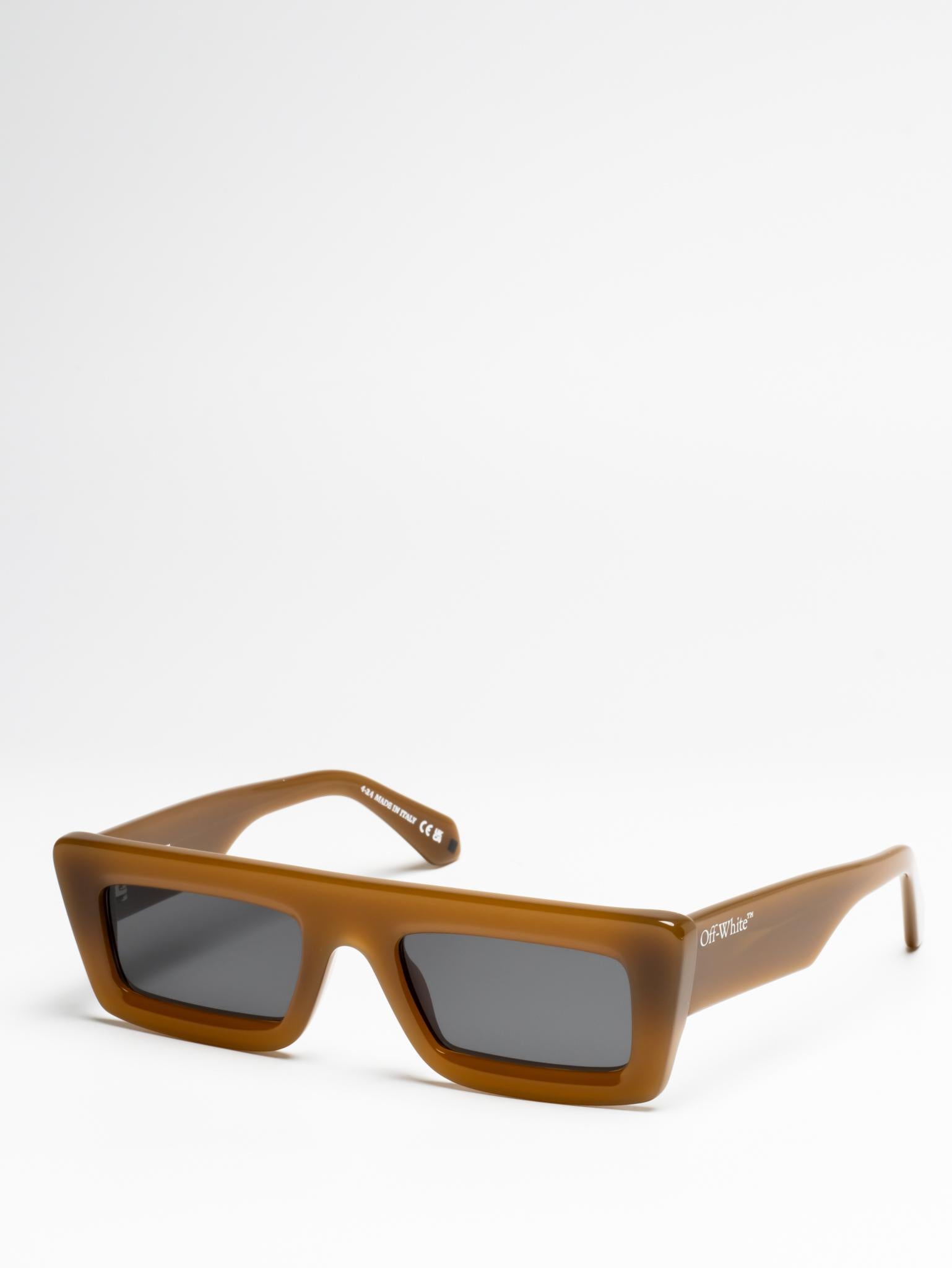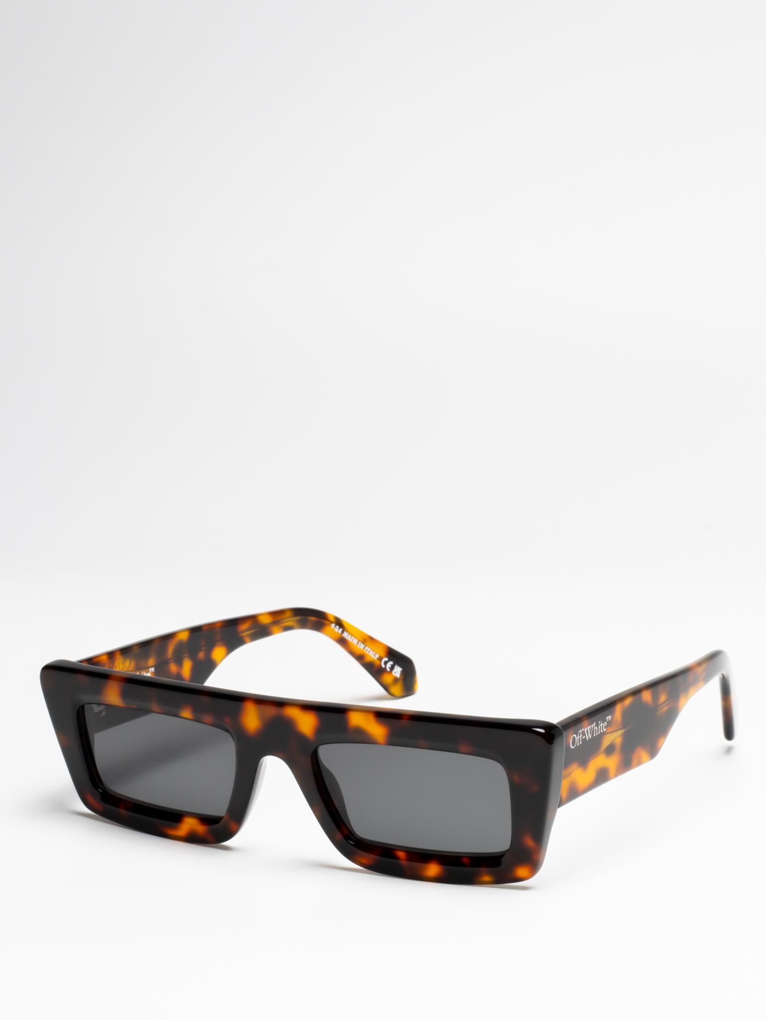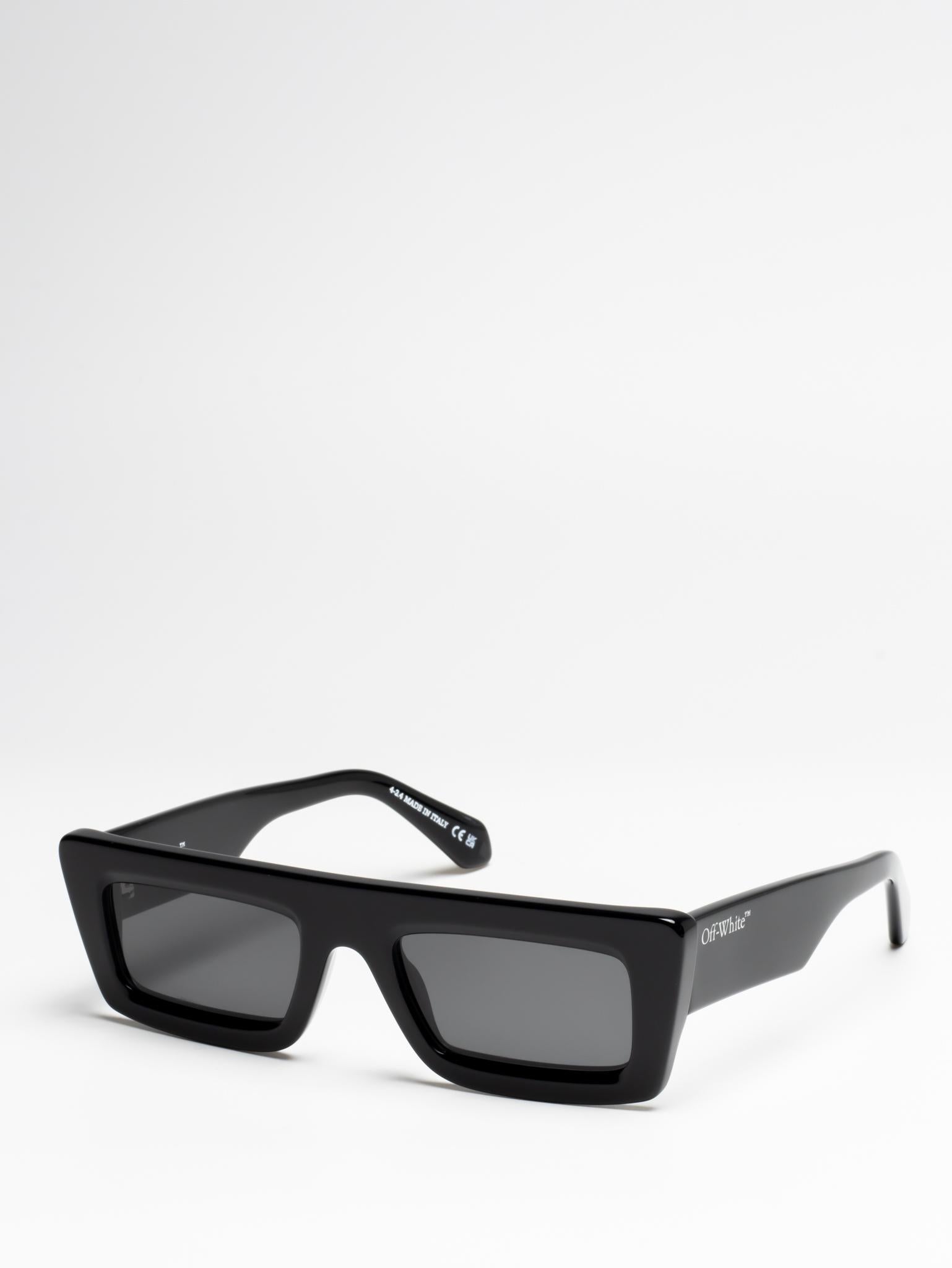 These acetate sunglasses feature a completely flat frame and a rectangular silhouette for an architectural look. They are completed with metal foil logos on the arms. Made in Italy.