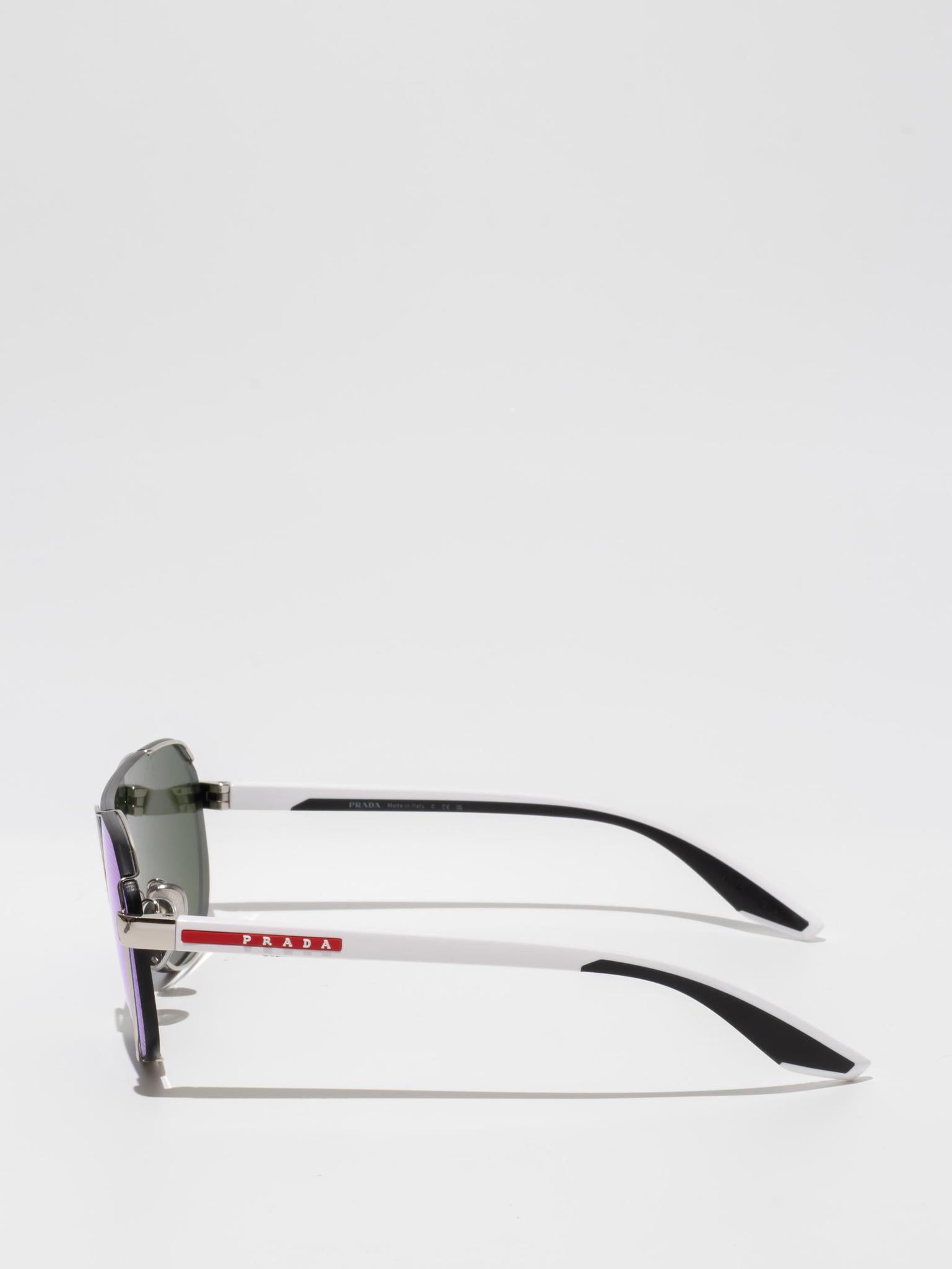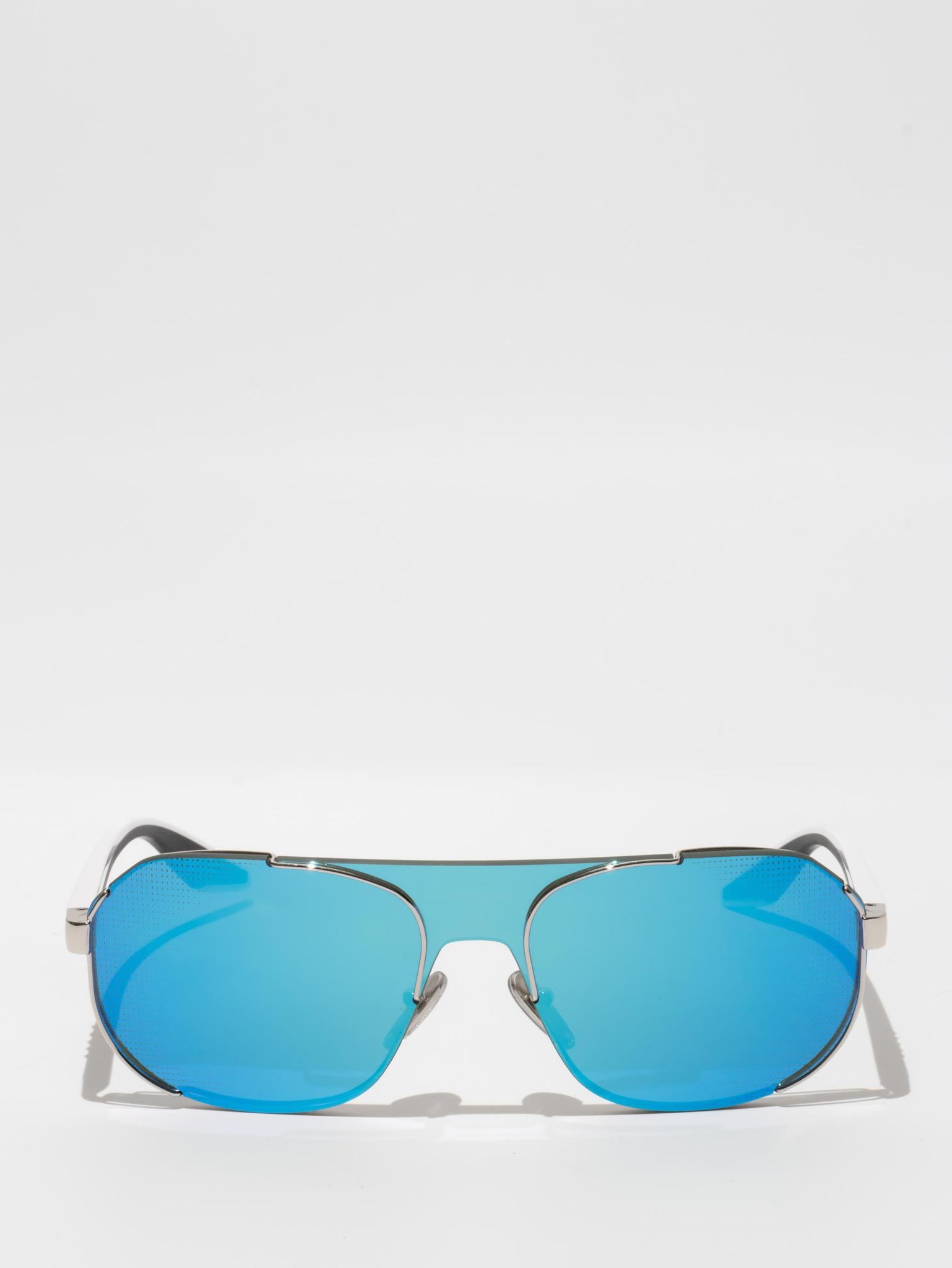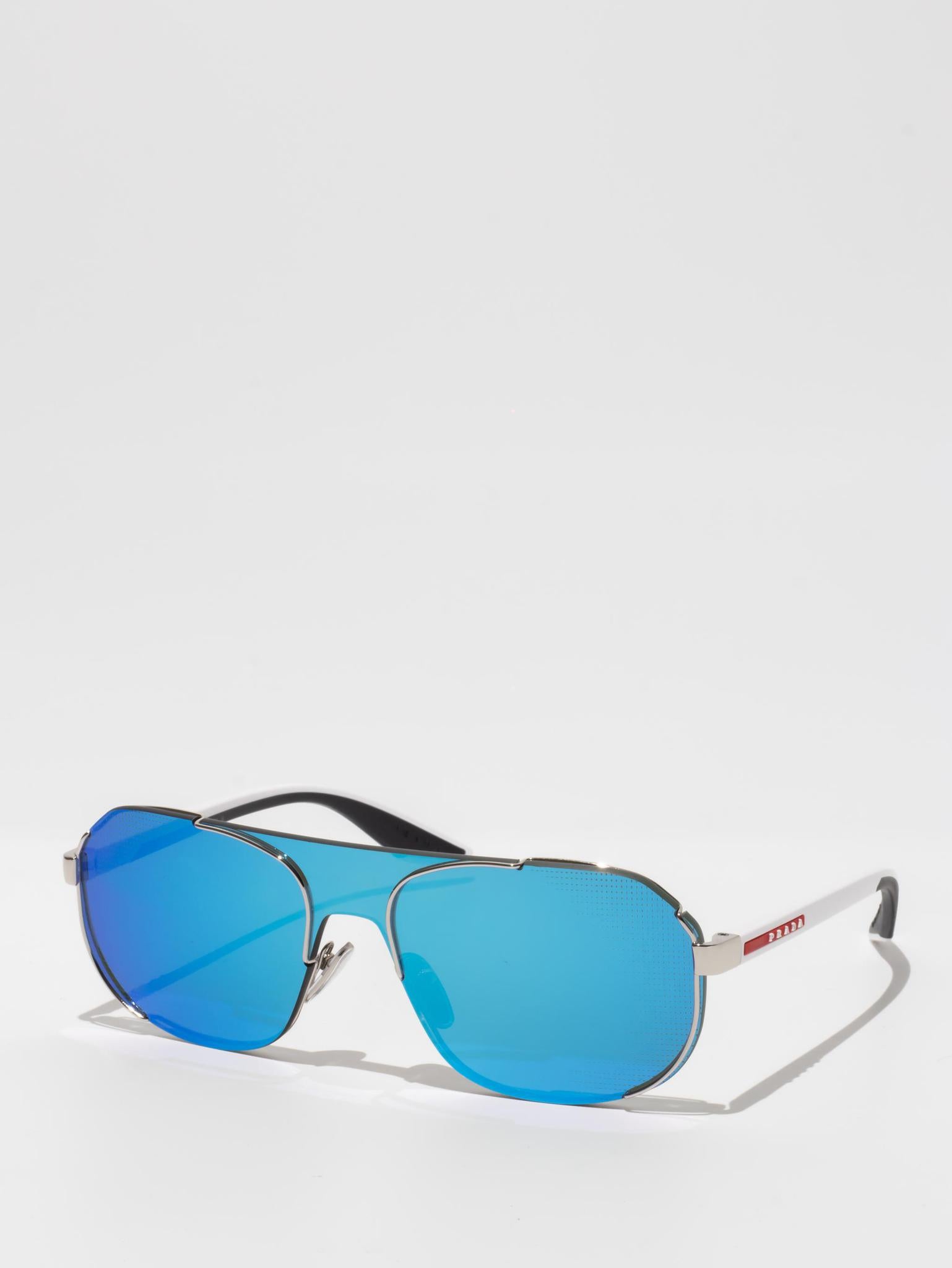 Sunglasses with a unique, uniform look. Crafted with a one-tone front with an aviator sillhouette, paired with a center piece with the iconic Prada logo. Temples are decorated with the iconic Linea Rossa.