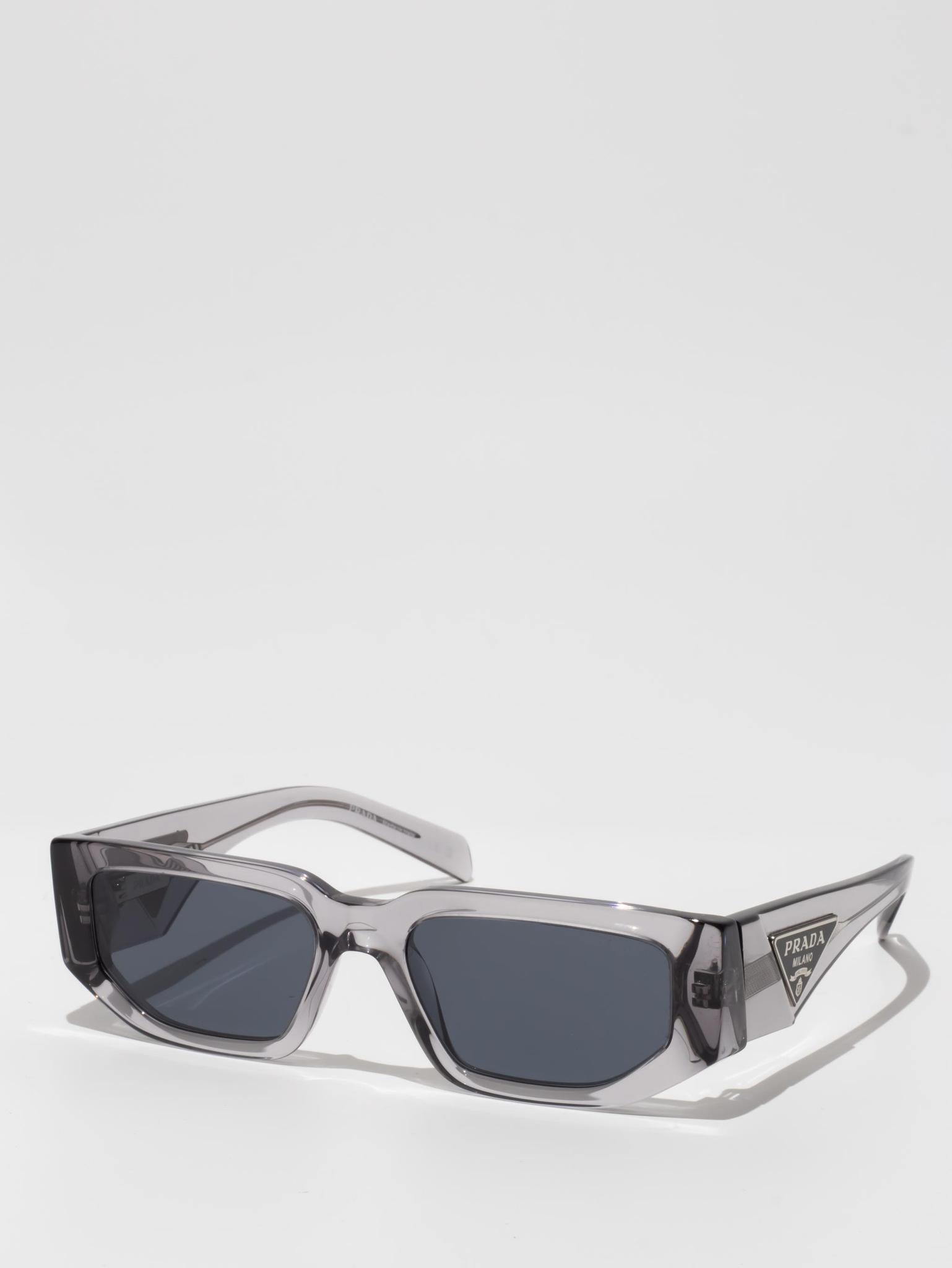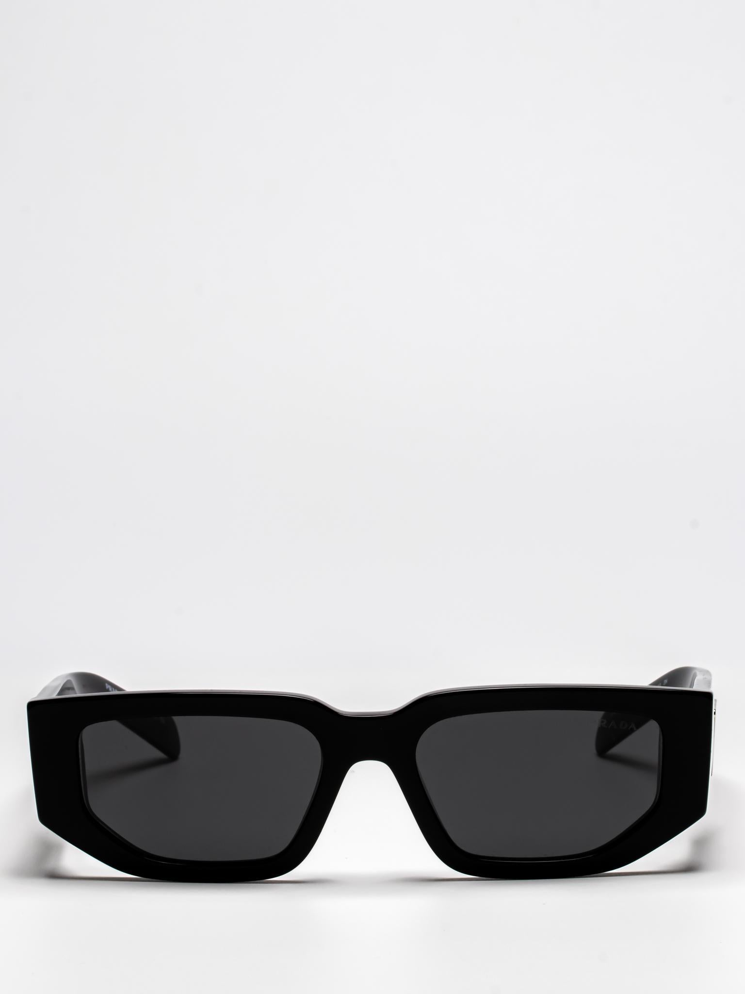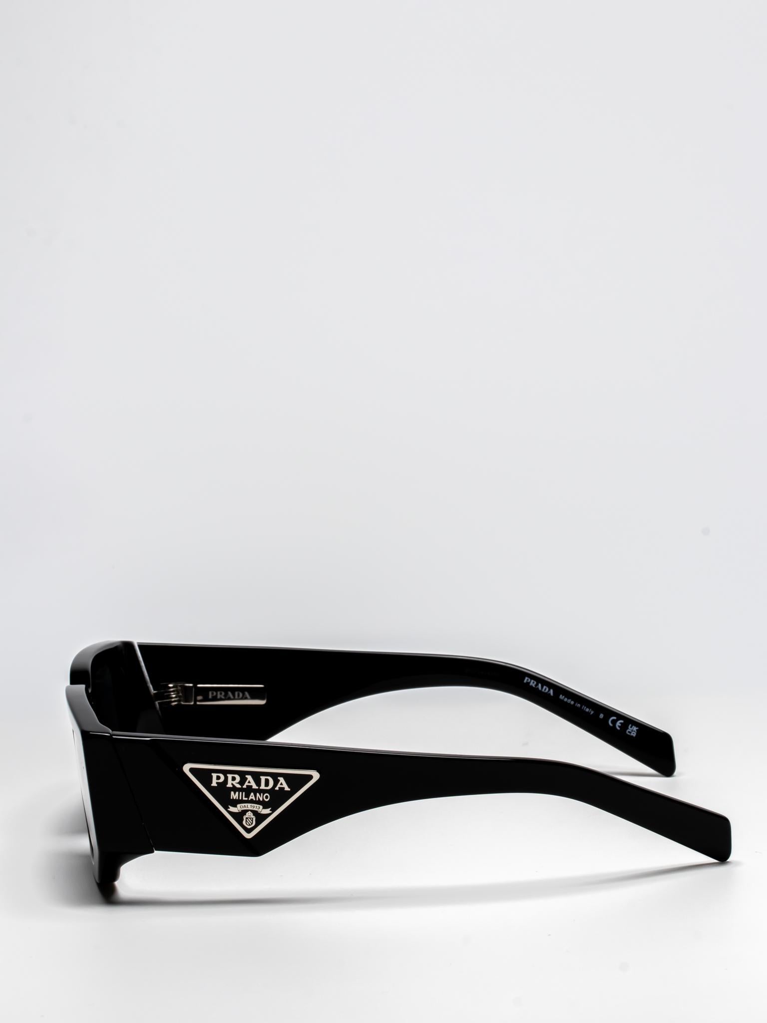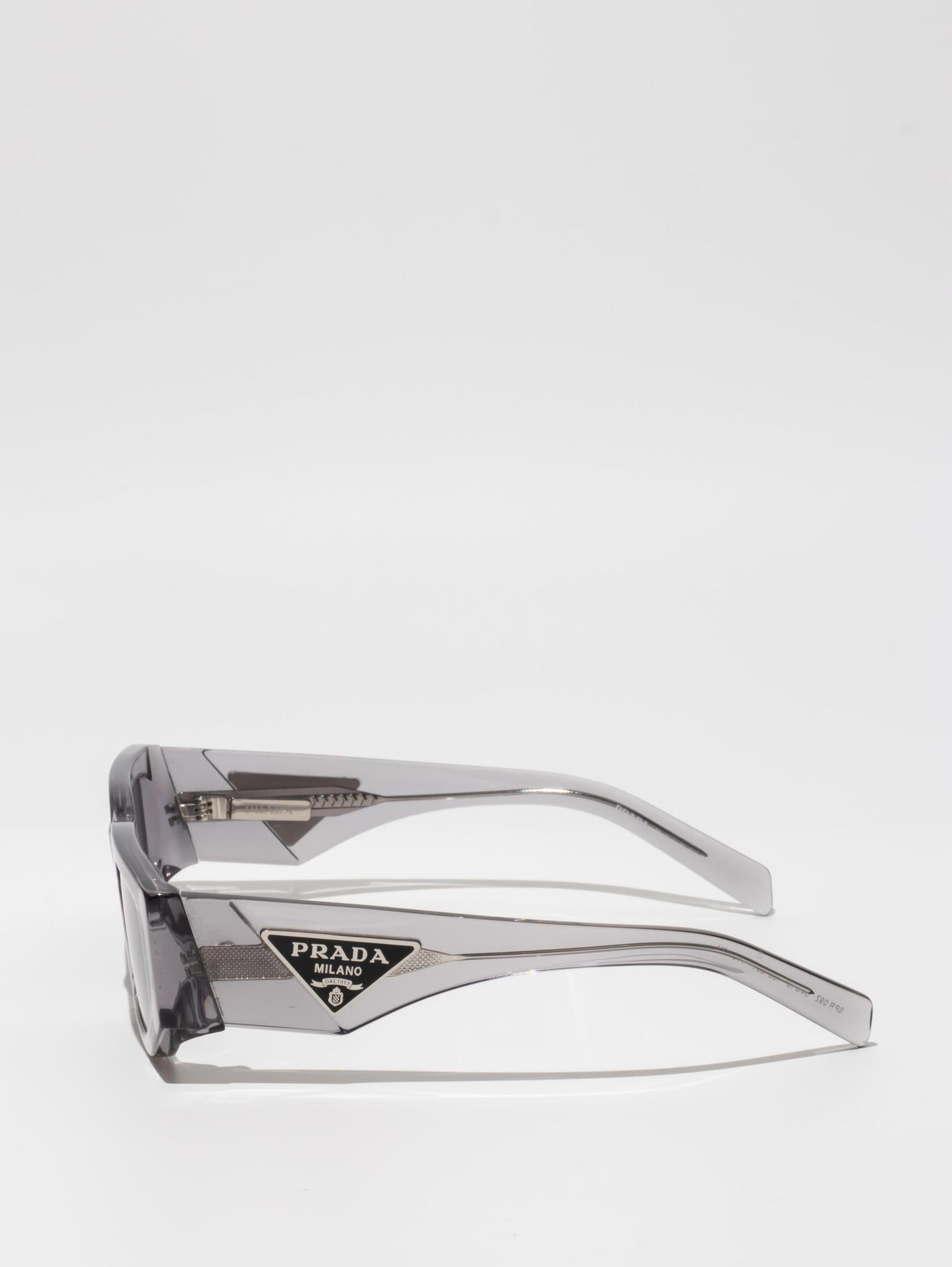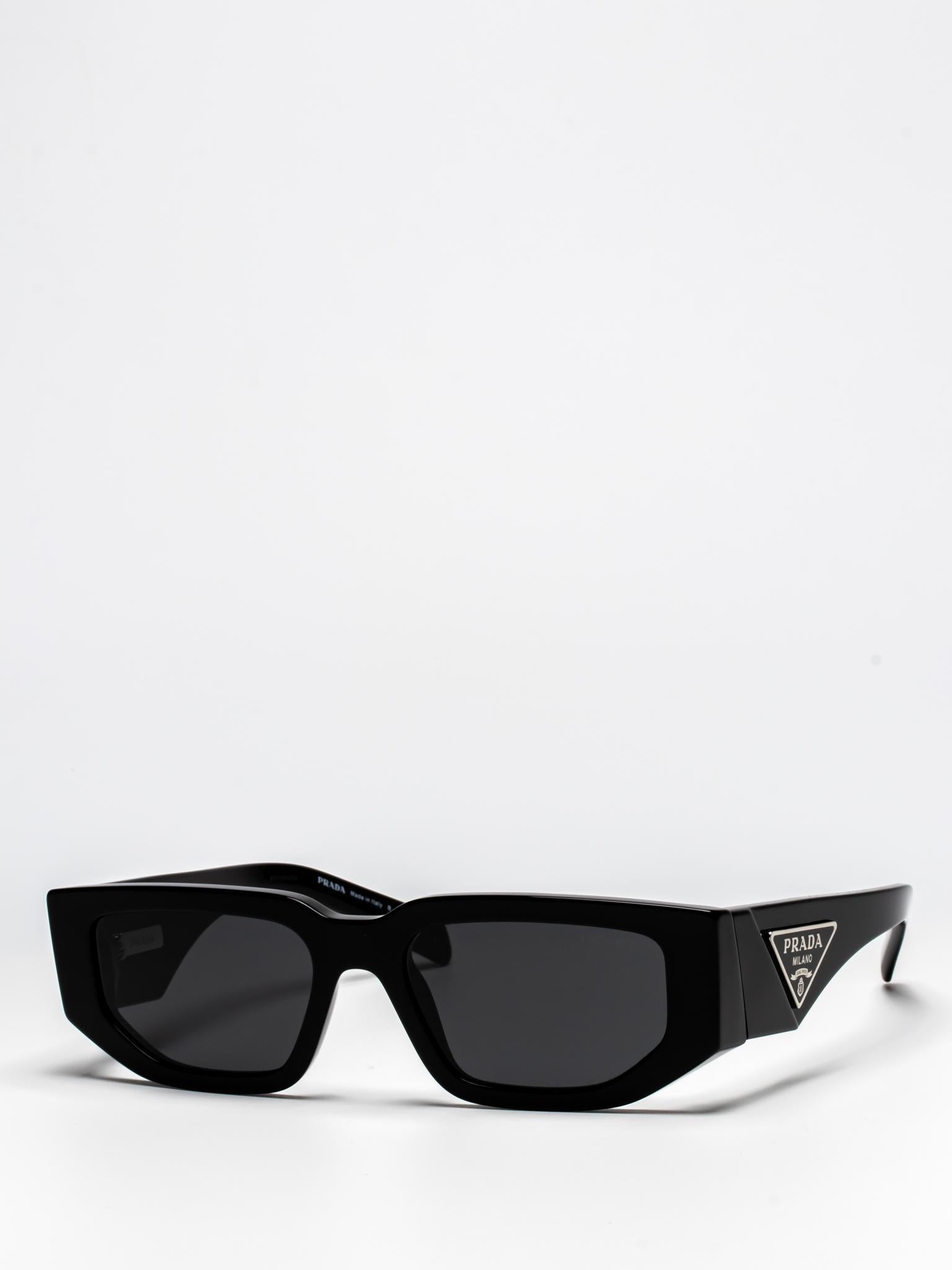 Rectangular acetate sunglasses with contemporary style. Angular rims define the frame and the chunky two-tone temples are decorated with an exclusive metal plaque that portrays Prada's iconic triangle logo.