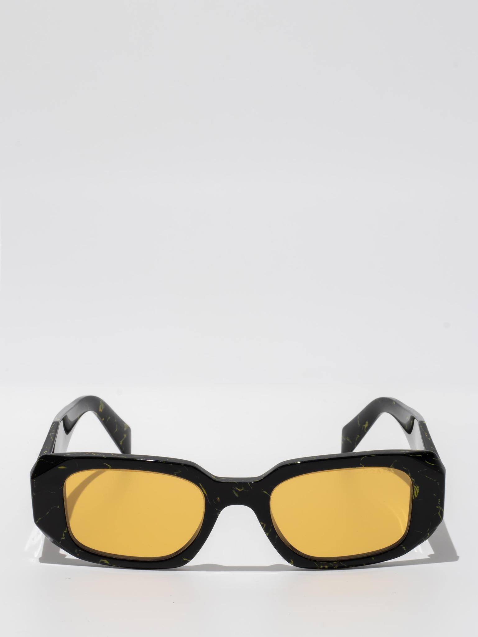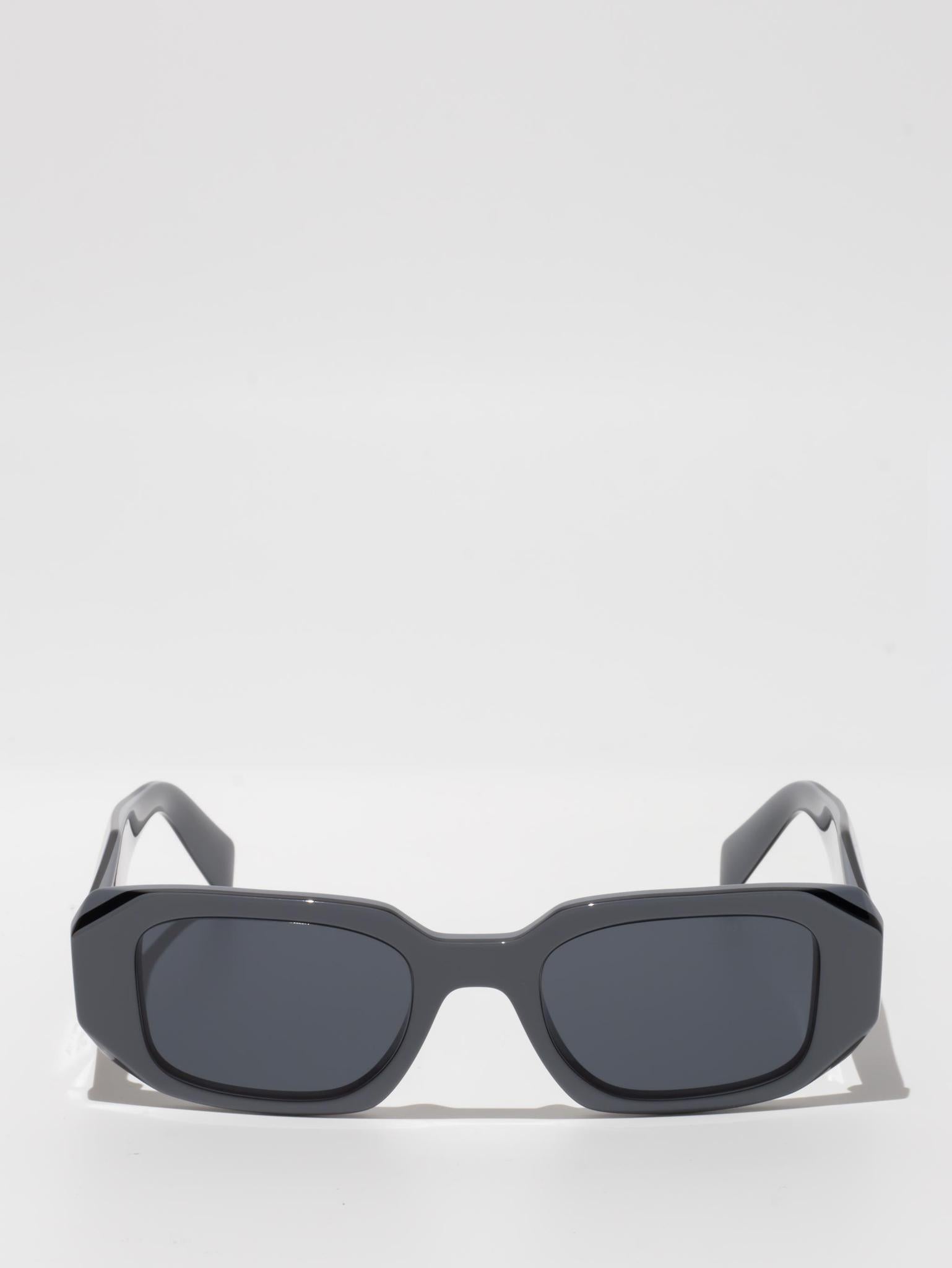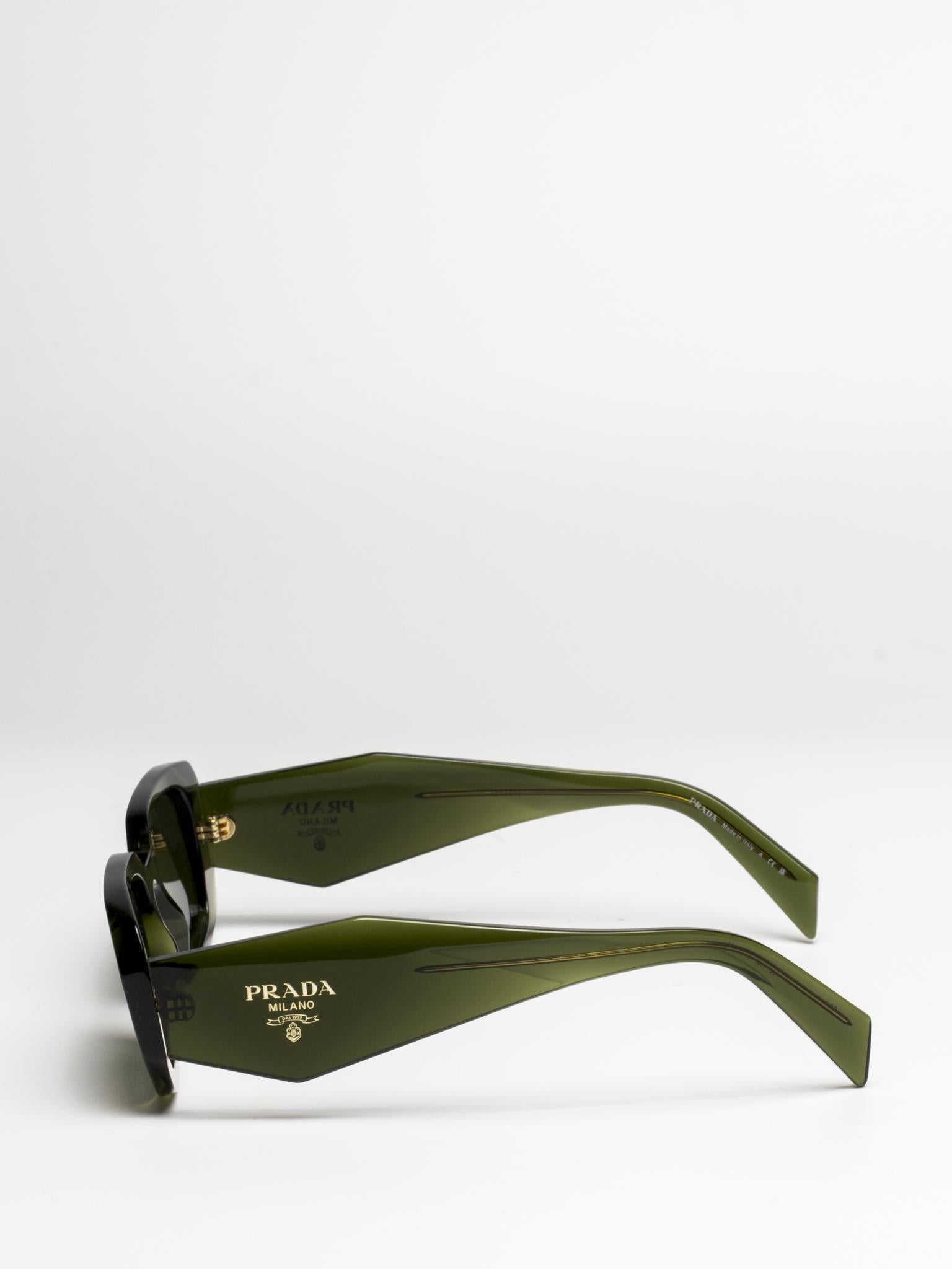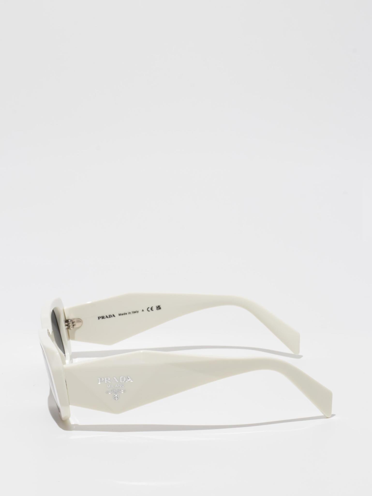Acetate sunglasses with an oversized, geometric design. The bold frame front has an avant-garde silhouette defined by the extreme angled cut of the outer corners. The three-dimensional design of the temples is decorated with an iconographic interpretation of the traditional Prada triangle logo.
