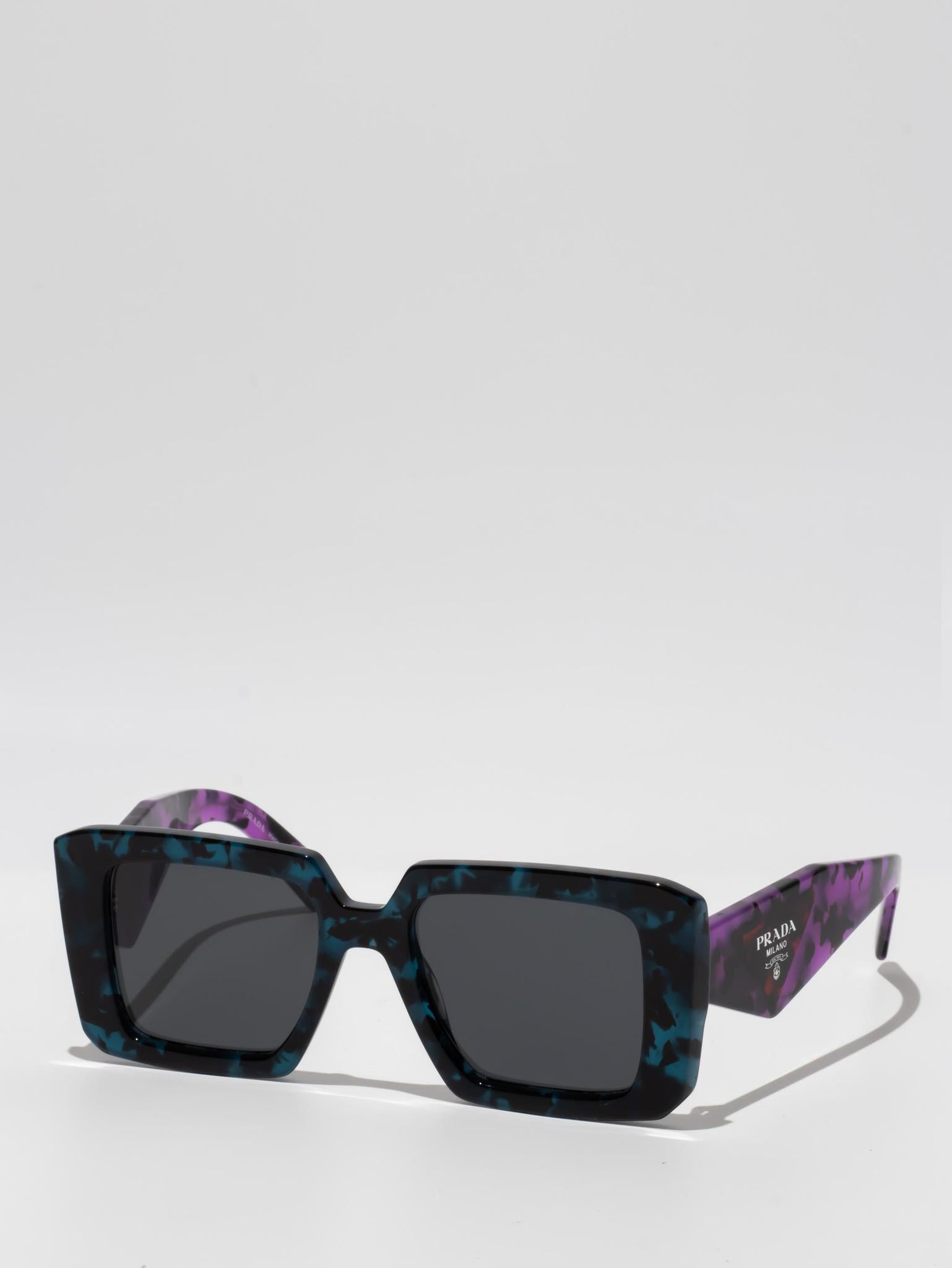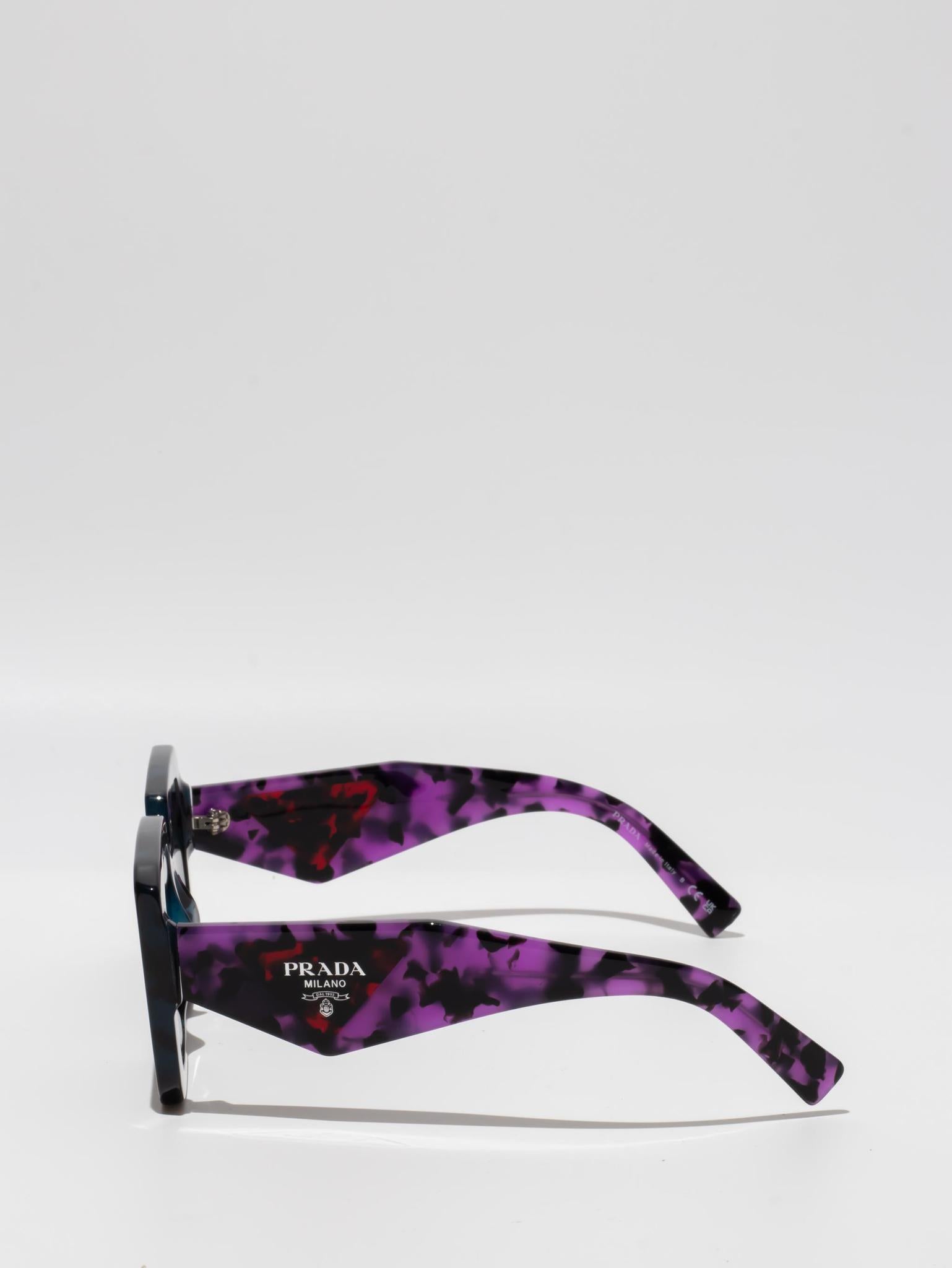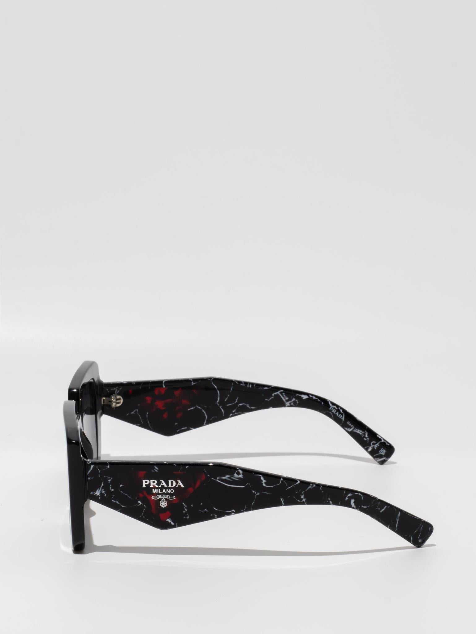 Oversized acetate sunglasses with chunky volumes. Bold geometric lines and strong Havana nuances define this frame characterized by the square front. The geometric temples are embellished with an iconographic interpretation of the traditional Prada logo in a contrasting color.