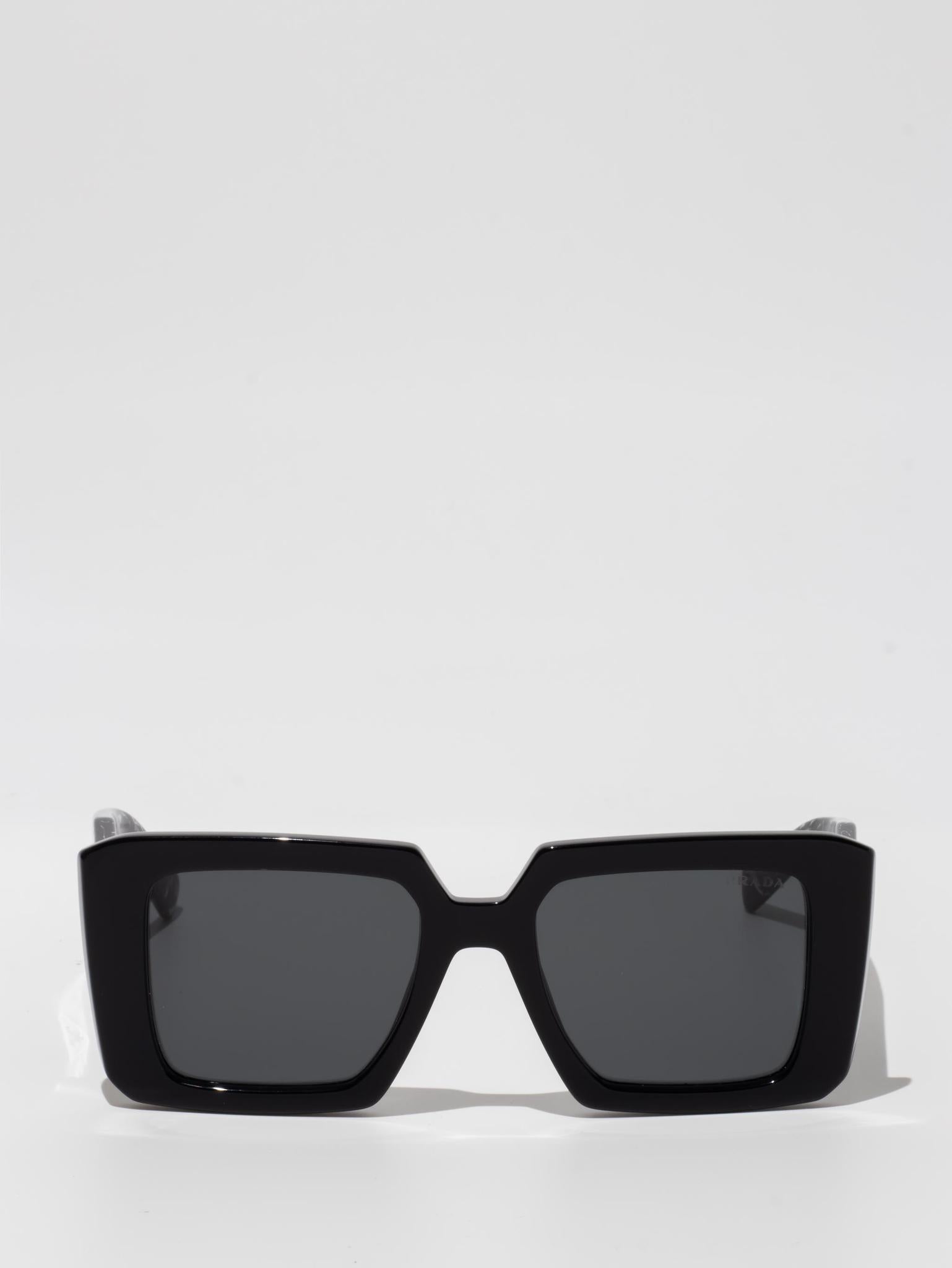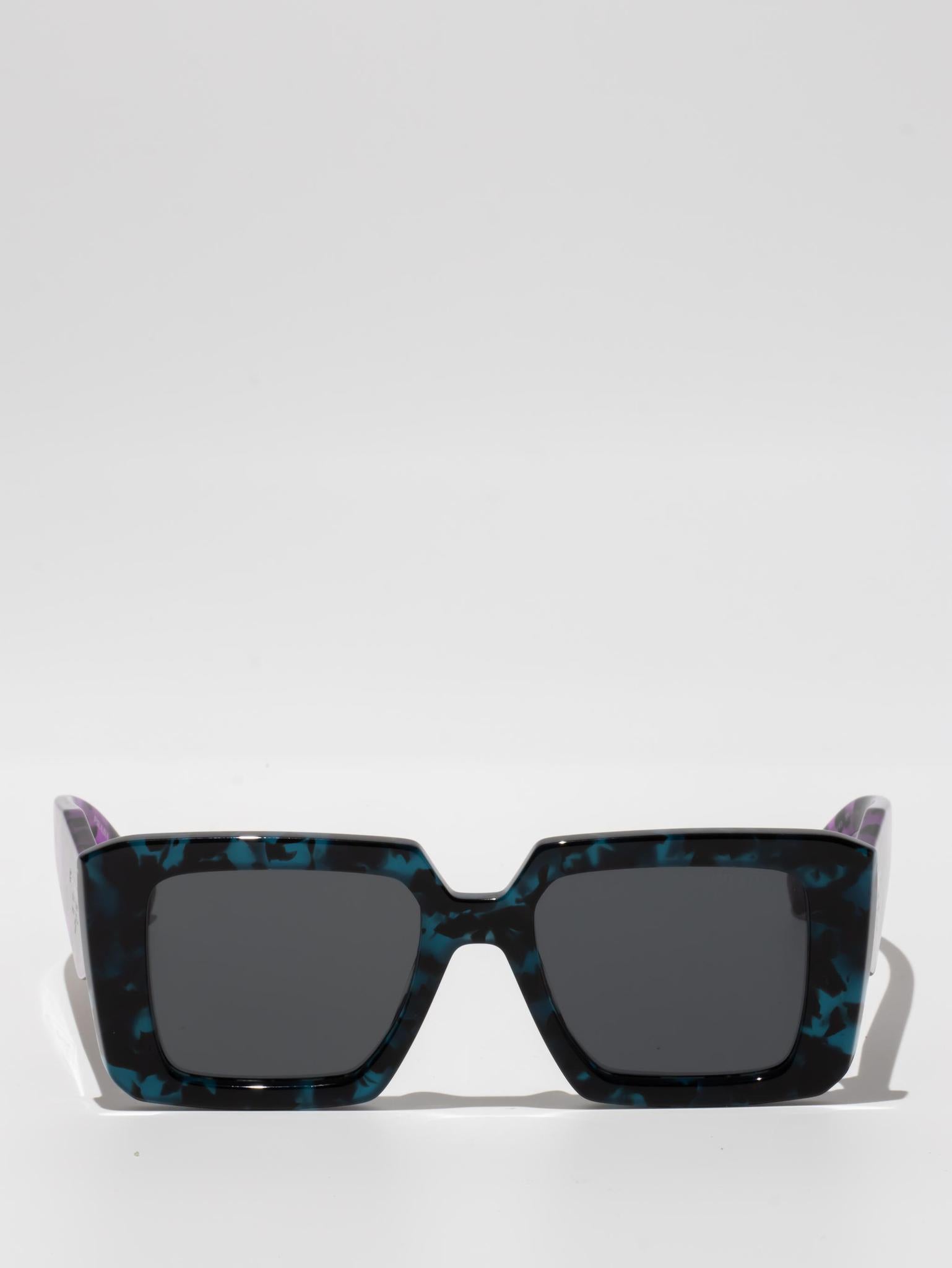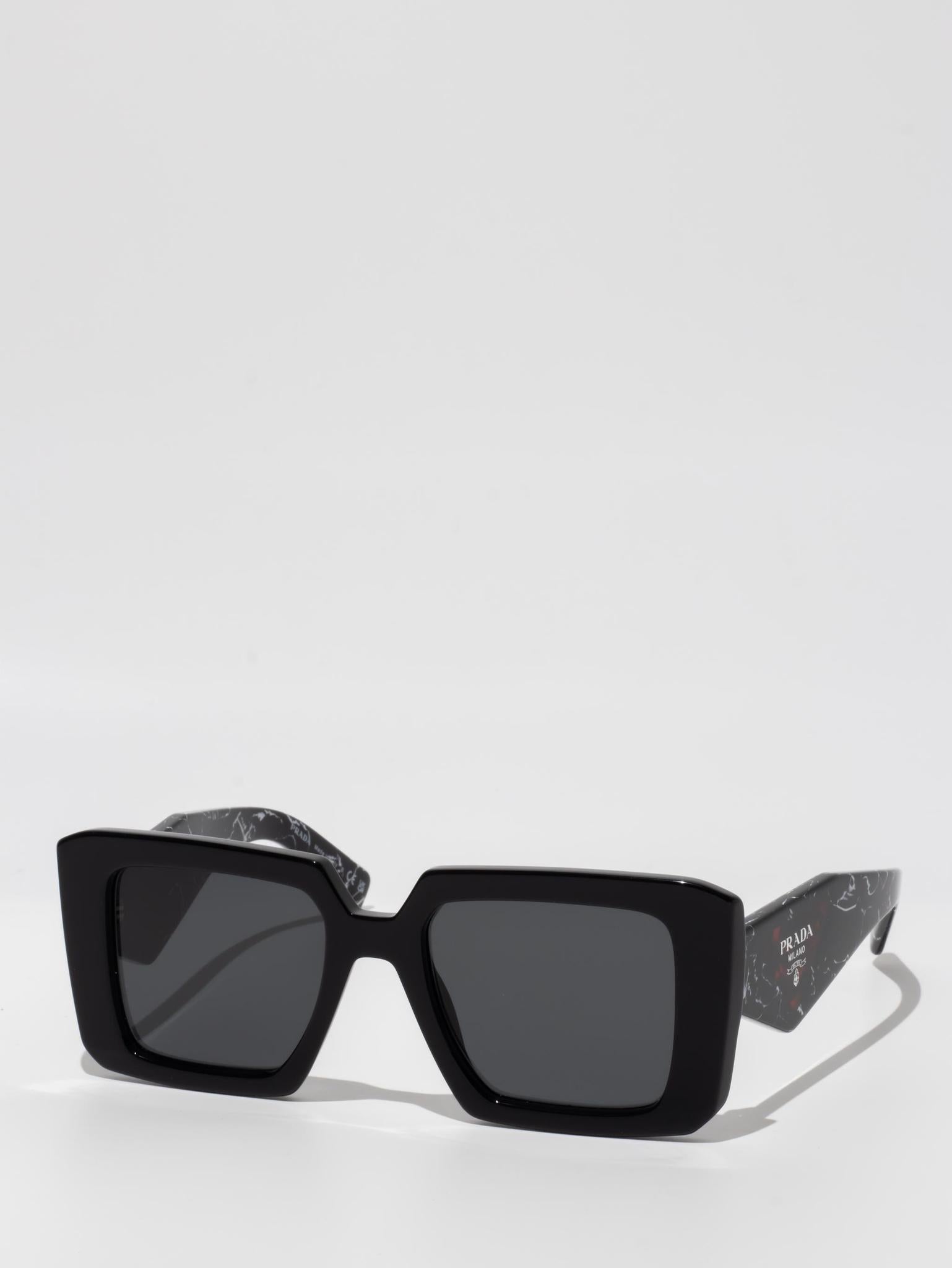 Oversized acetate sunglasses with chunky volumes. Bold geometric lines and strong Havana nuances define this frame characterized by the square front. The geometric temples are embellished with an iconographic interpretation of the traditional Prada logo in a contrasting color.
