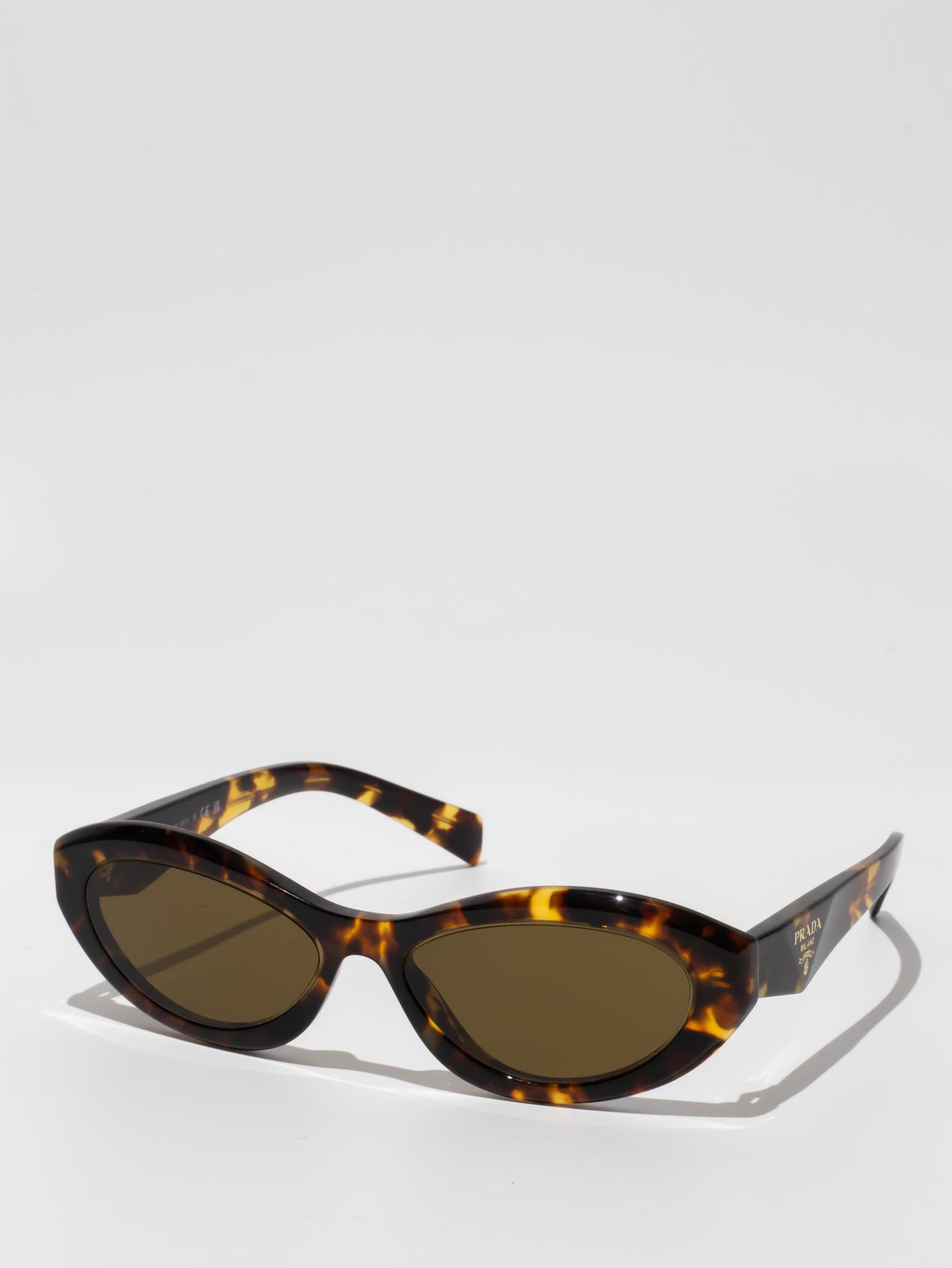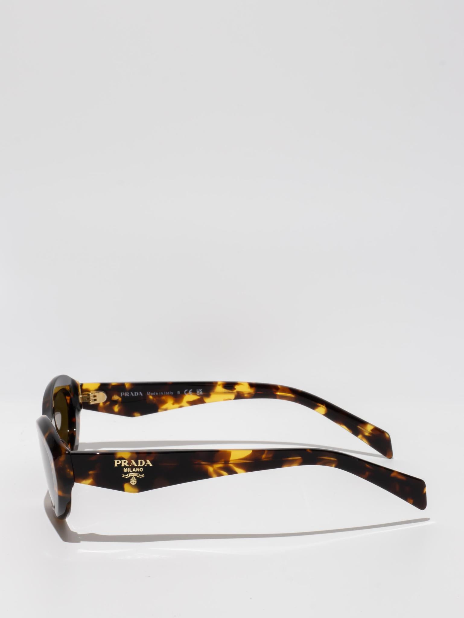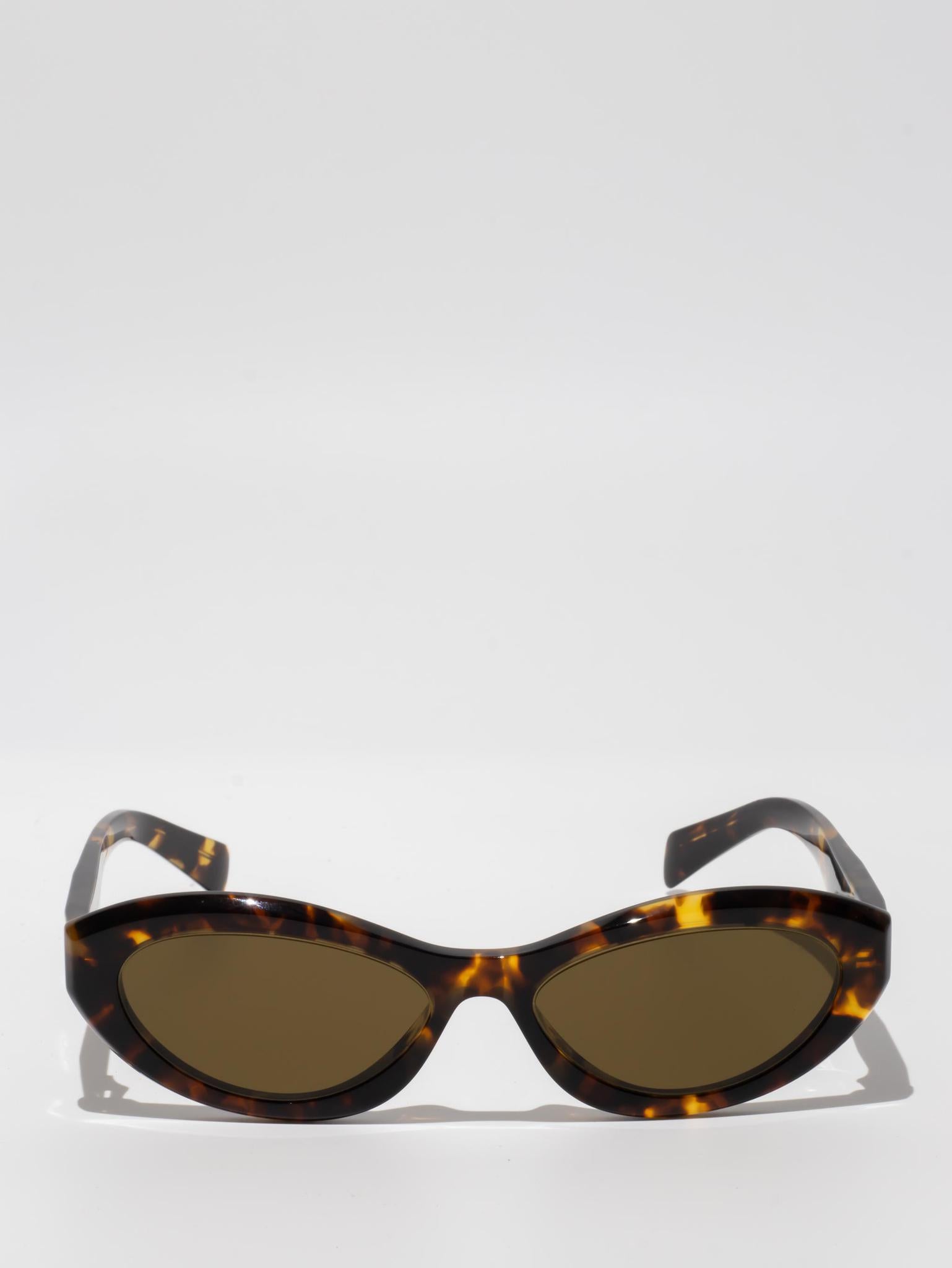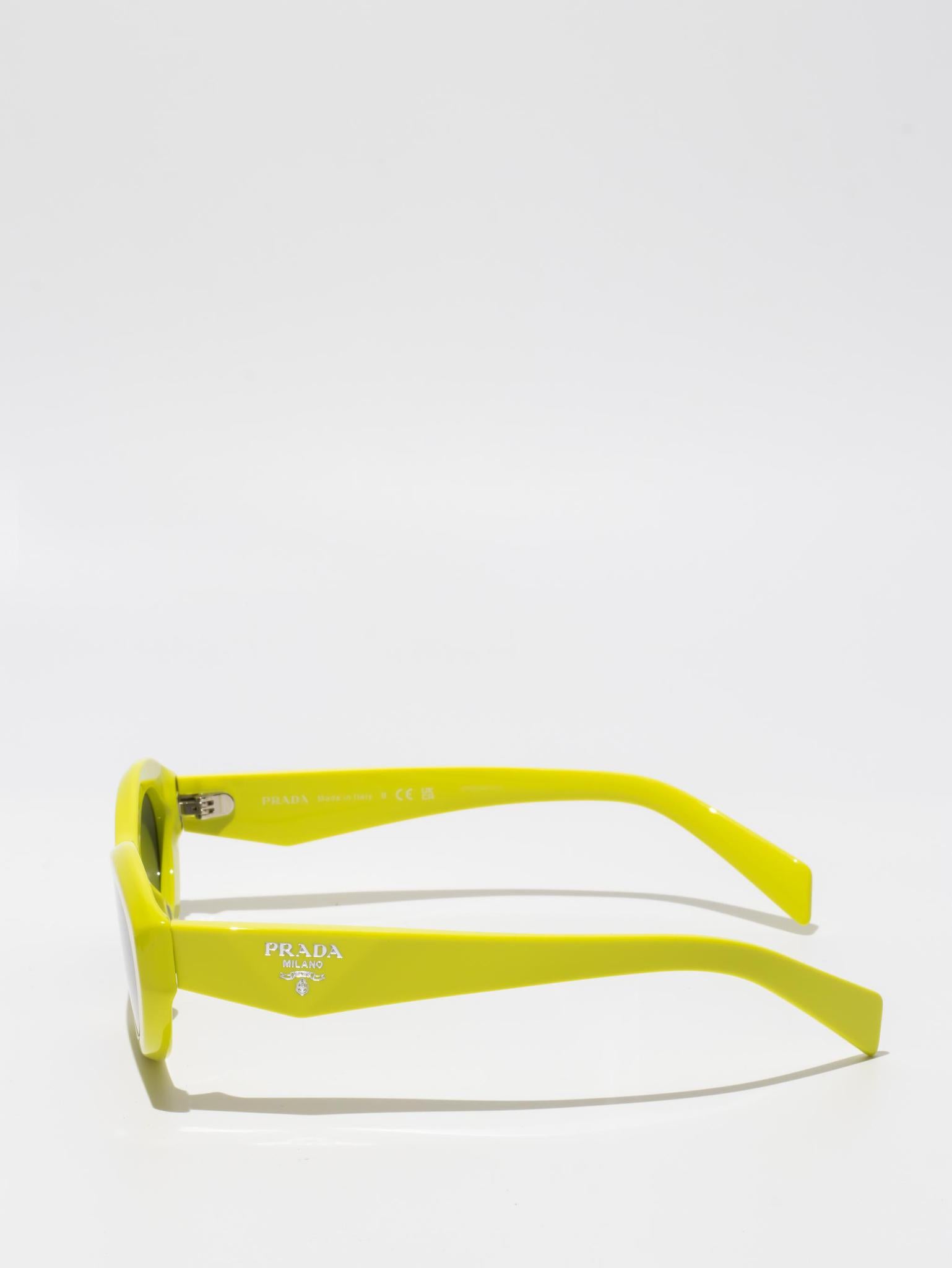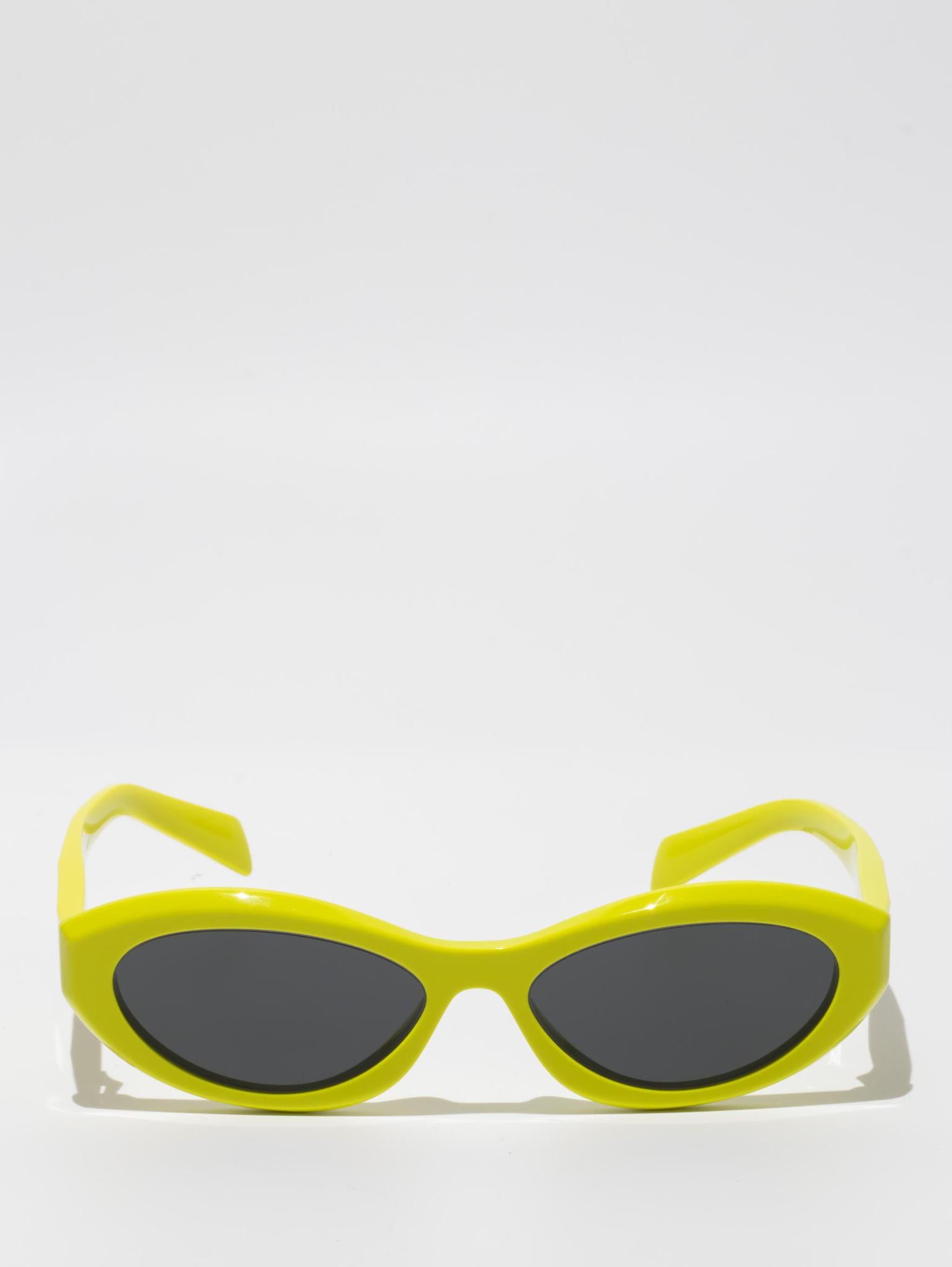 Sunglasses with an acetate frame featuring sinuous and slightly beveled rims expressing bold femininity. The thin temples are emphasized by a refined three-dimensional element that iconographically depicts the Prada triangle logo.