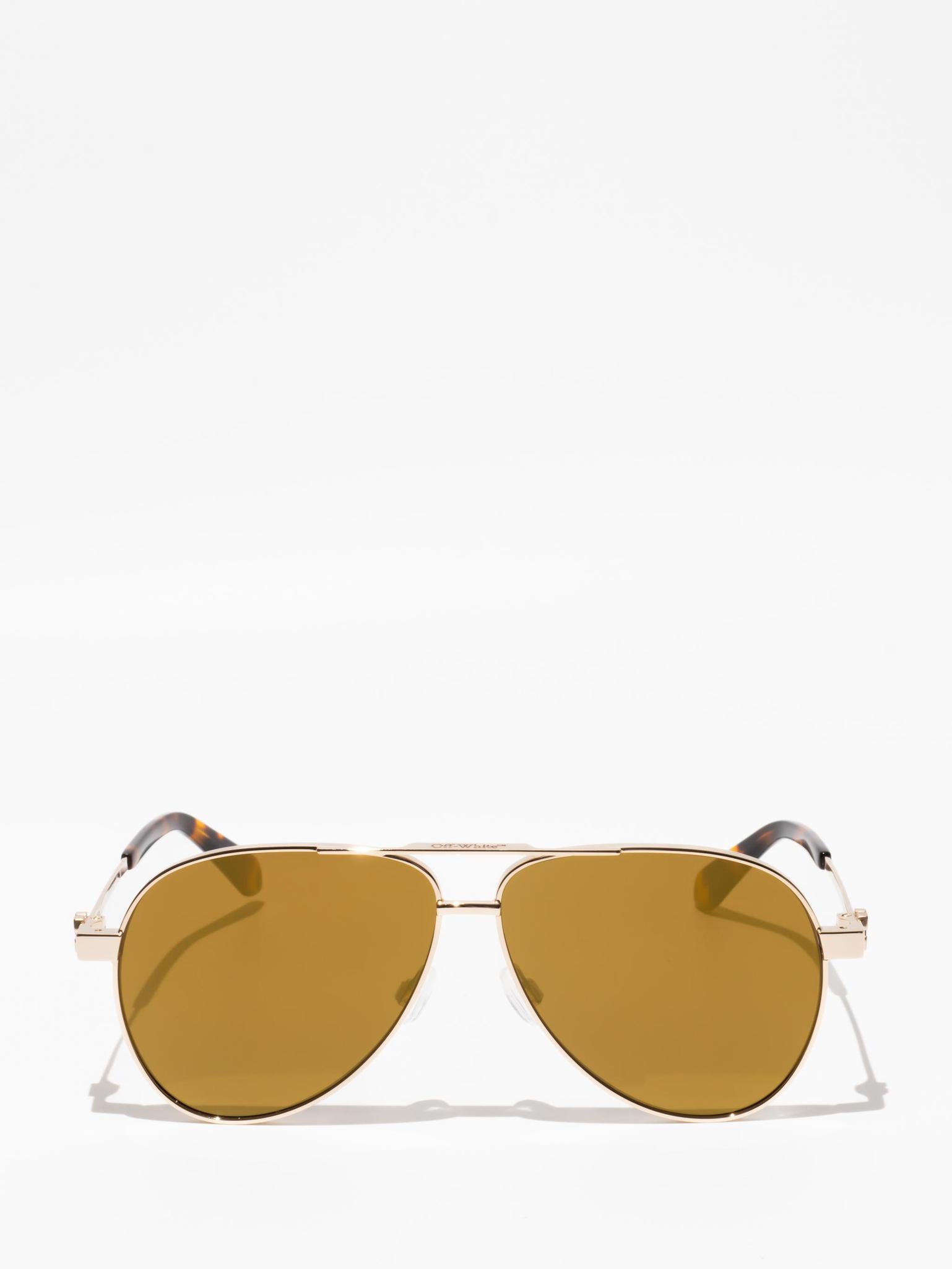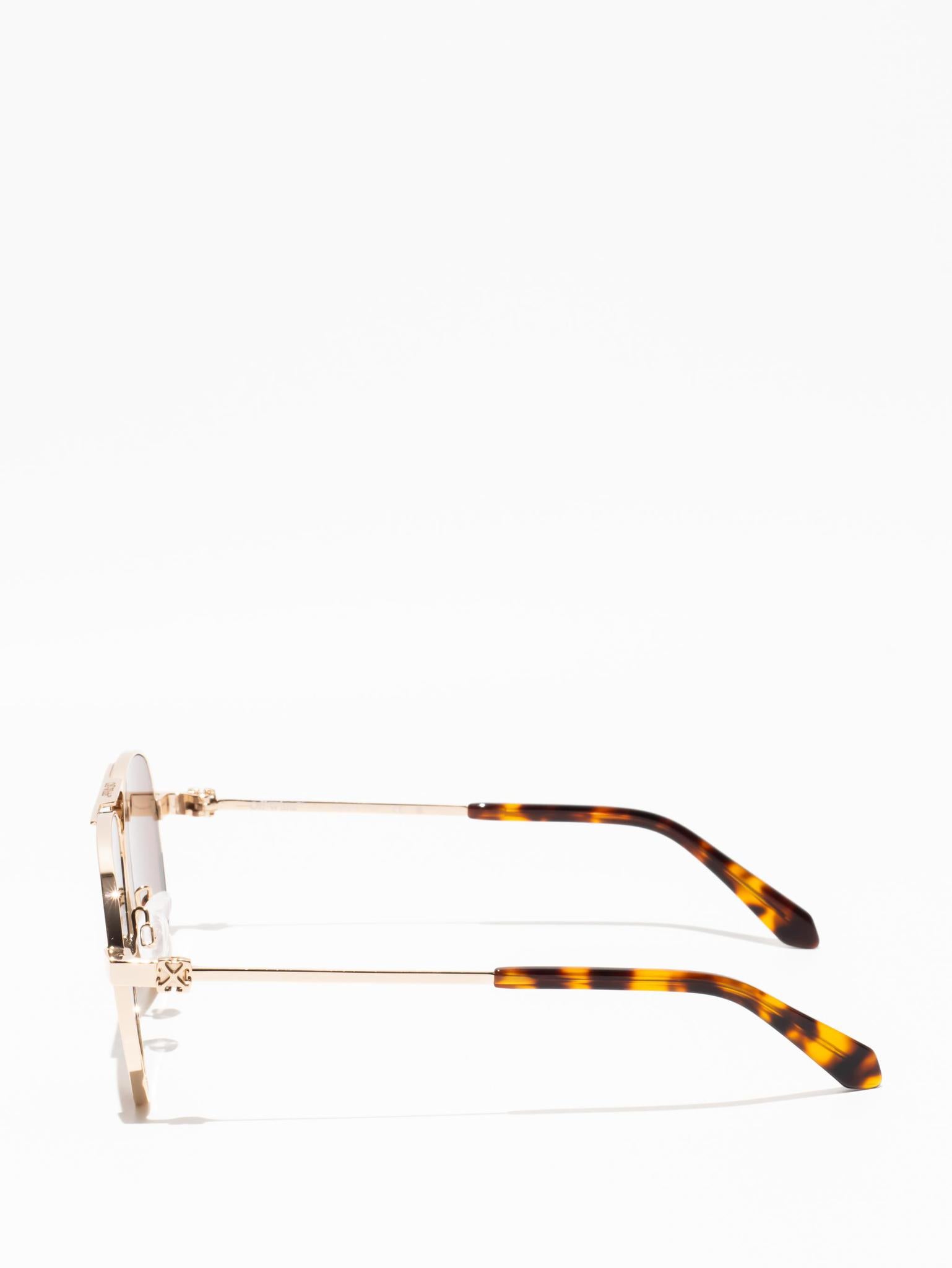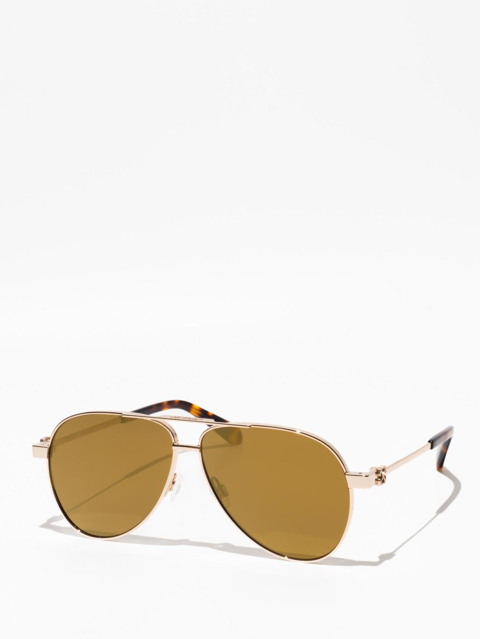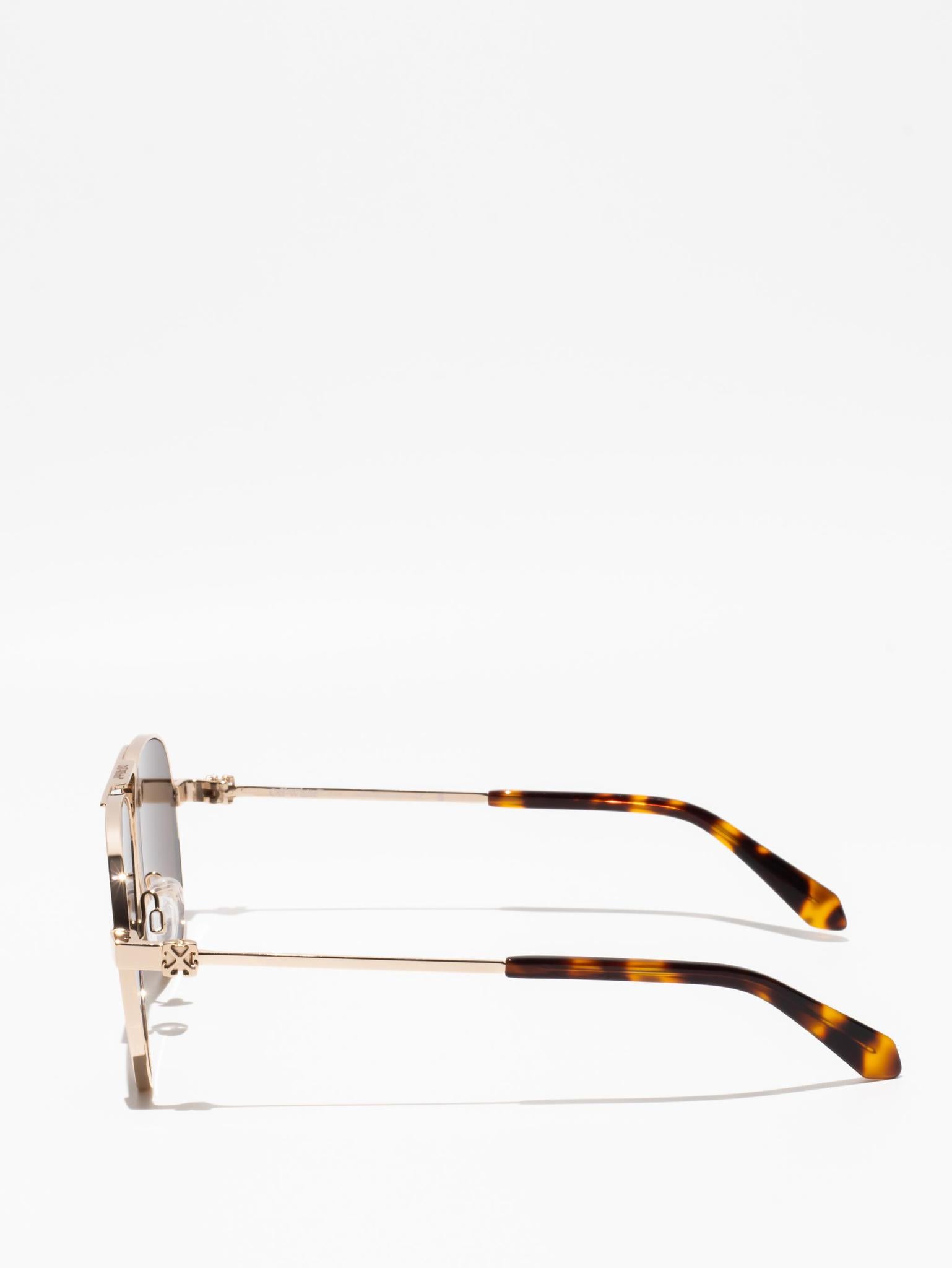 These metal-framed sunglasses feature a teardrop, pilot-inspired silhouette with a double bridge and silicone nose pads. The arms host arrow logo plaques and acetate tips for comfort.