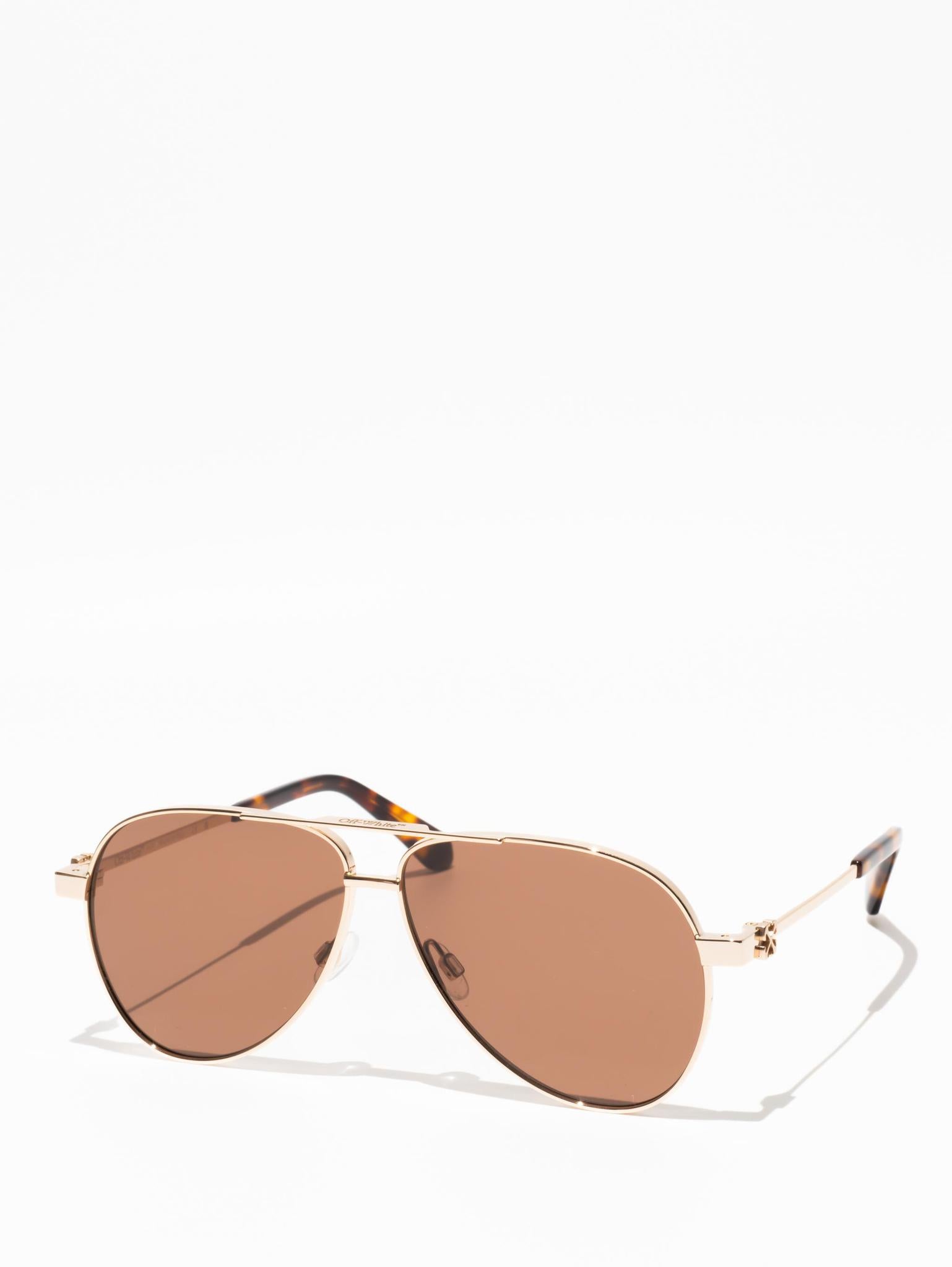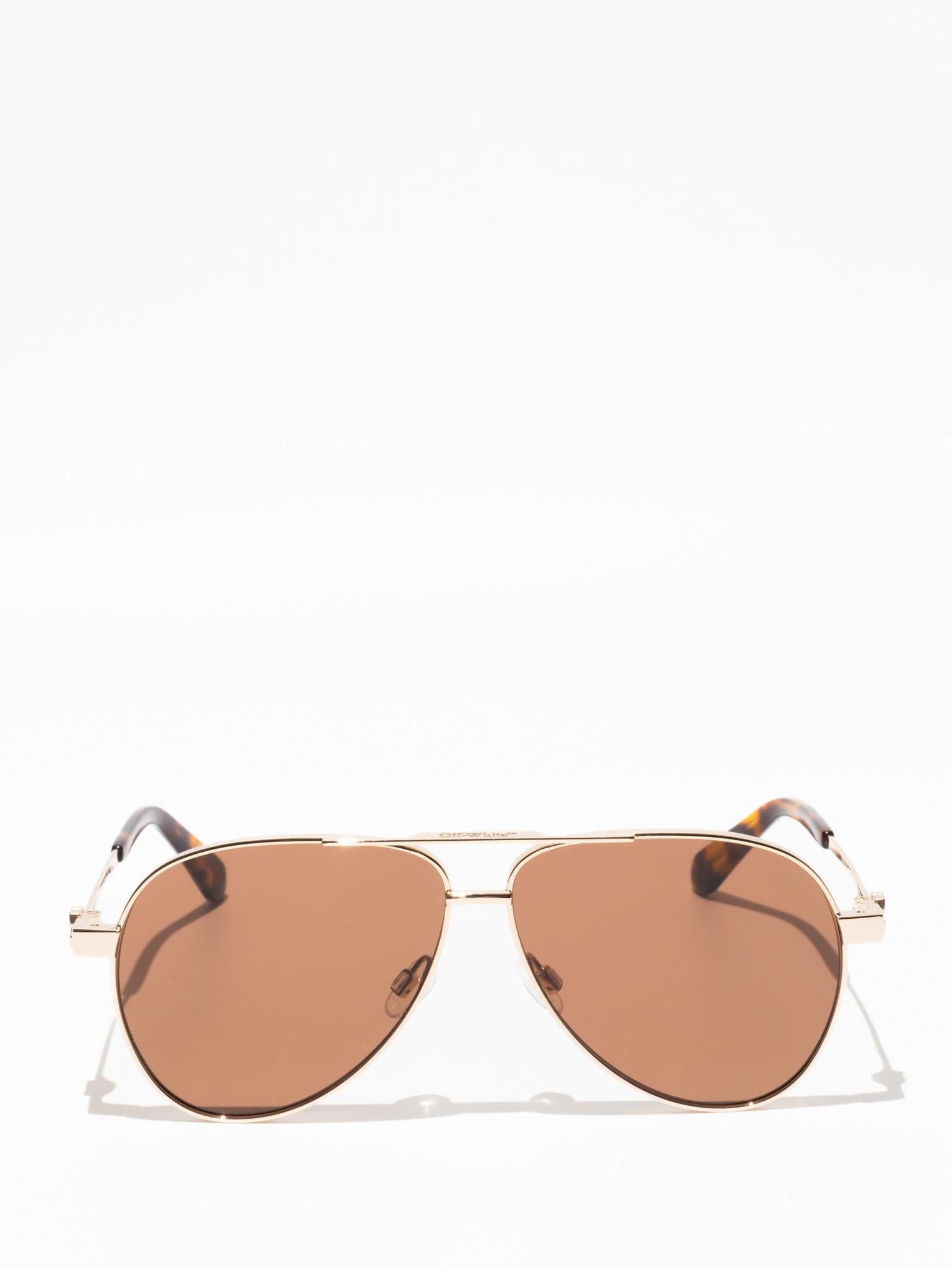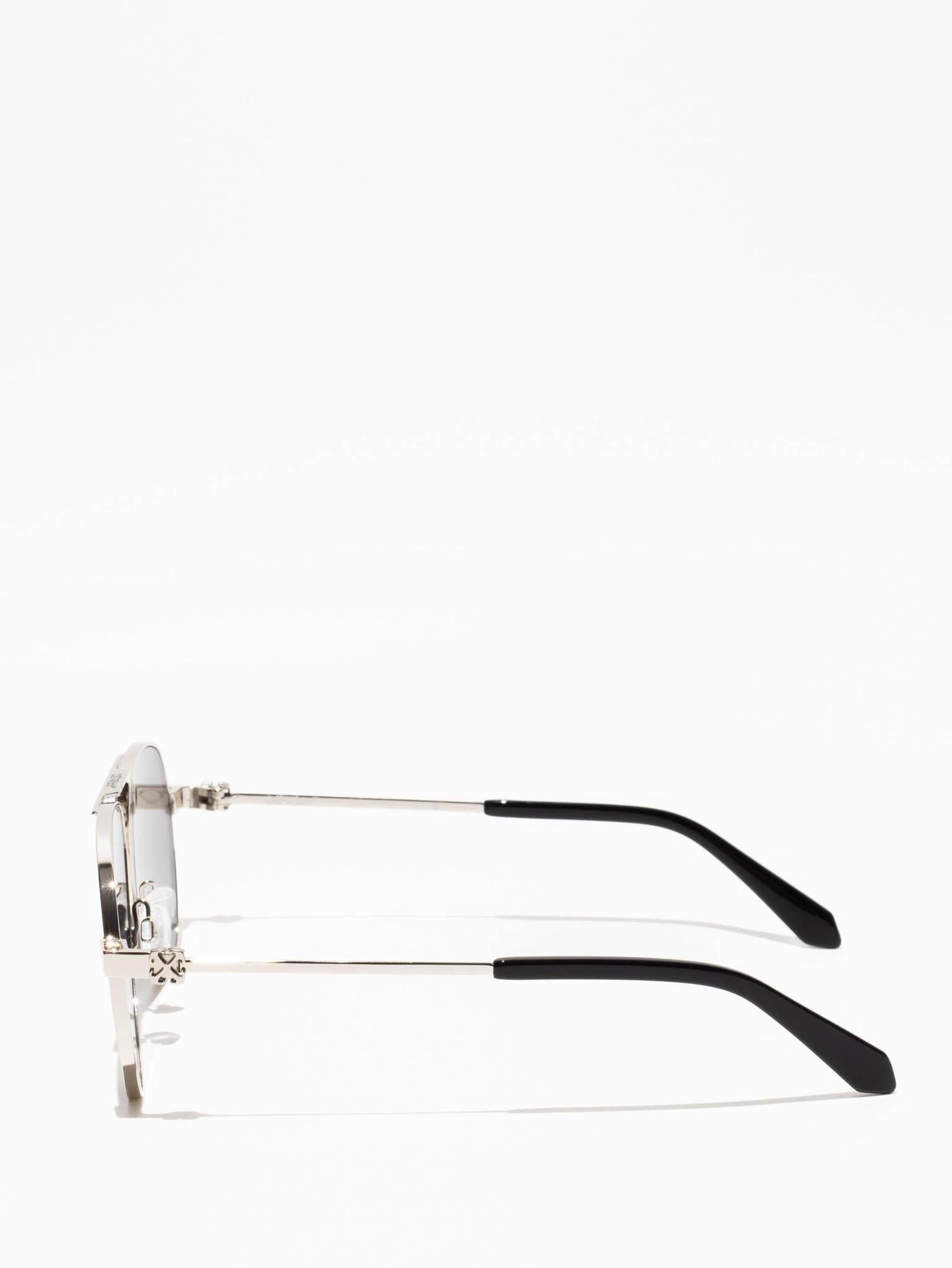 These metal-framed sunglasses feature a teardrop, pilot-inspired silhouette with a double bridge and silicone nose pads. The arms host arrow logo plaques and acetate tips for comfort.
