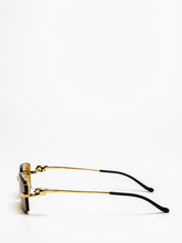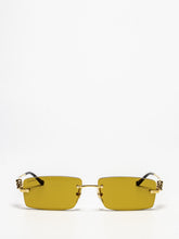 Unisex contemporary narrow rectangular shape with a rimless construction. Modern and contemporary temples with dynamic sculptured Panthère head and body on metal temples. Precious gold finish combined with colourful lenses to guarantee a contemporary look. Acetate temple tips to ensure comfortability.