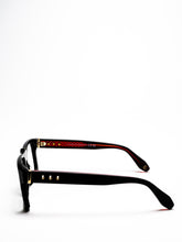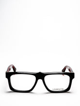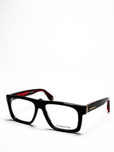 Louboutin glasses for men model LB5006 featuring shiny black full-rim acetate frame with transparent demo lenses.