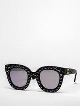 Gucci Cat Eye Iconic shape is refreshed with an eclectic twist: front and temples feature a zebra motif. Prominent Gucci Interlocking logo on temples. Zebra pattern and Solid Grey lens.