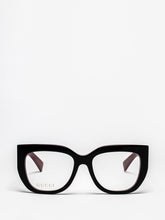 Acetate styles embellished by thick and geometric constructions. Oversize squared cat-eye. Flat GG interlocking logo on temple. Commercial yet cool color palette.