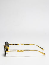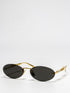 Precious and chick feminine construction characterized by a slim metal temple refined with pearls that frame the Gucci cut out logo. Glasant almond feminine shape. Gucci lettering logo cut out on the temple. Gold and silver metal structures paired with dark and colored lenses.