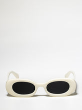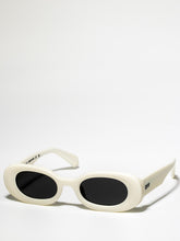 Amalfi oval-frame sunglasses from OFF-WHITE featuring white, acetate, lens decal, logo print at the arm, oval frame, grey tinted lenses, UV-protective lenses, straight arms and curved tips. These glasses come with a protective case.