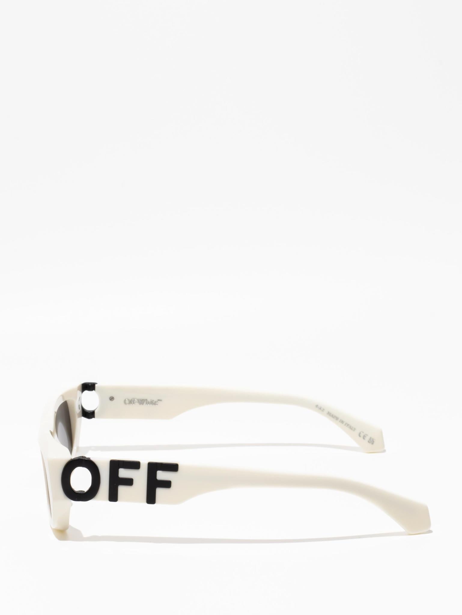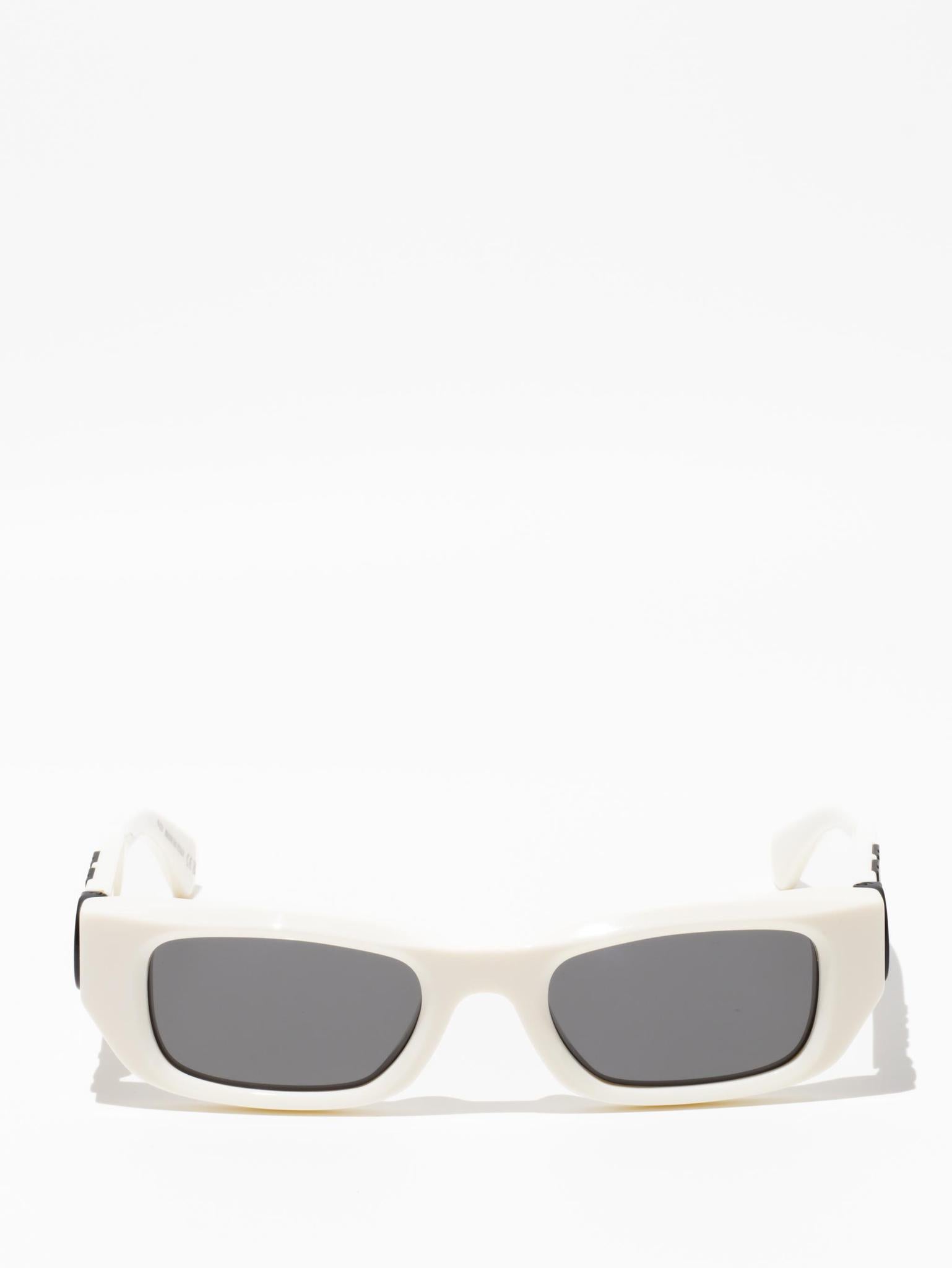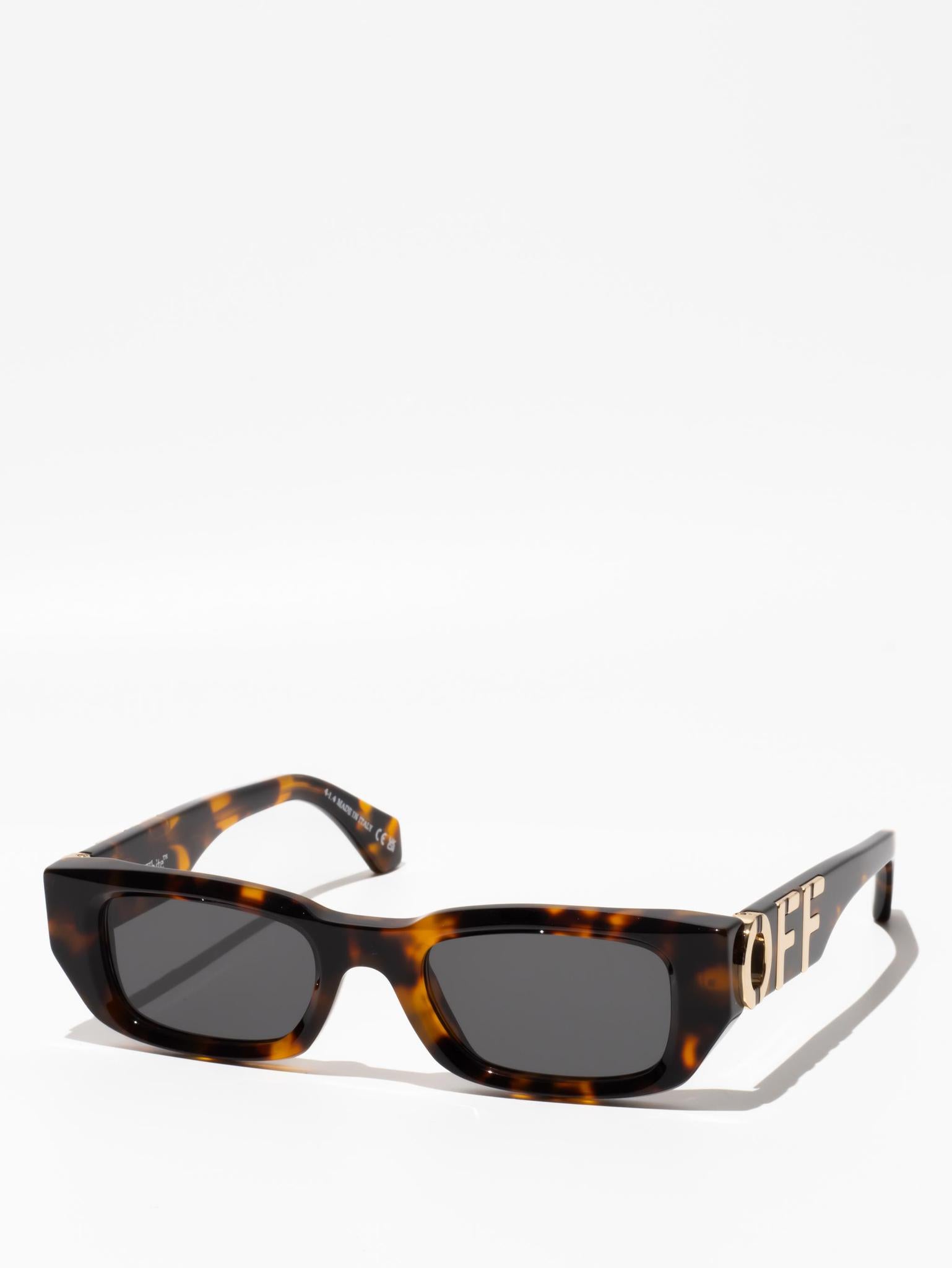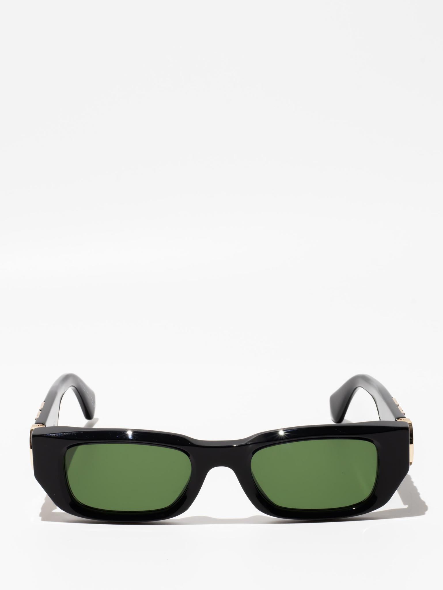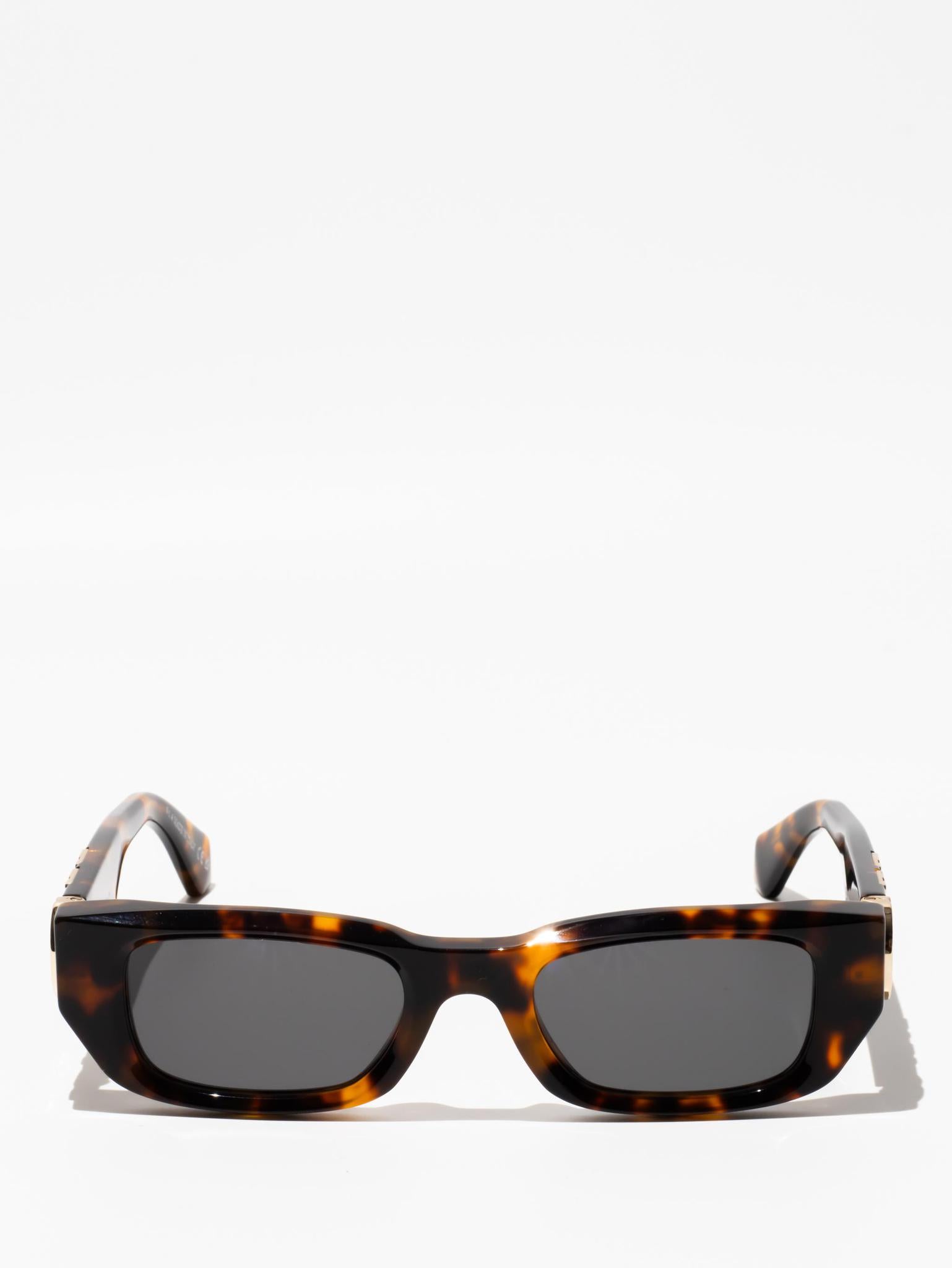These acetate sunglasses feature a slim, diamond-shaped silhouette with deeply carved lenses for a three-dimensional look. The slender temples host oversized semi-gloss metal logos that connect to the front.