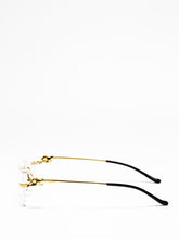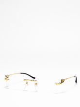 Rimless rectangular shape for a classic and sophisticated look. New dynamic sculptured Panthère head and body on metal temples. Comfortable temple tips recalling the Panthère tail movement.