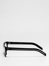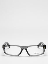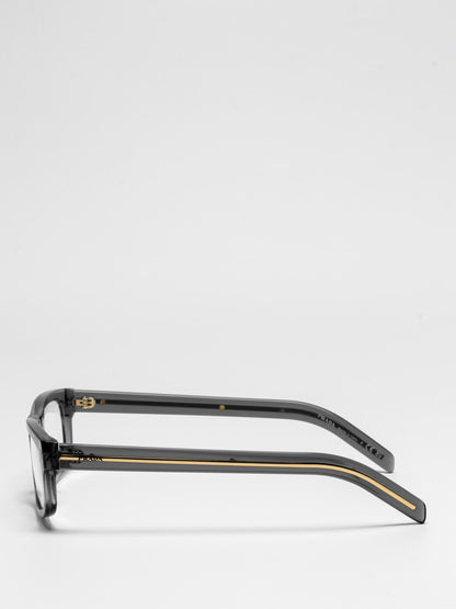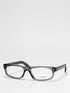 A continuous metal plaque runs along the entire length of the acetate temples, with matching triangle details enhancing the front. Available in a range of colors including transparent seasonal options, these acetate frames boast a modern and narrow rectangular shape.