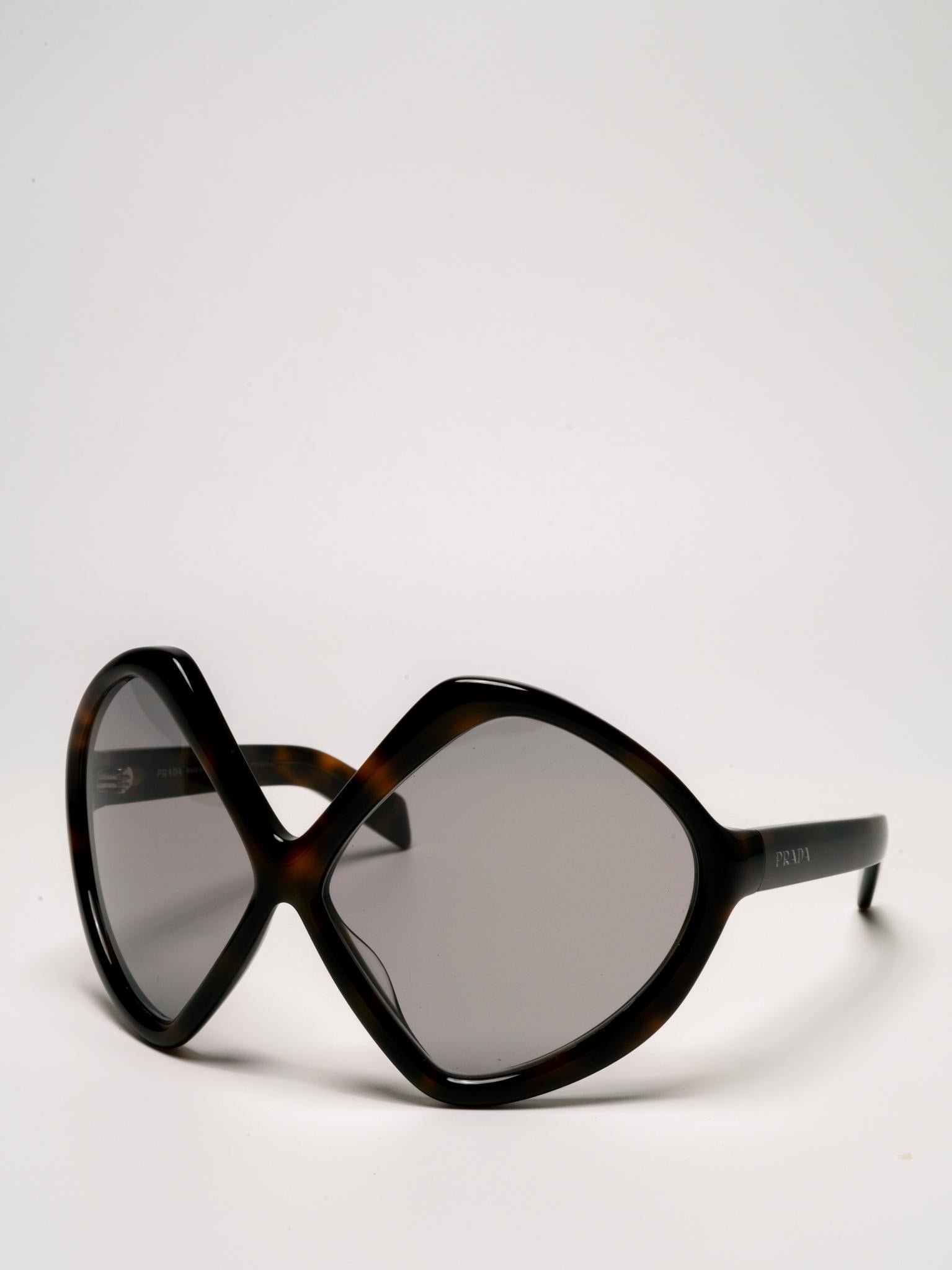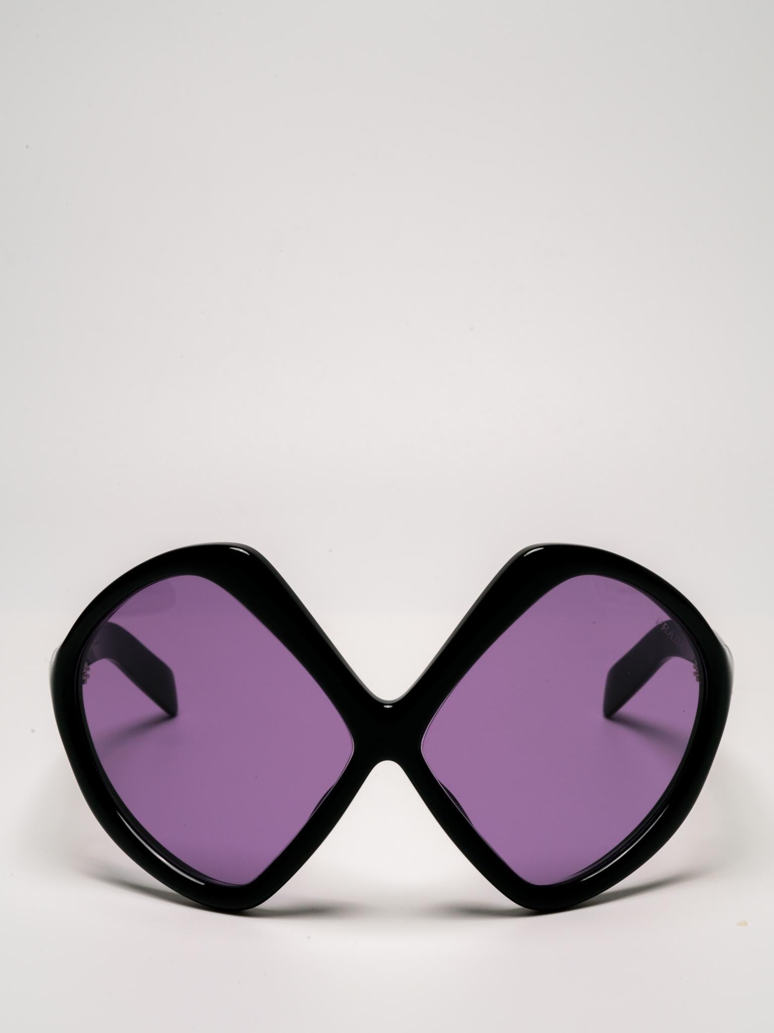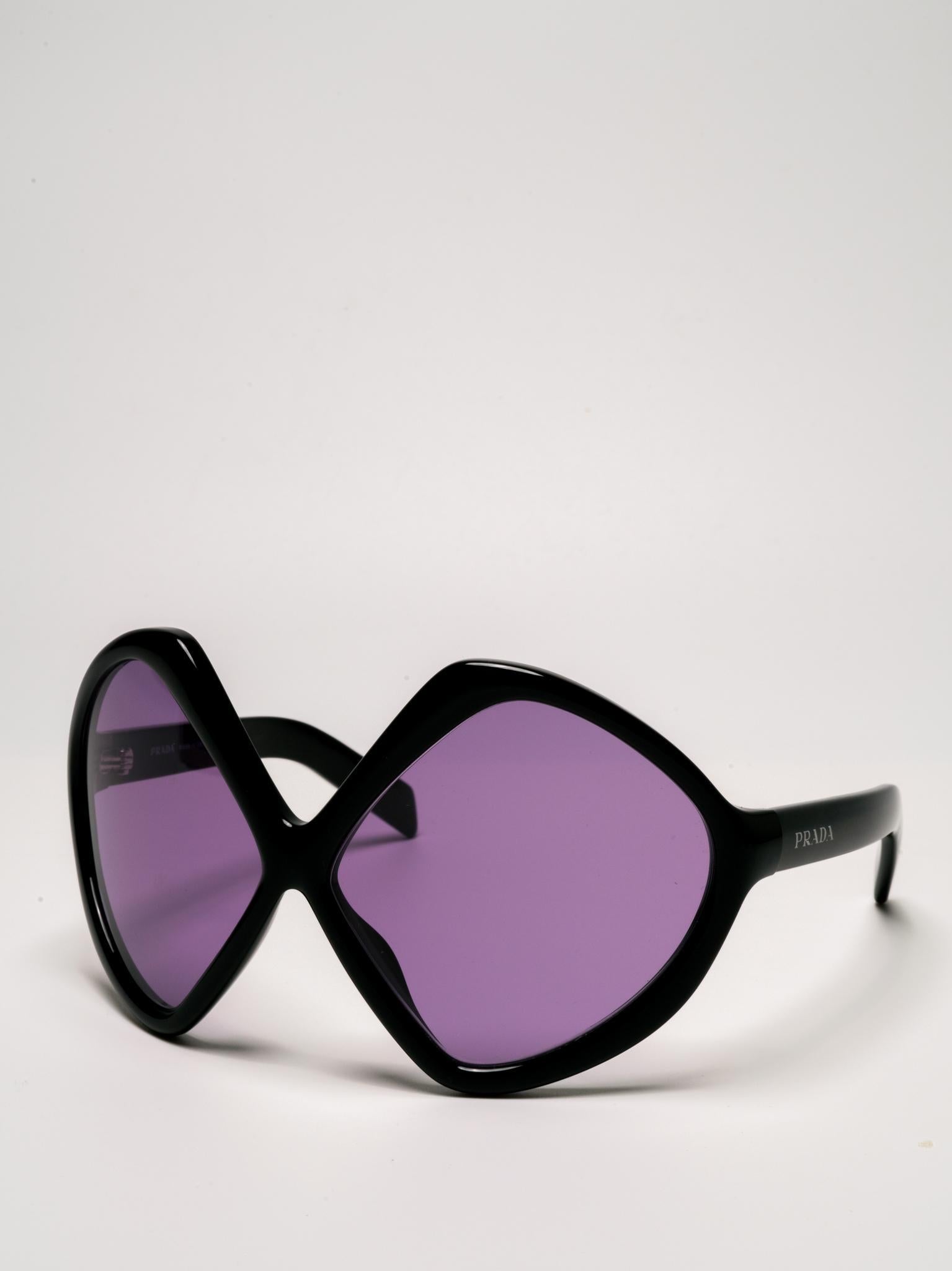 Acetate sunglasses available in black with purple lenses and juniper havana with gray lenses. A minimal Prada logo sits discreetly on the temples, letting the striking wraparound butterfly silhouette take center stage.