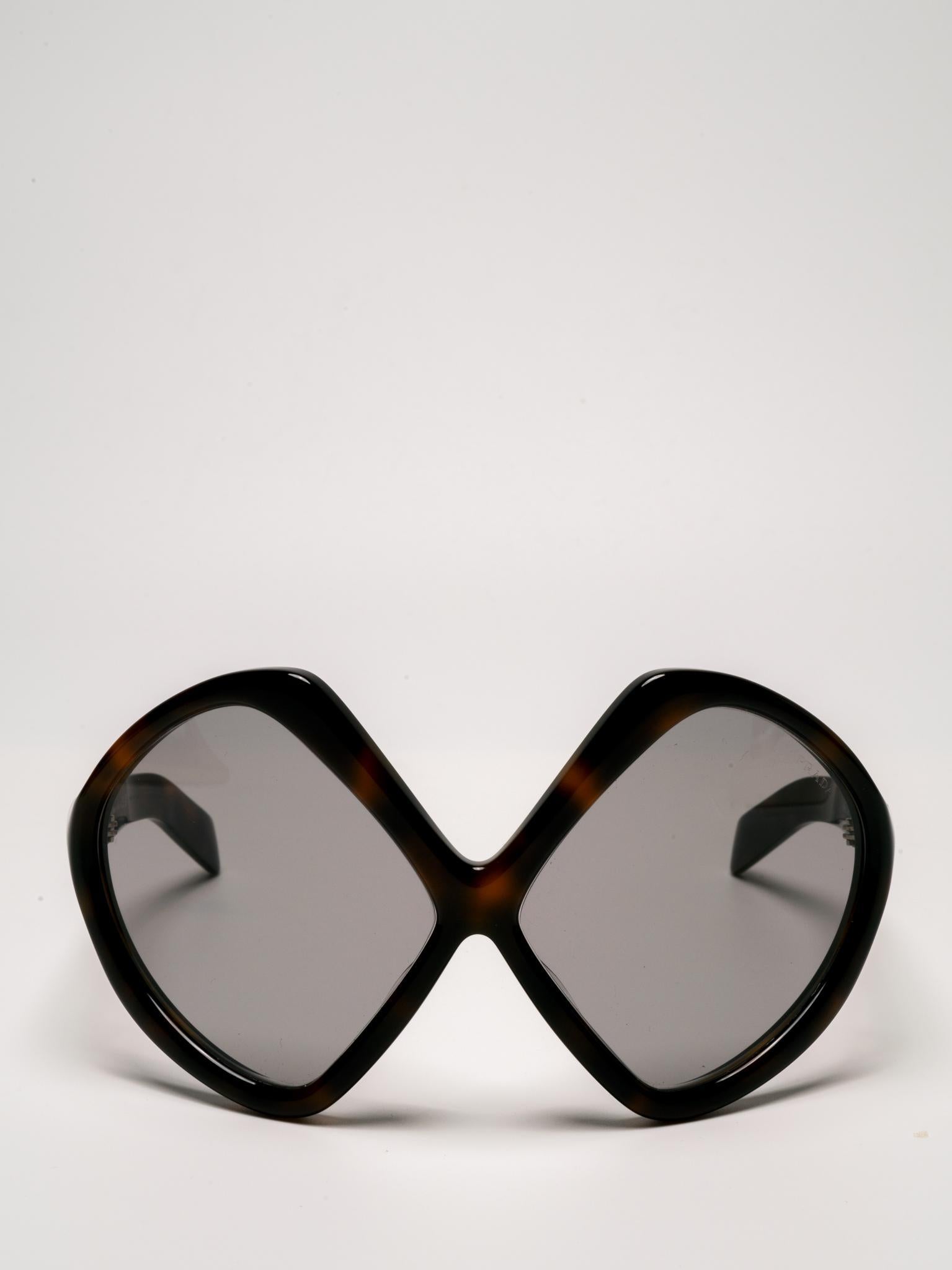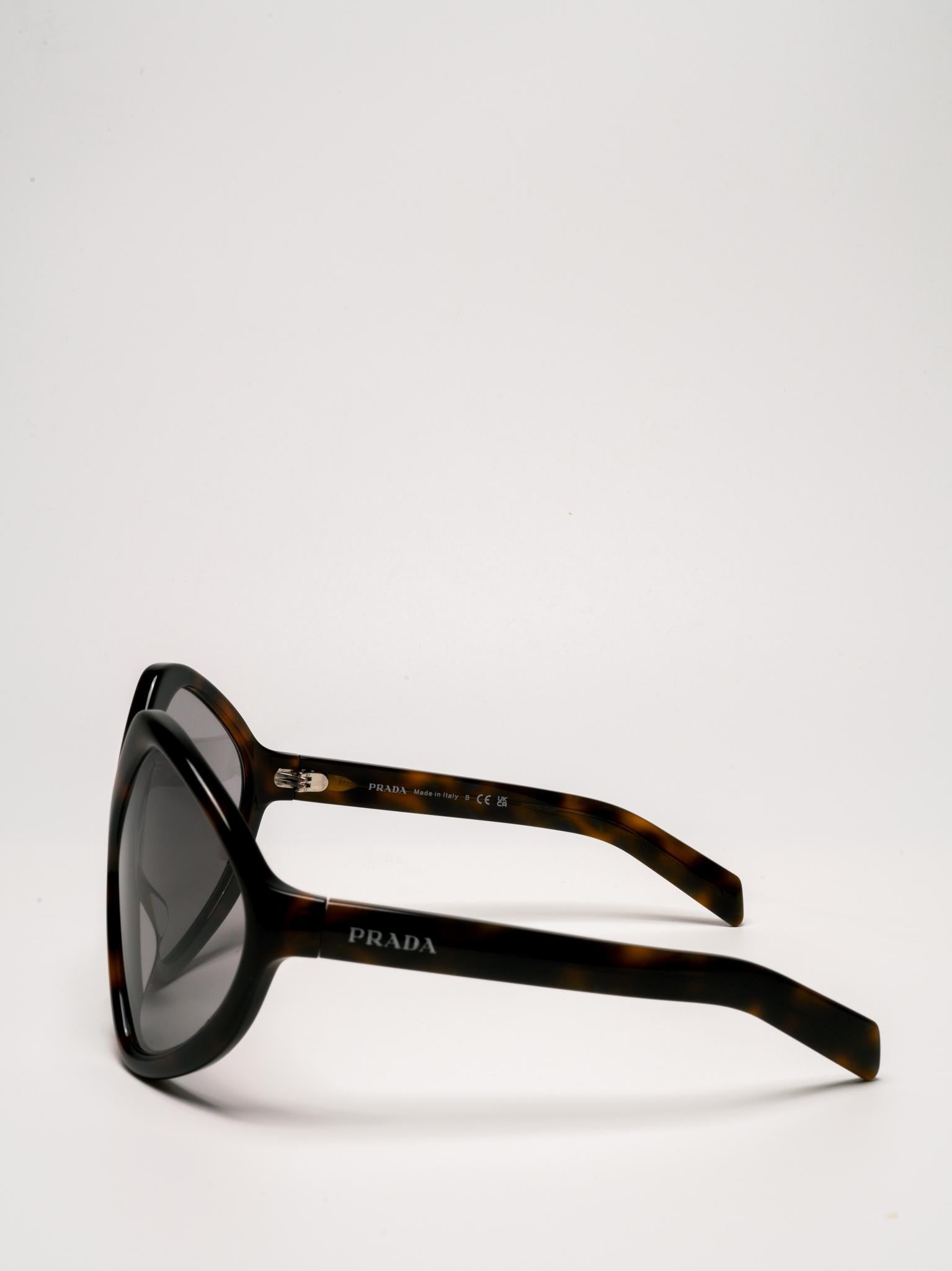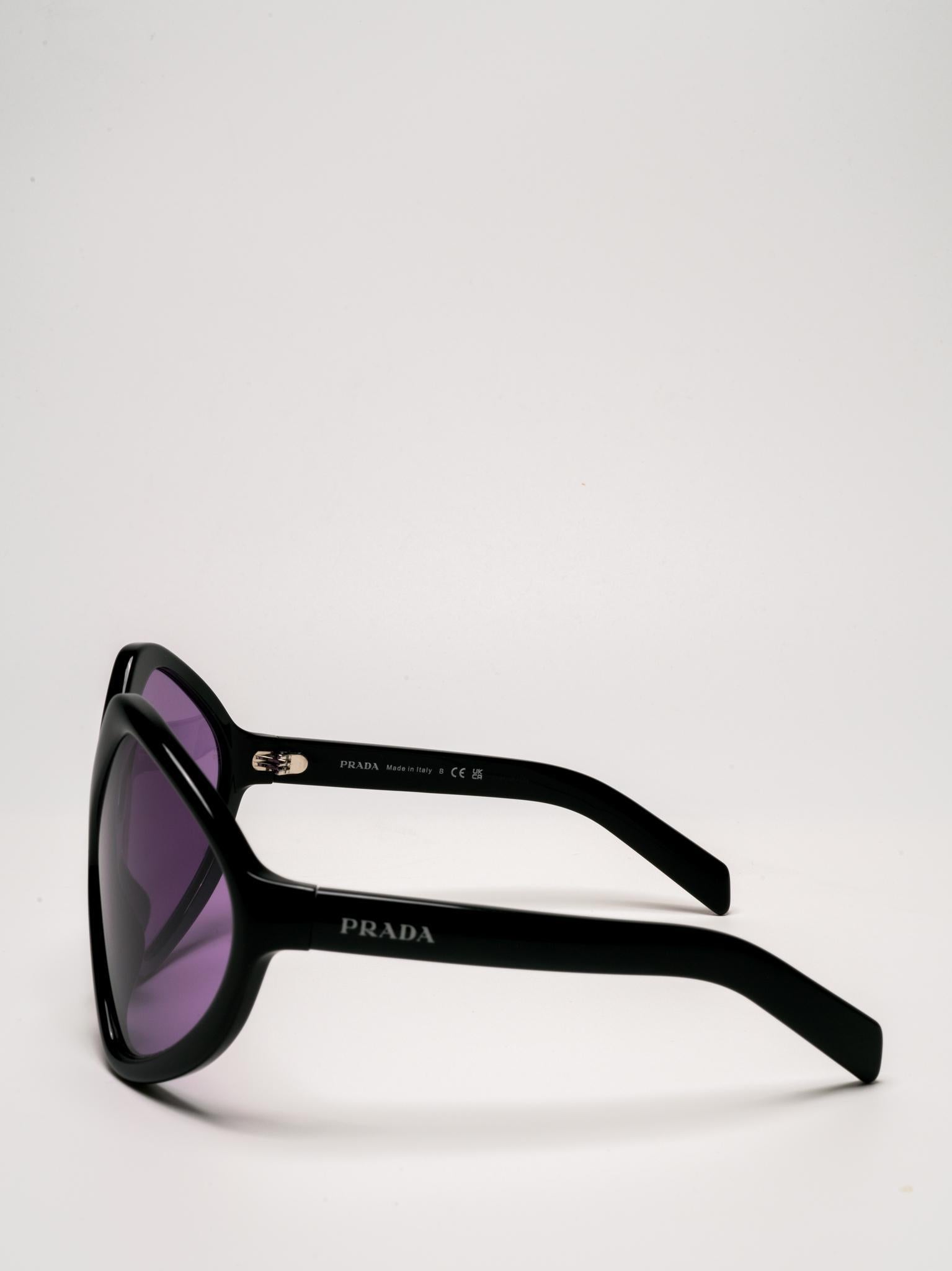 Acetate sunglasses available in black with purple lenses and juniper havana with gray lenses. A minimal Prada logo sits discreetly on the temples, letting the striking wraparound butterfly silhouette take center stage.