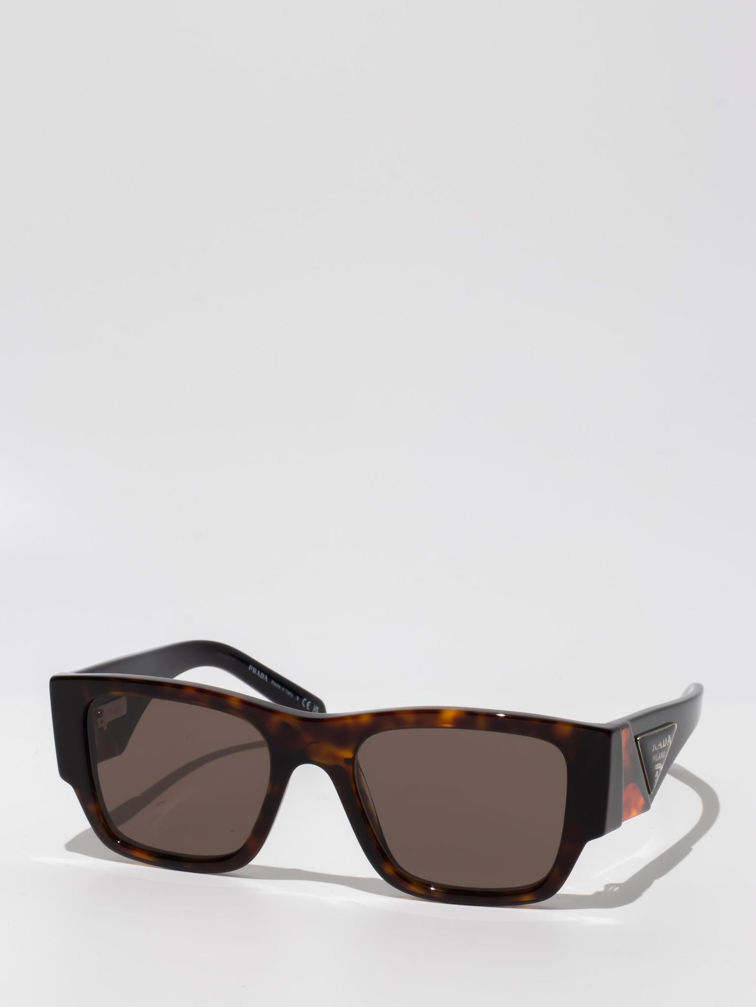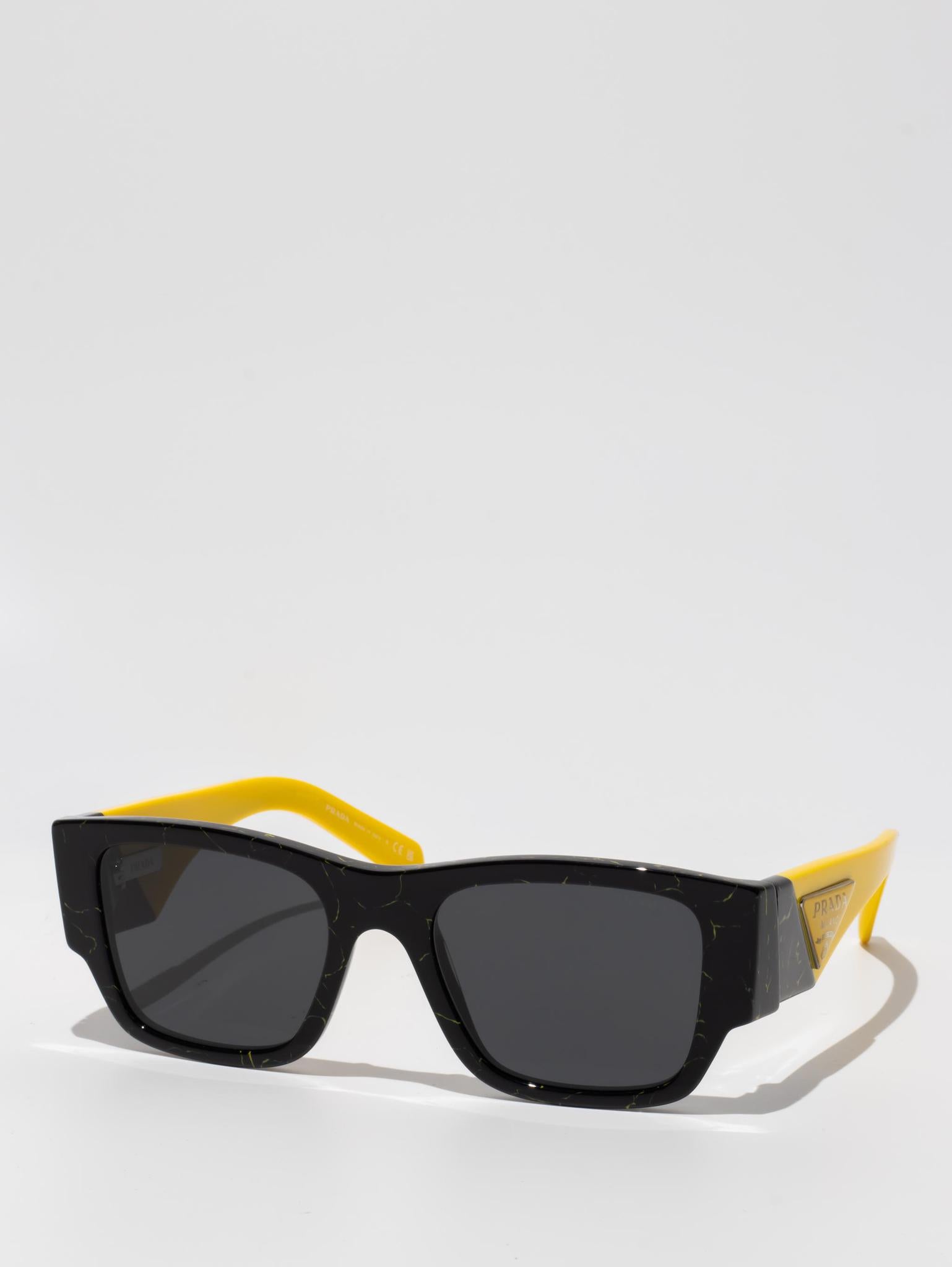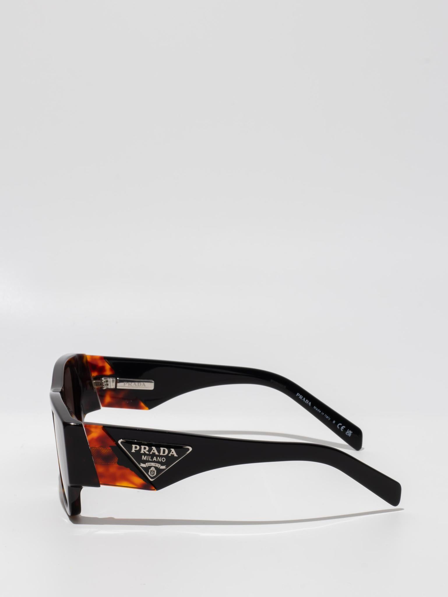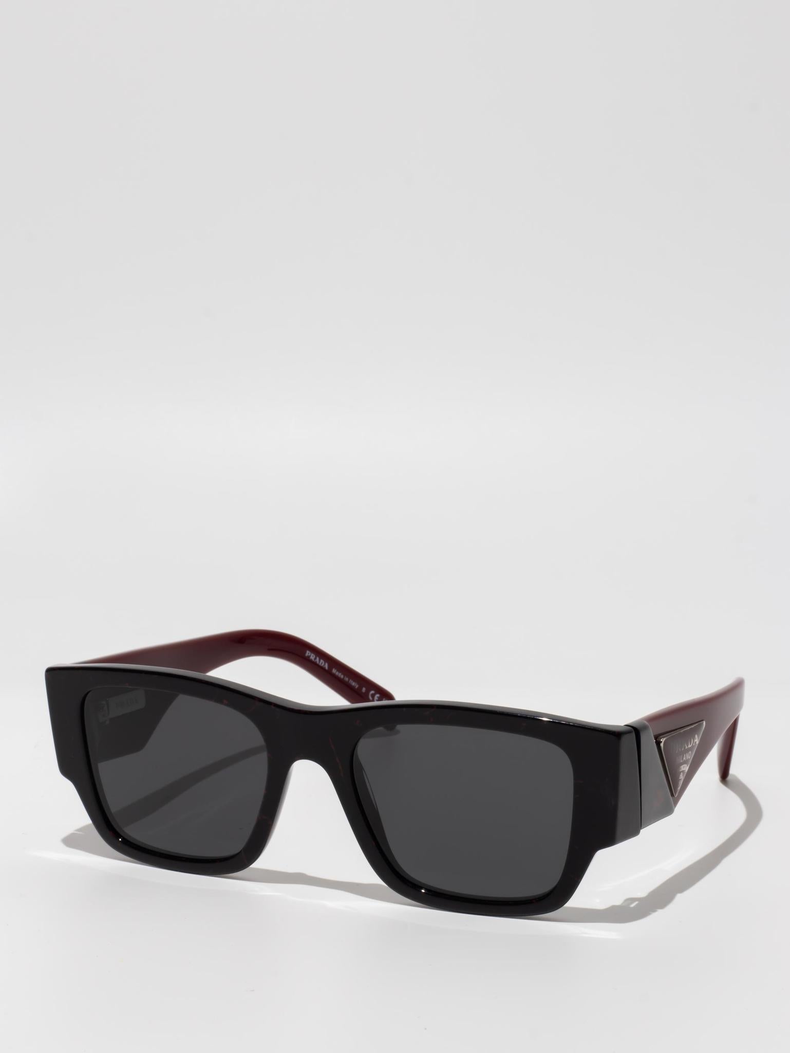 Acetate sunglasses from the Prada Symbole collection. The bold rectangular frame is composed of a refined combination of acetate layers highlighted by contrasting colors on the lens rims. The three-dimensional workmanship on the temples features an iconographic interpretation of the traditional Prada triangle logo.