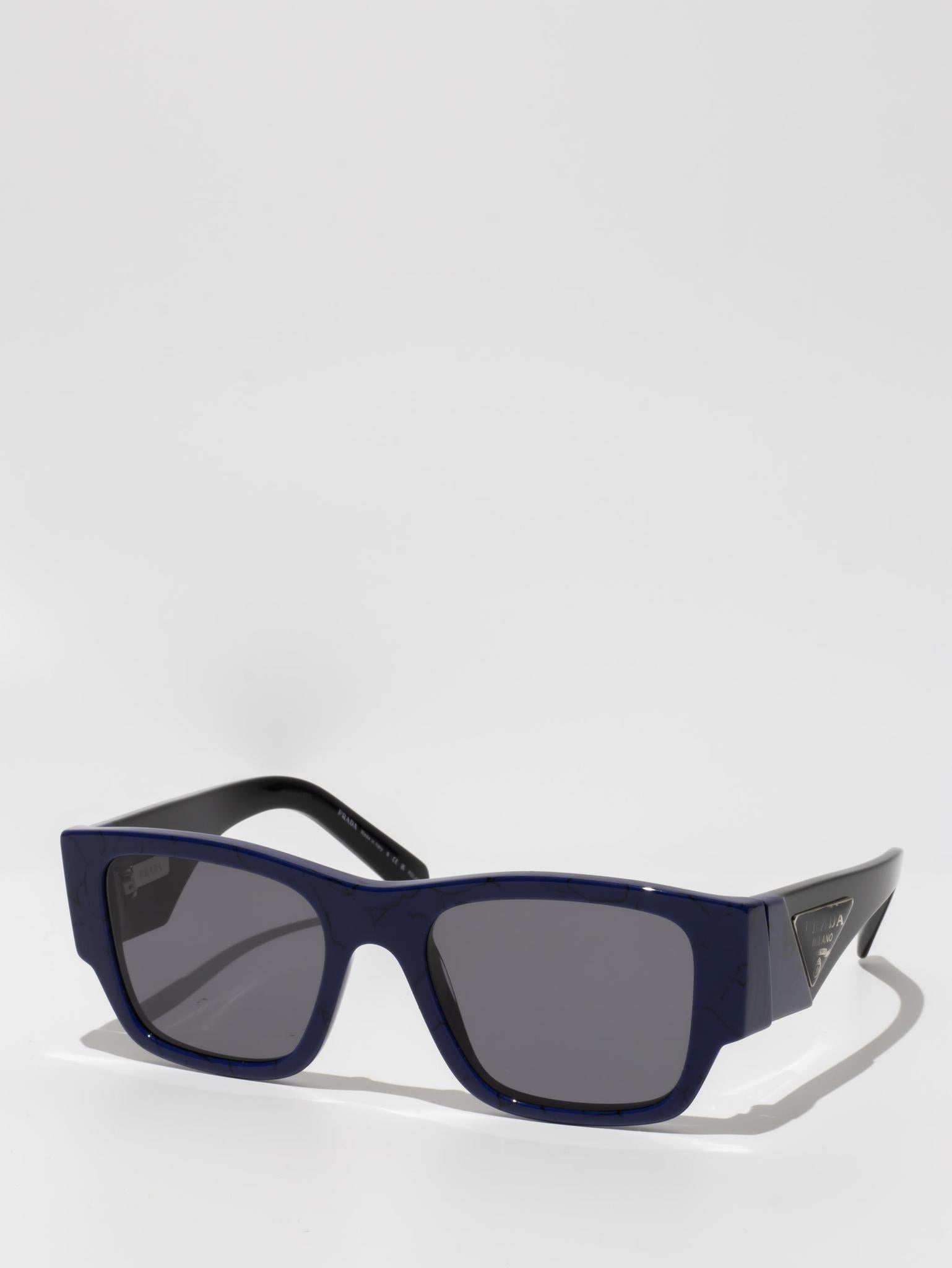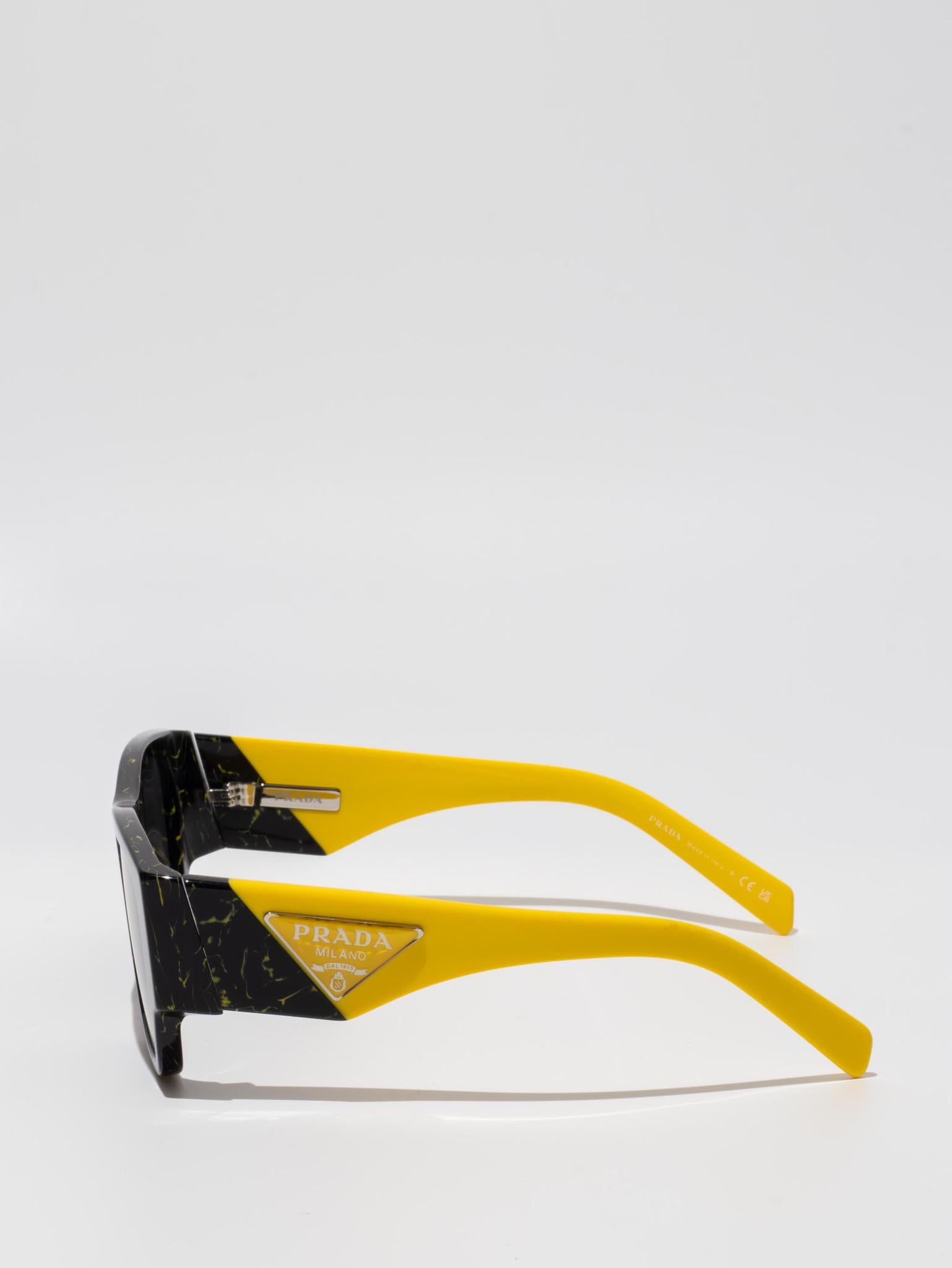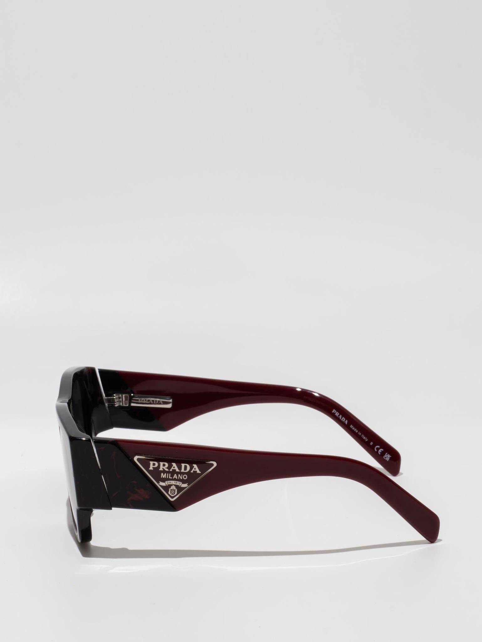Acetate sunglasses from the Prada Symbole collection. The bold rectangular frame is composed of a refined combination of acetate layers highlighted by contrasting colors on the lens rims. The three-dimensional workmanship on the temples features an iconographic interpretation of the traditional Prada triangle logo.