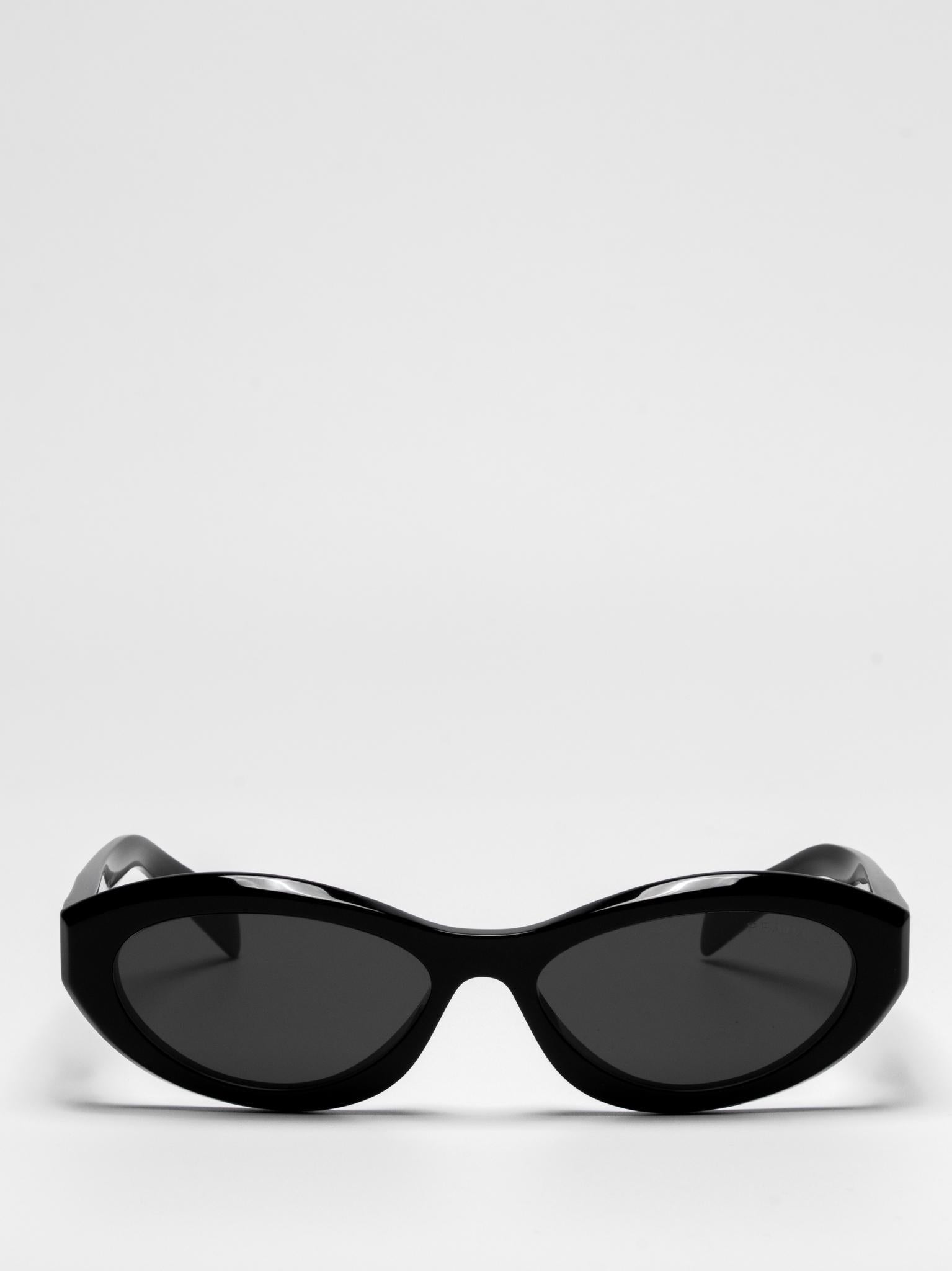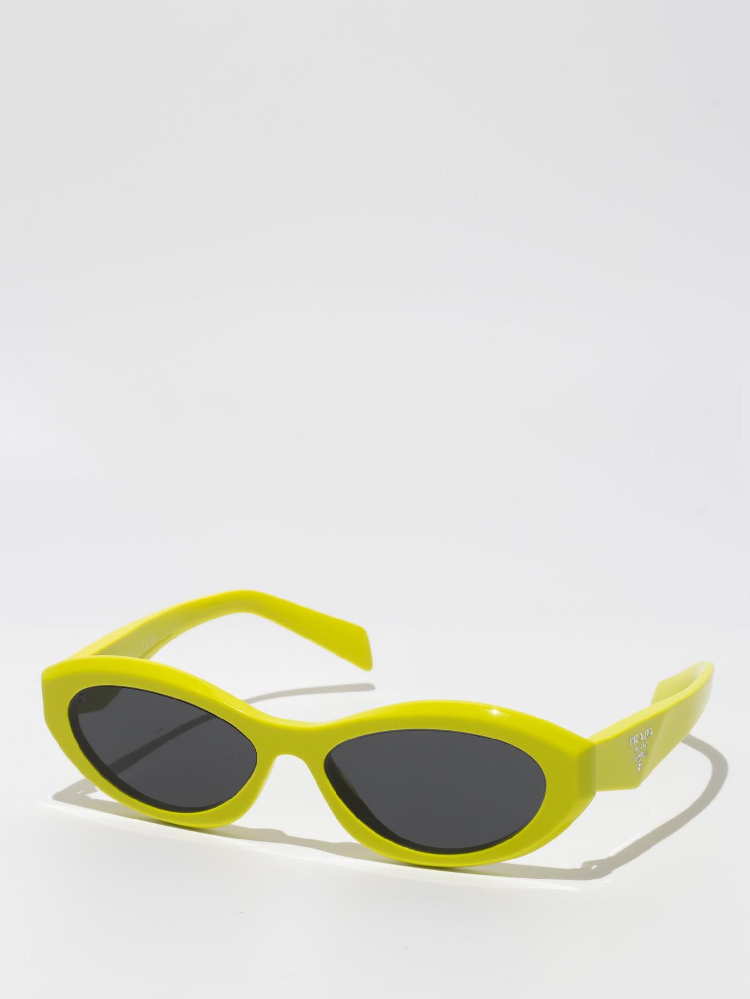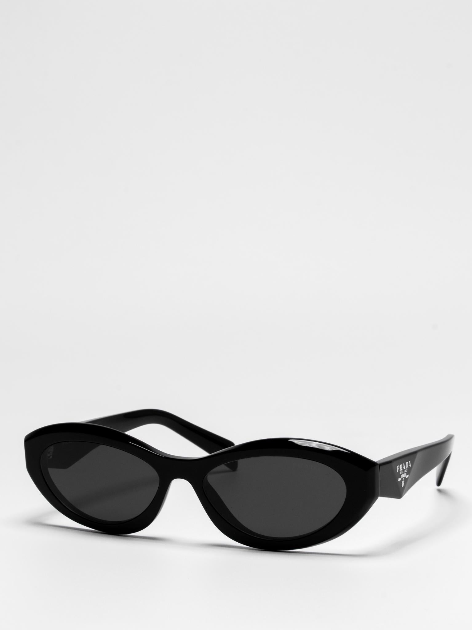 Sunglasses with an acetate frame featuring sinuous and slightly beveled rims expressing bold femininity. The thin temples are emphasized by a refined three-dimensional element that iconographically depicts the Prada triangle logo.