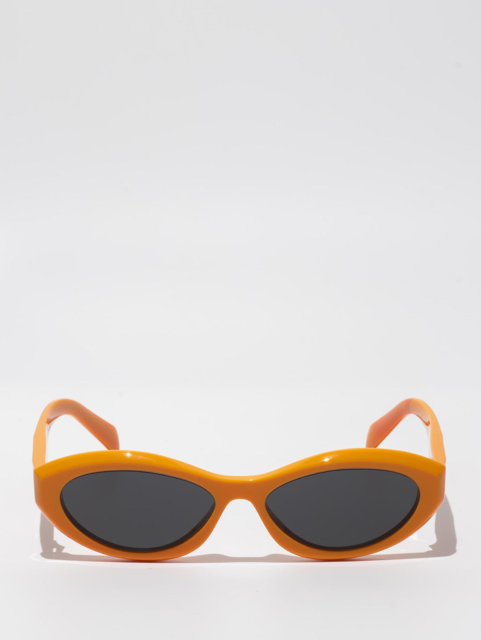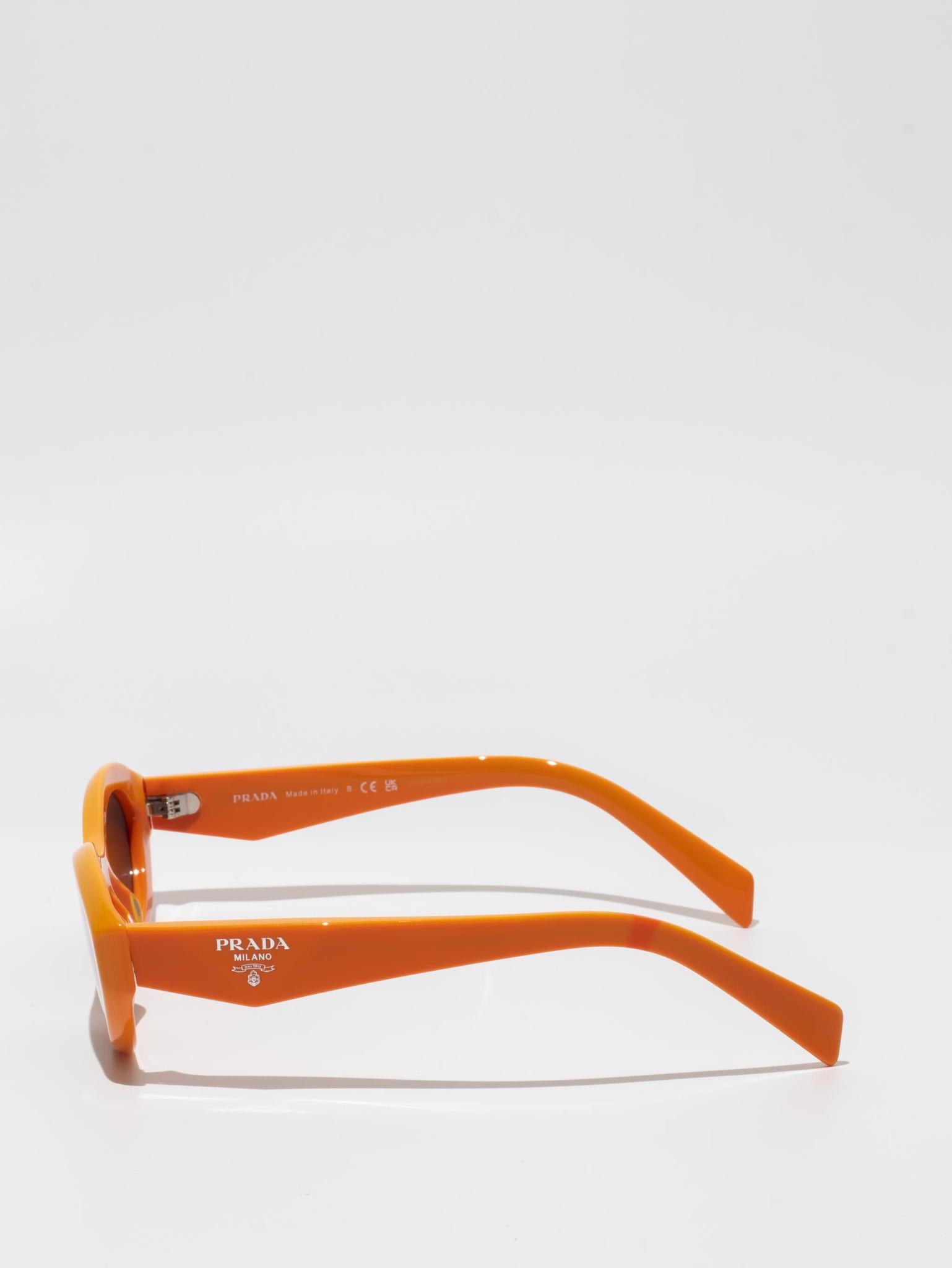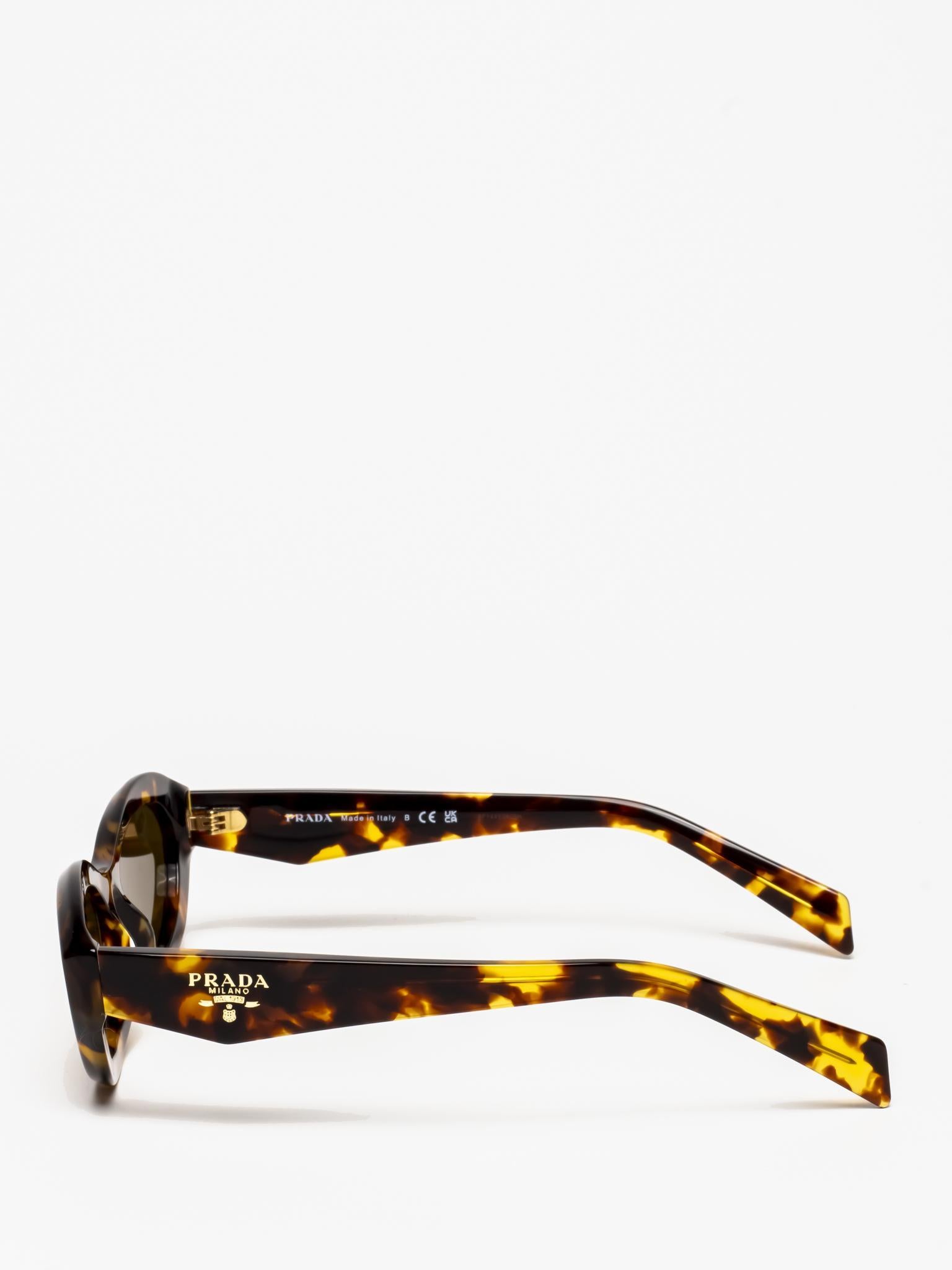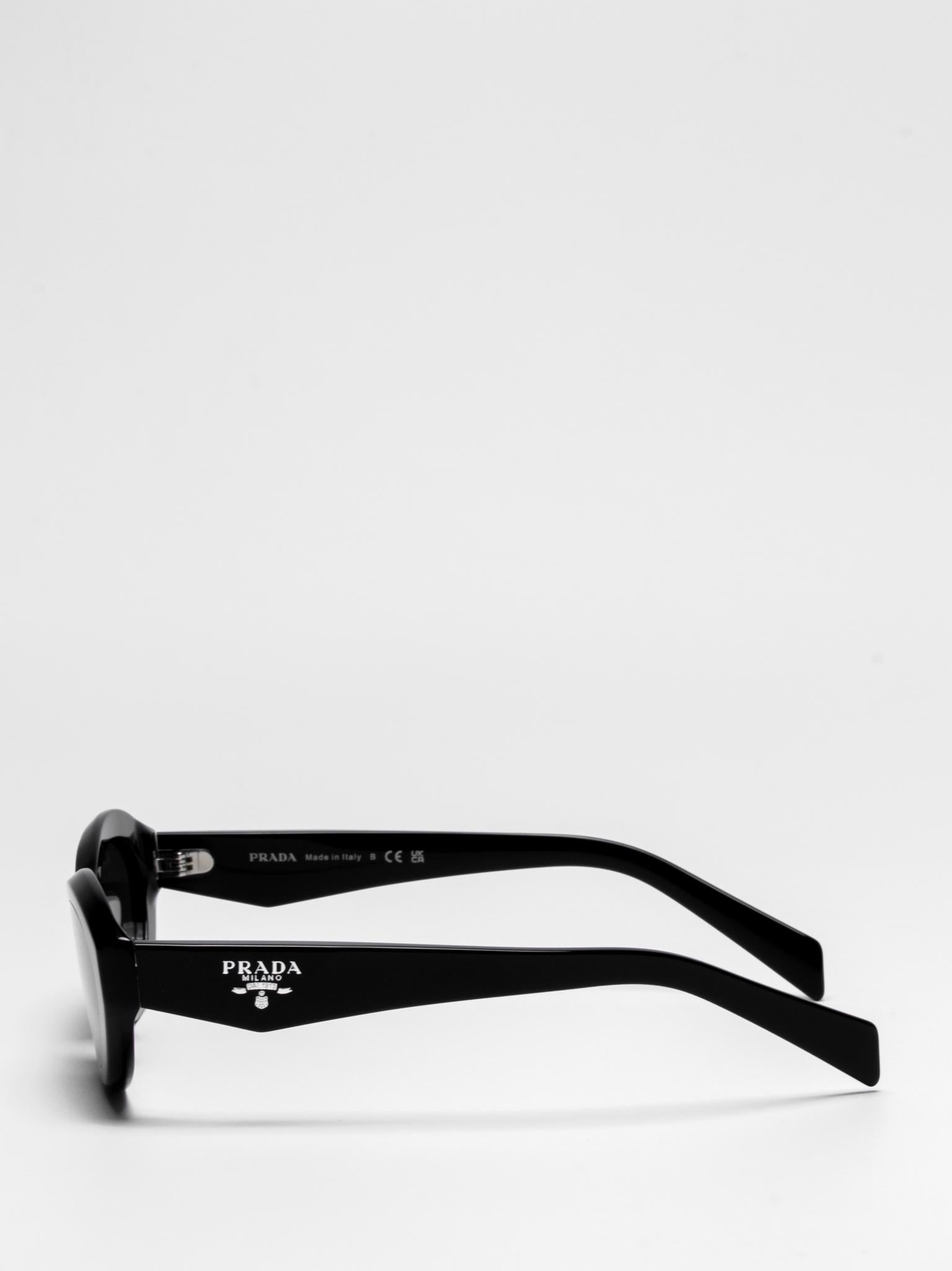 Sunglasses with an acetate frame featuring sinuous and slightly beveled rims expressing bold femininity. The thin temples are emphasized by a refined three-dimensional element that iconographically depicts the Prada triangle logo.