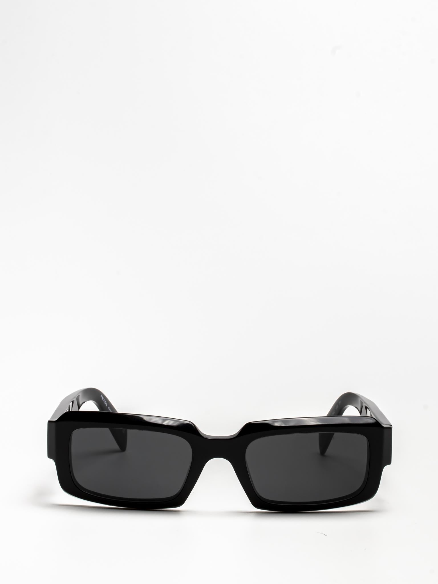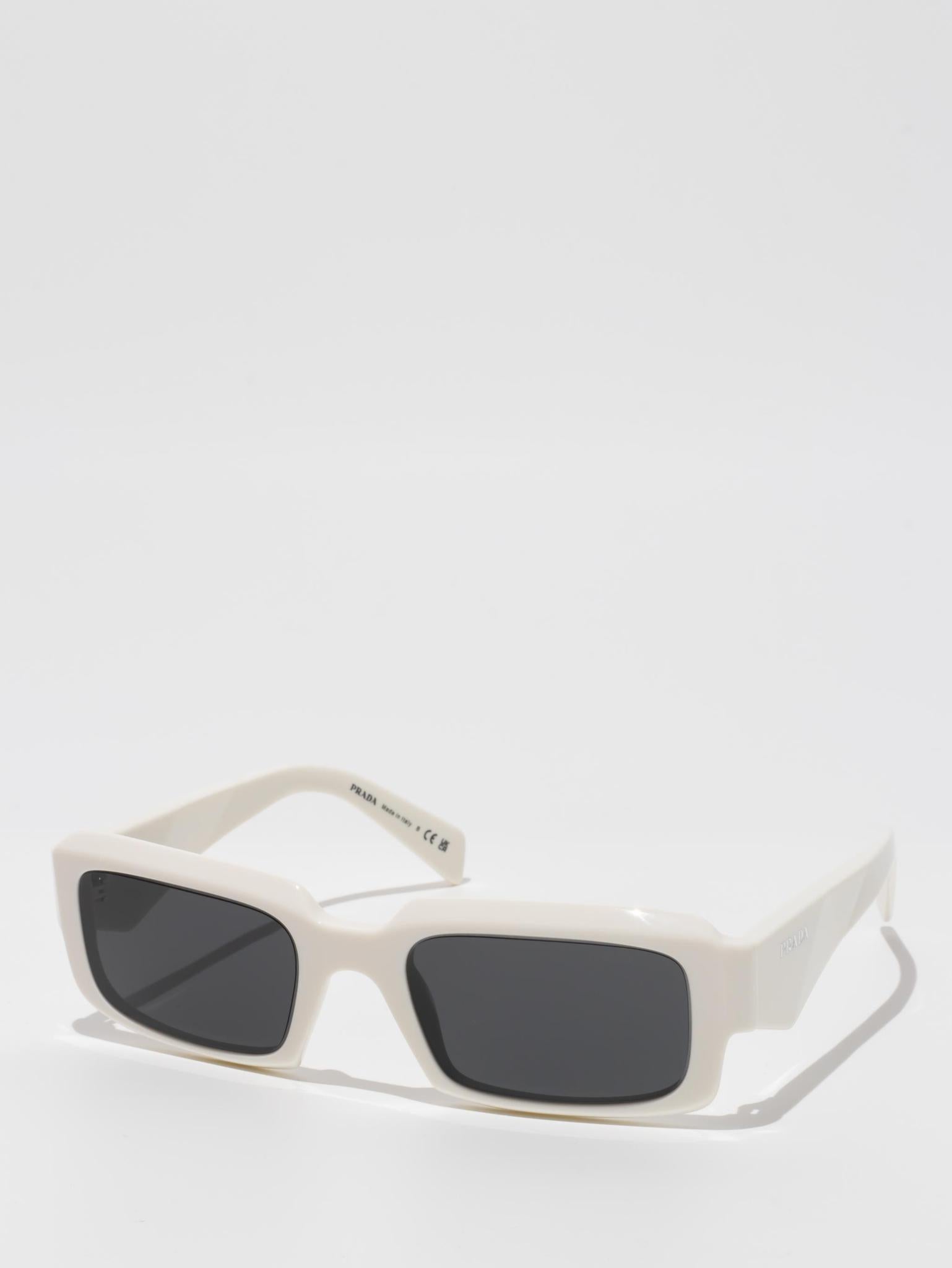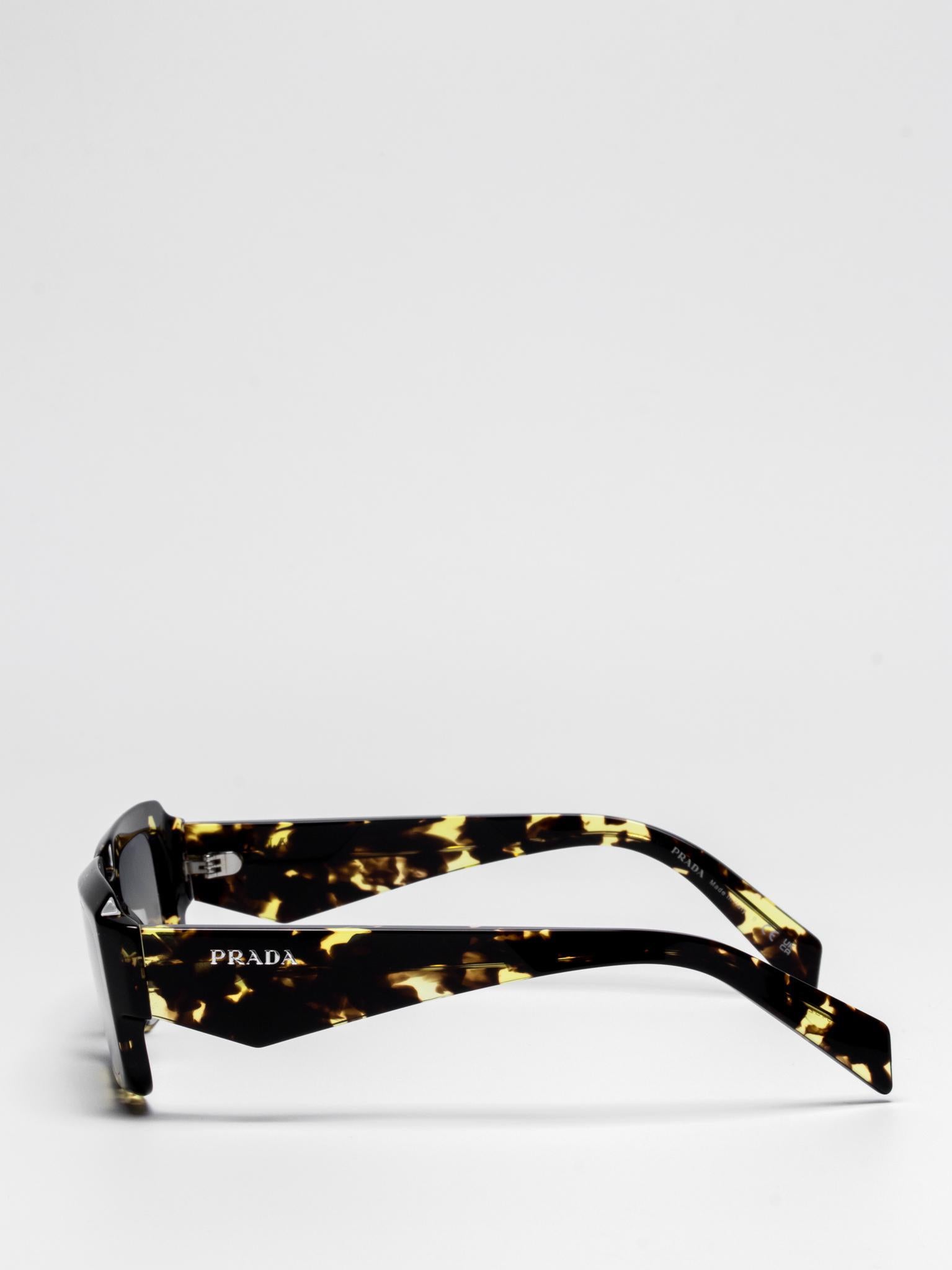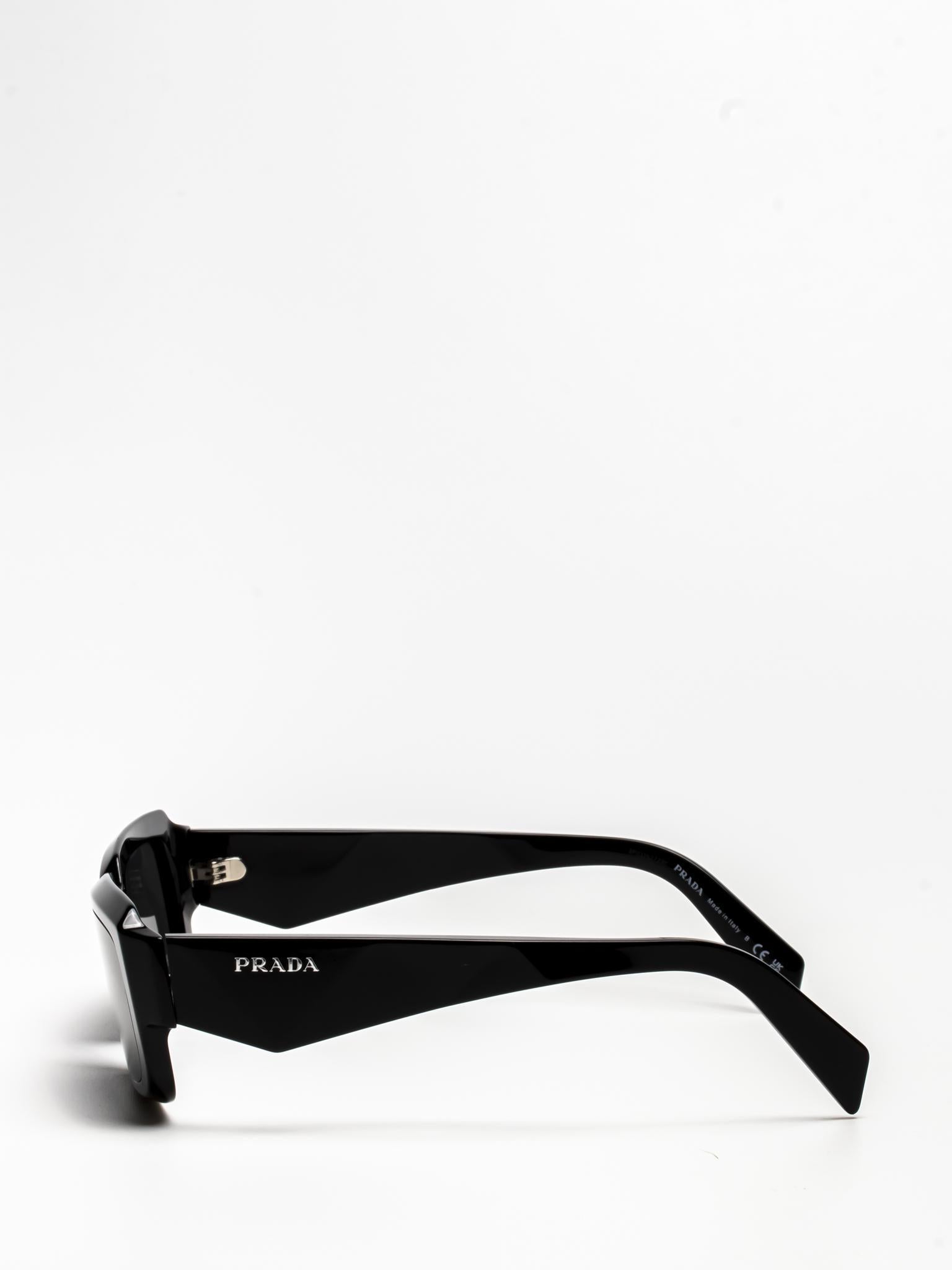 The frame is emphasized by chunky rims and refined facets on the front, while the temples have three-dimensional elements and are decorated with the Prada lettering logo.