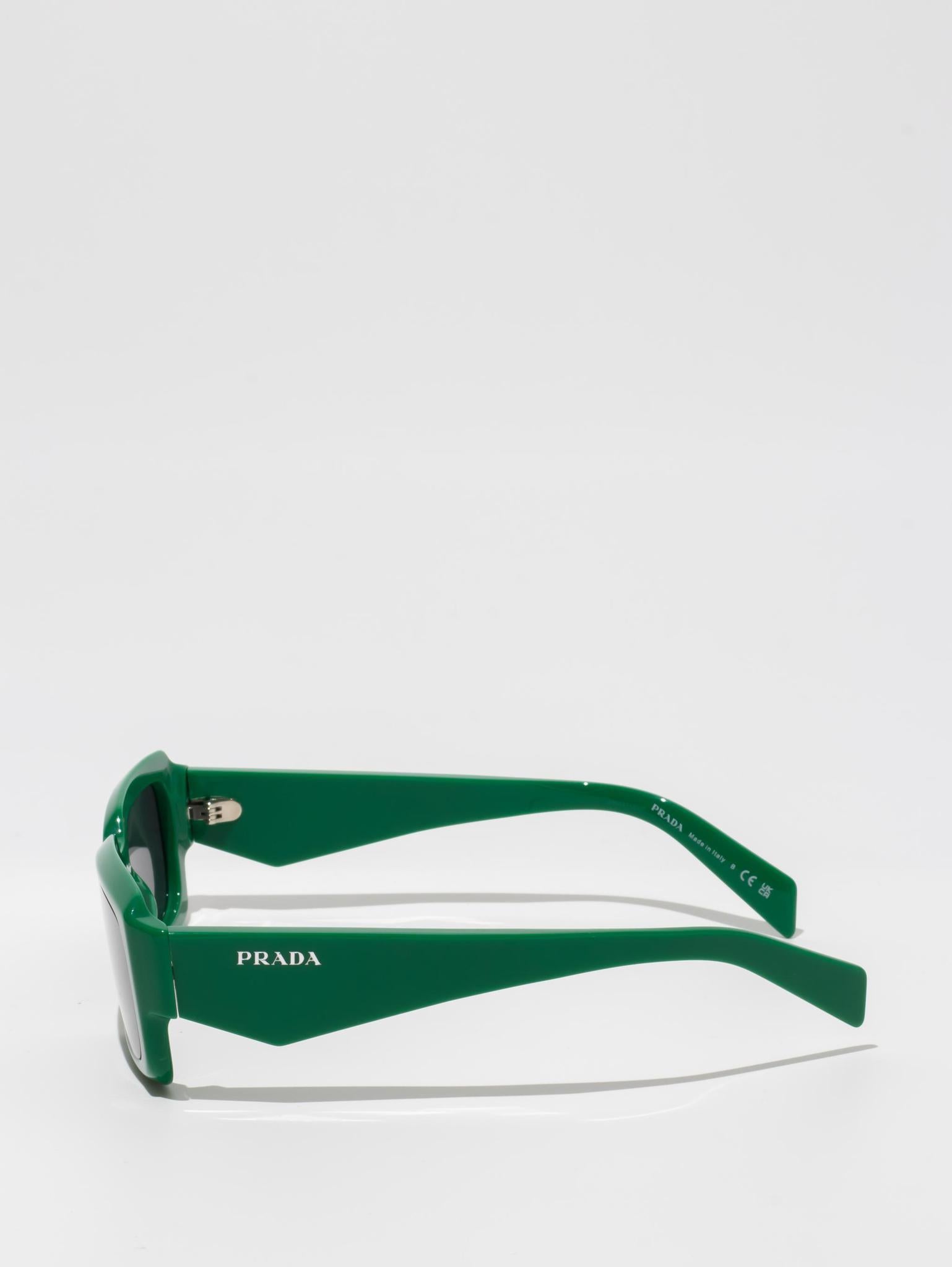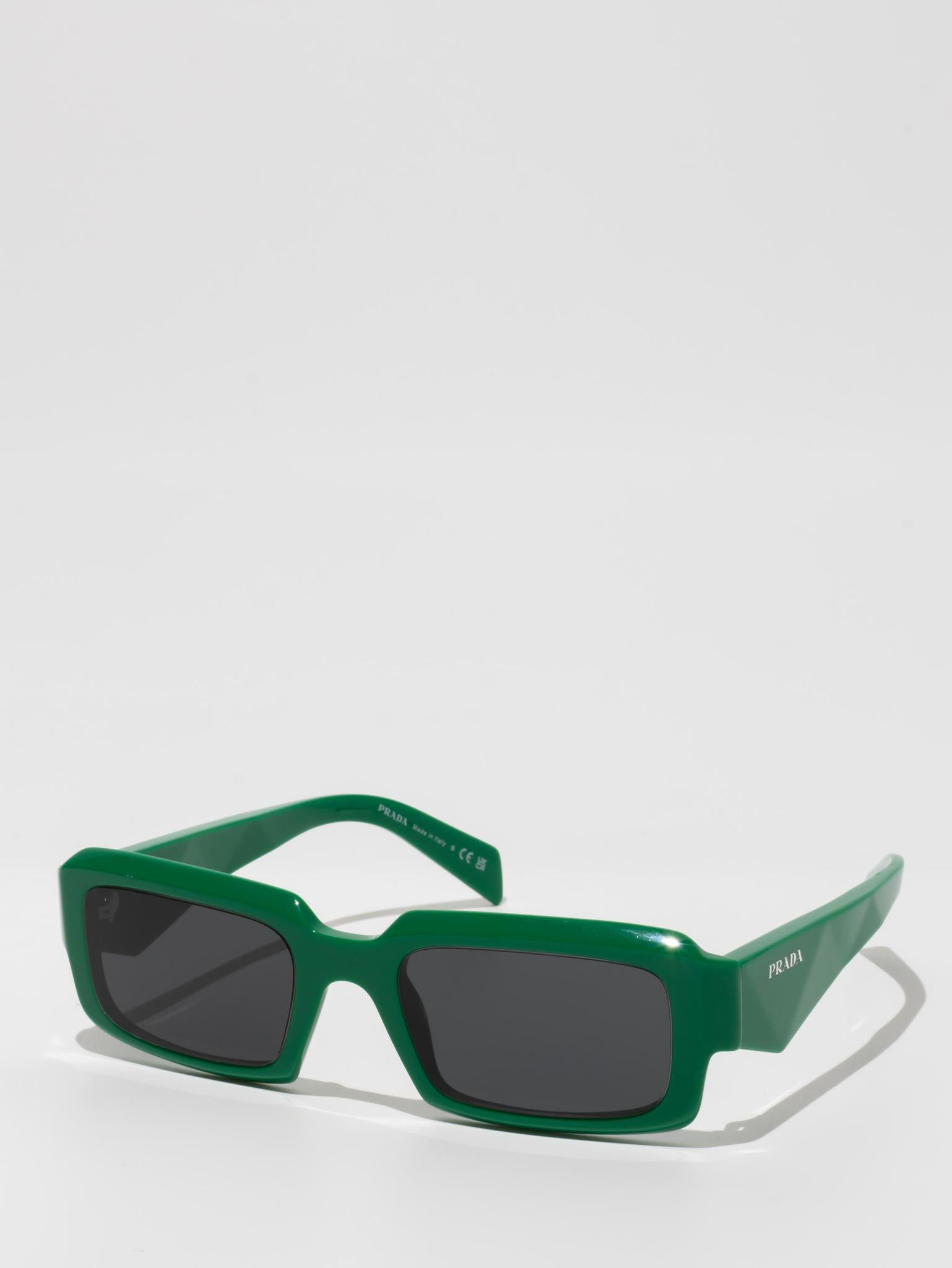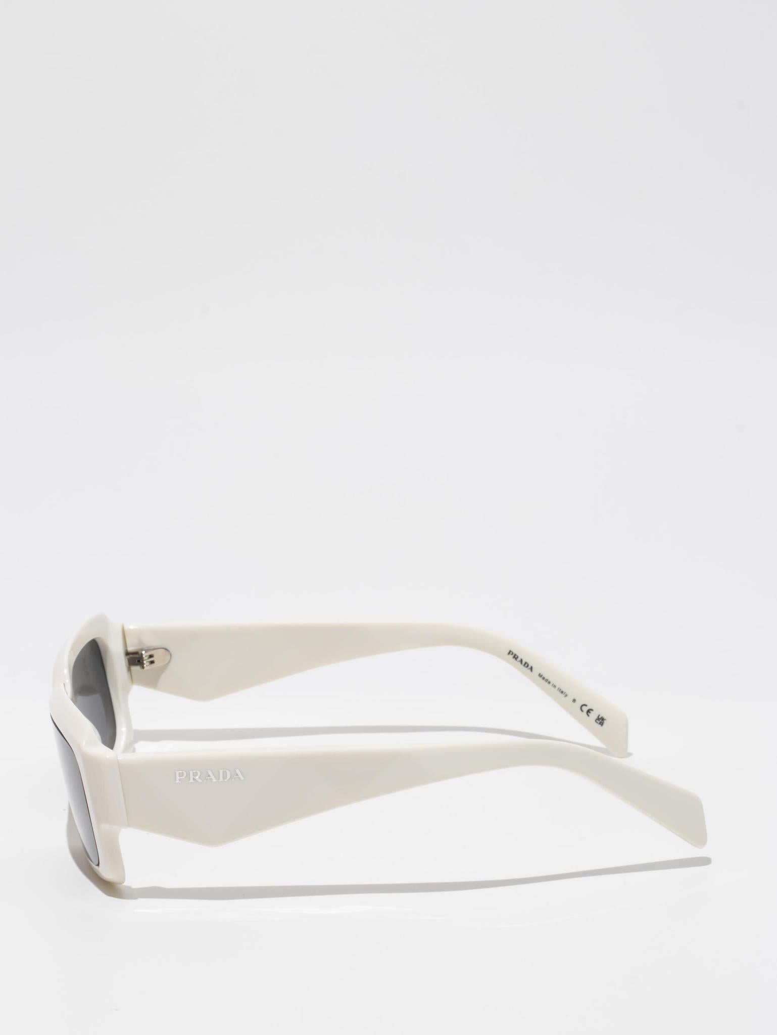 The frame is emphasized by chunky rims and refined facets on the front, while the temples have three-dimensional elements and are decorated with the Prada lettering logo.