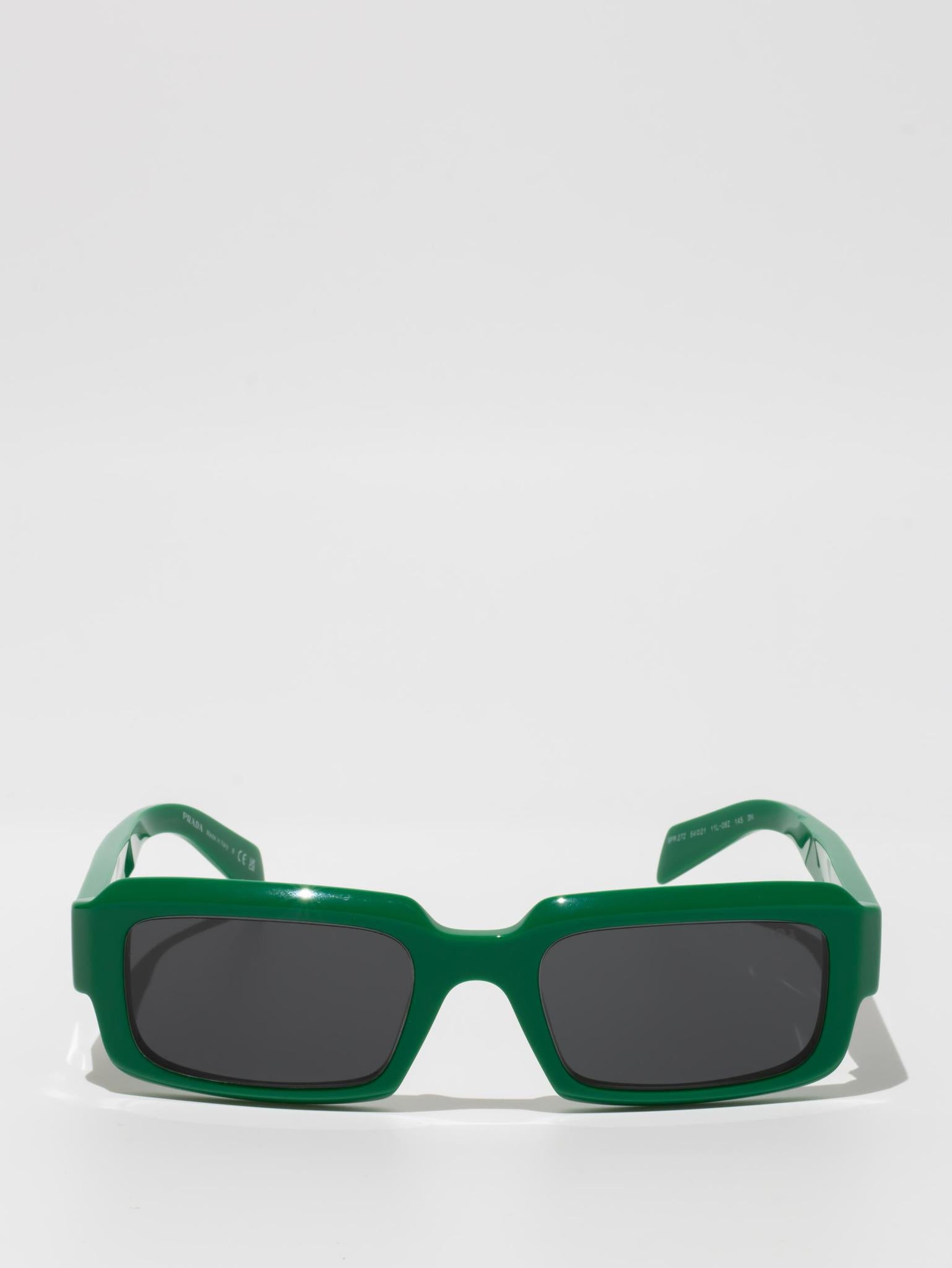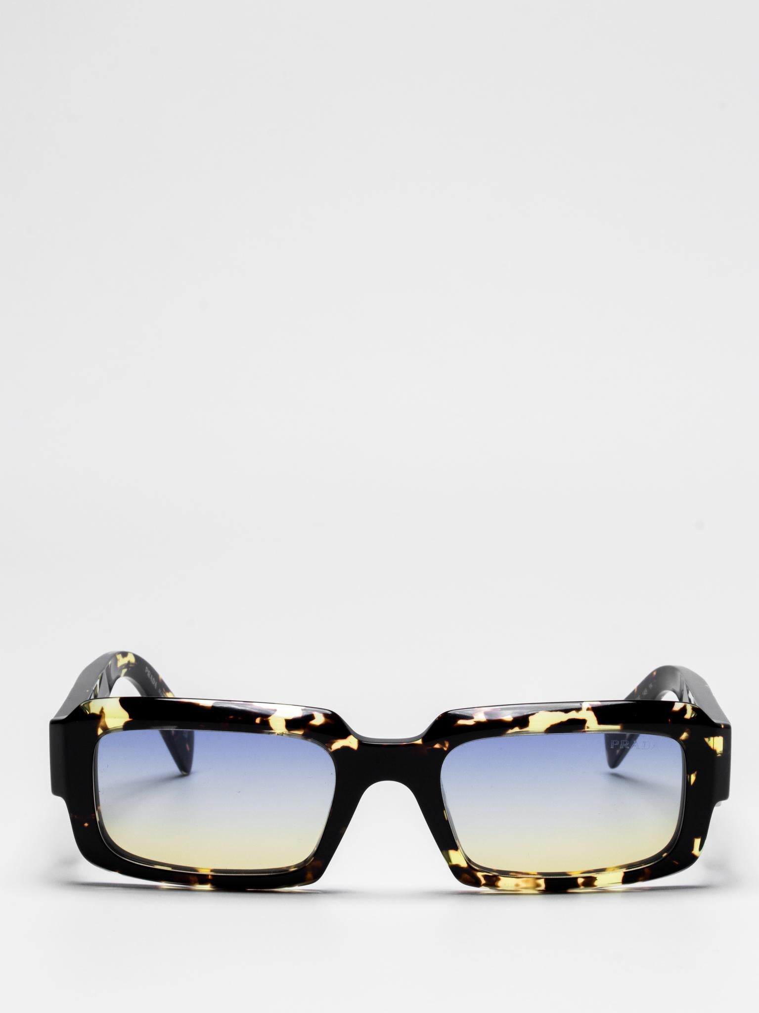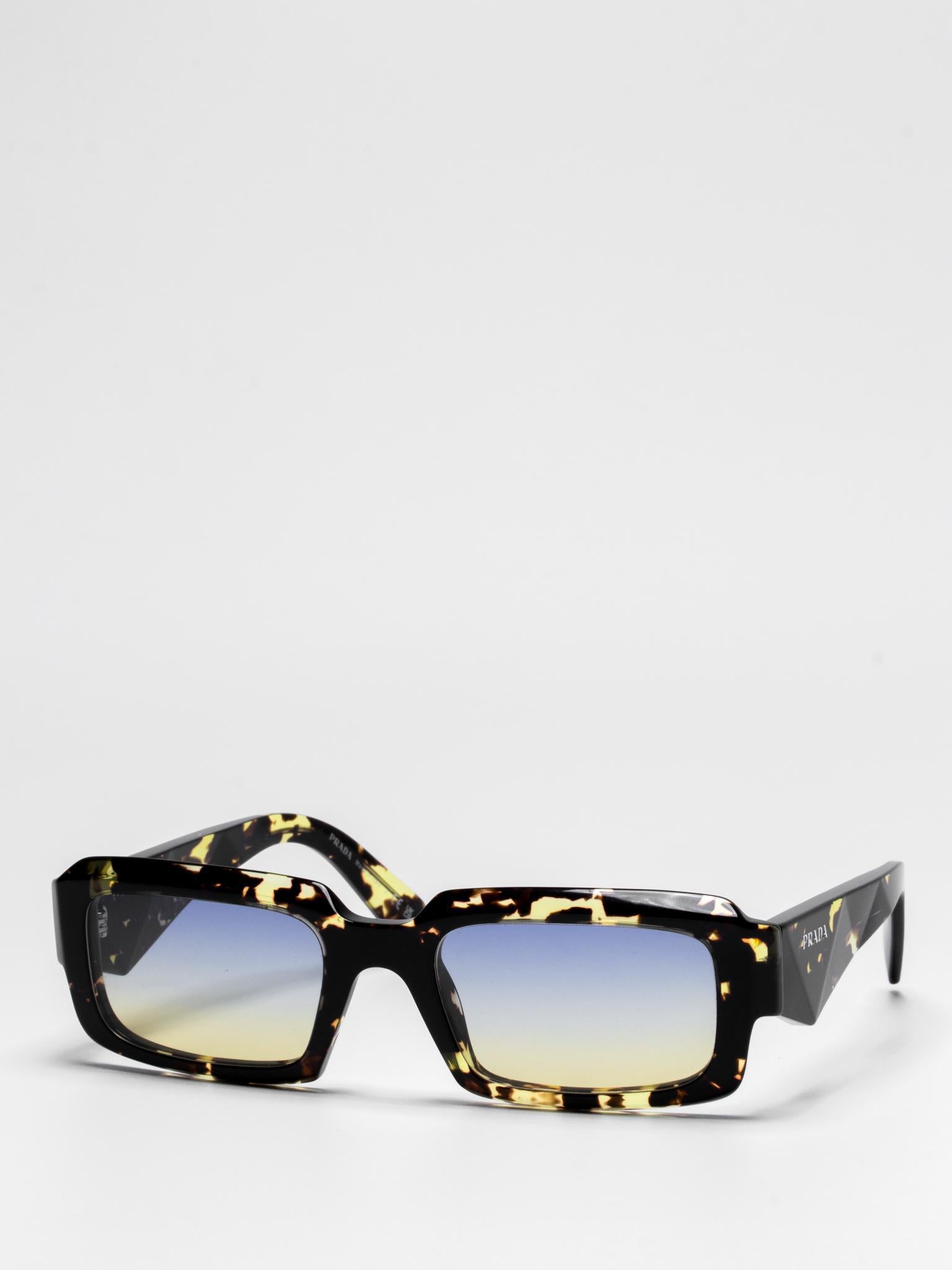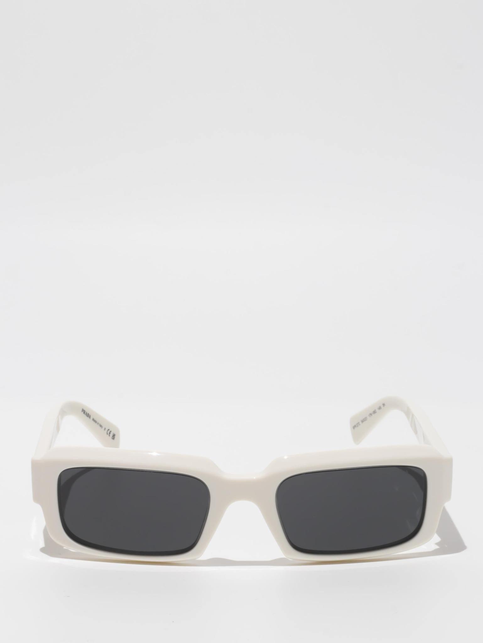 The frame is emphasized by chunky rims and refined facets on the front, while the temples have three-dimensional elements and are decorated with the Prada lettering logo.