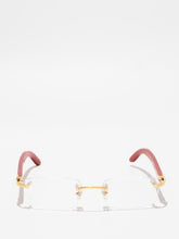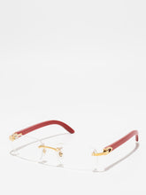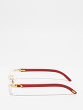 Rimeless eyewear with red poplar wood enriched by the C Décor on the temples for an elegant clientele. Example of Maison Cartier Savoir-Faire: each temple consists of ten thin layers of wood glued and pressed all together in a process called lamination, used by Cartier to maximize the strength of each frame. Precious finish in gold adorning the décor and the metal parts. Temples equipped with flexible hinges with invisible screws and Double C Décor signature on the nose pads.