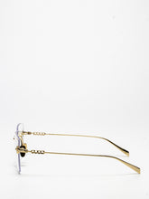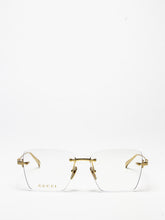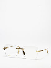 Metal glasant styles featuring the cut-out lettering logo on temple. Oversized squared shape. Cut-Out Lettering Logo. Color palette with gold galvanic.