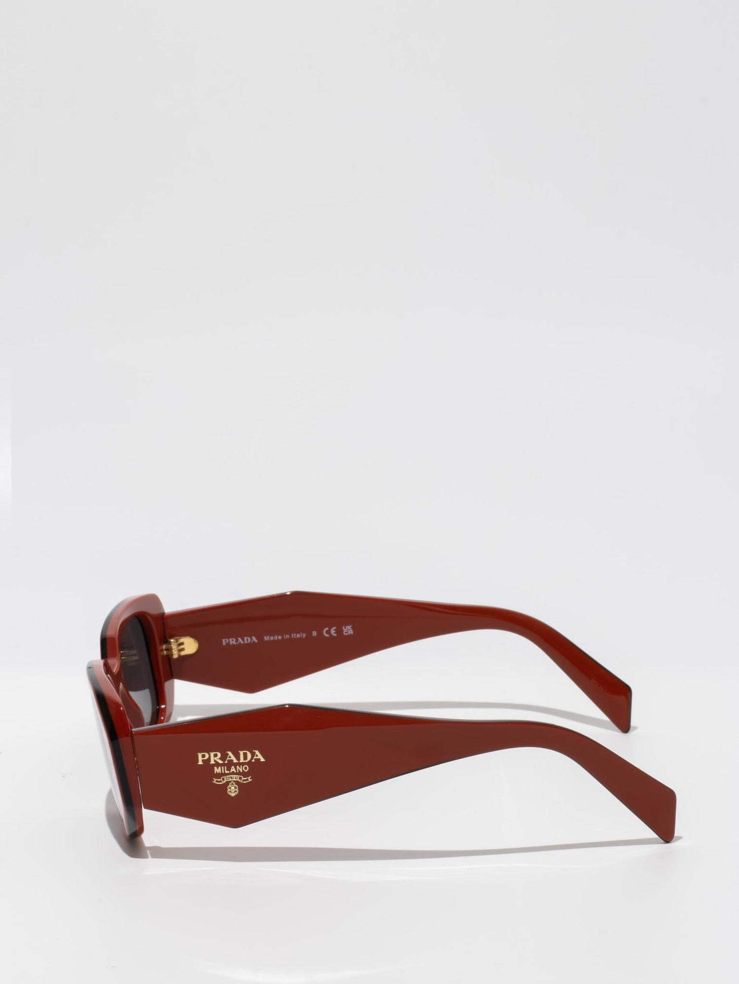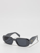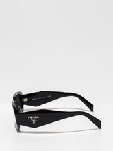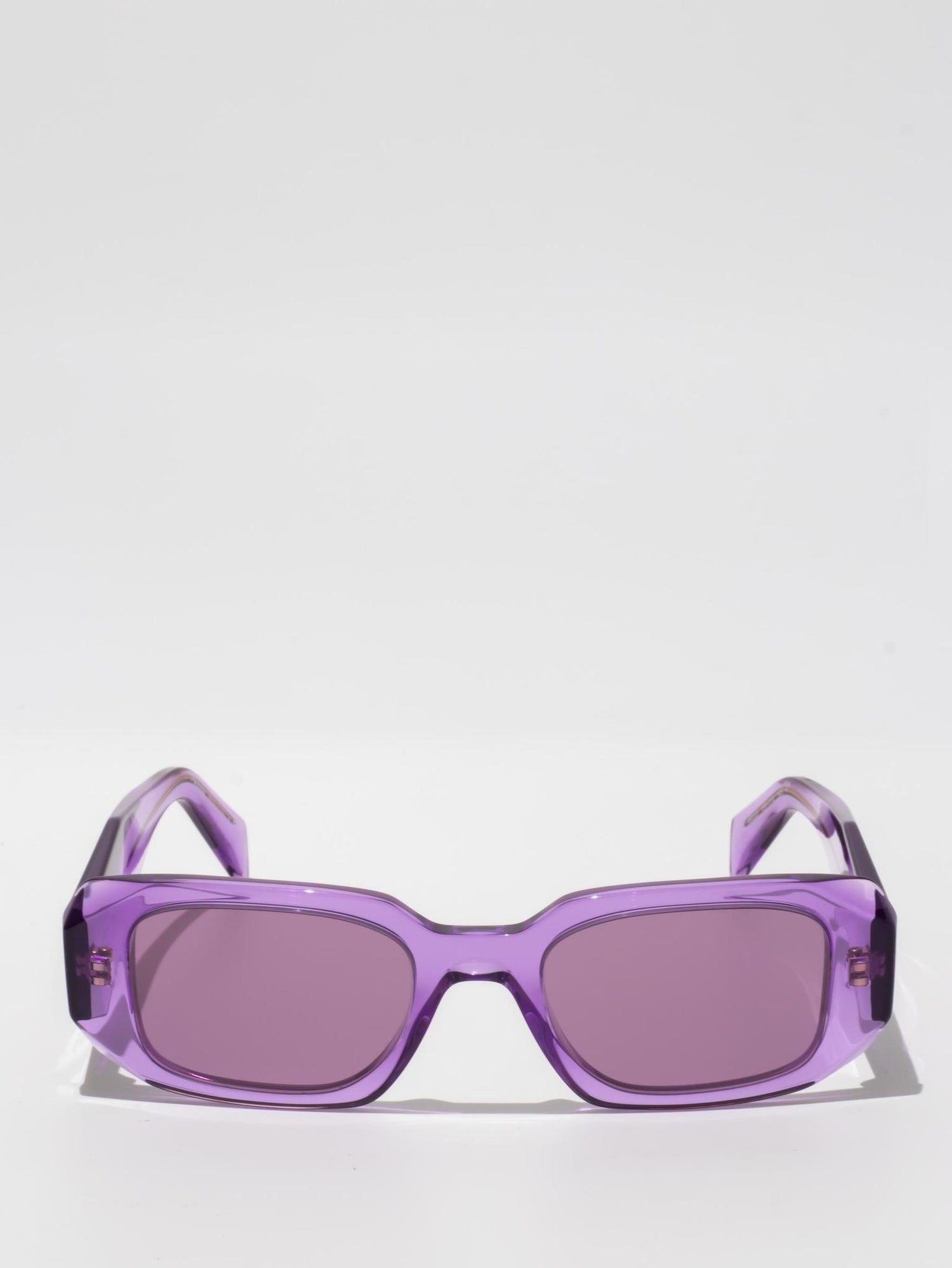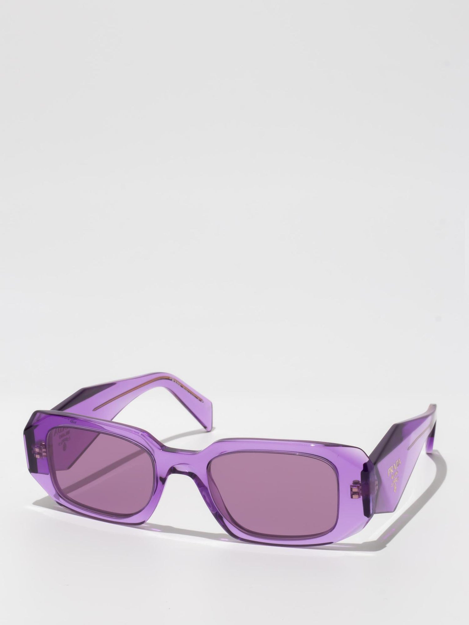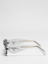 Acetate sunglasses with an oversized, geometric design. The bold frame front has an avant-garde silhouette defined by the extreme angled cut of the outer corners. The three-dimensional design of the temples is decorated with an iconographic interpretation of the traditional Prada triangle logo.