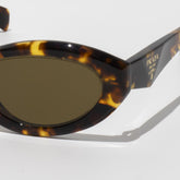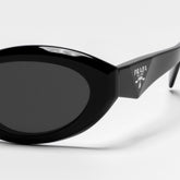 Sunglasses with an acetate frame featuring sinuous and slightly beveled rims expressing bold femininity. The thin temples are emphasized by a refined three-dimensional element that iconographically depicts the Prada triangle logo.