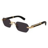 Re-launch of the Première de Cartier collection in horn inspired by the Cartier vintage collection. Narrow rectangular sun rimless style combined with full horn temples and enriched by the iconic C Décor and Godron detail. Double C Décor logo plaque on temple tips as elegant signature of the Maison.