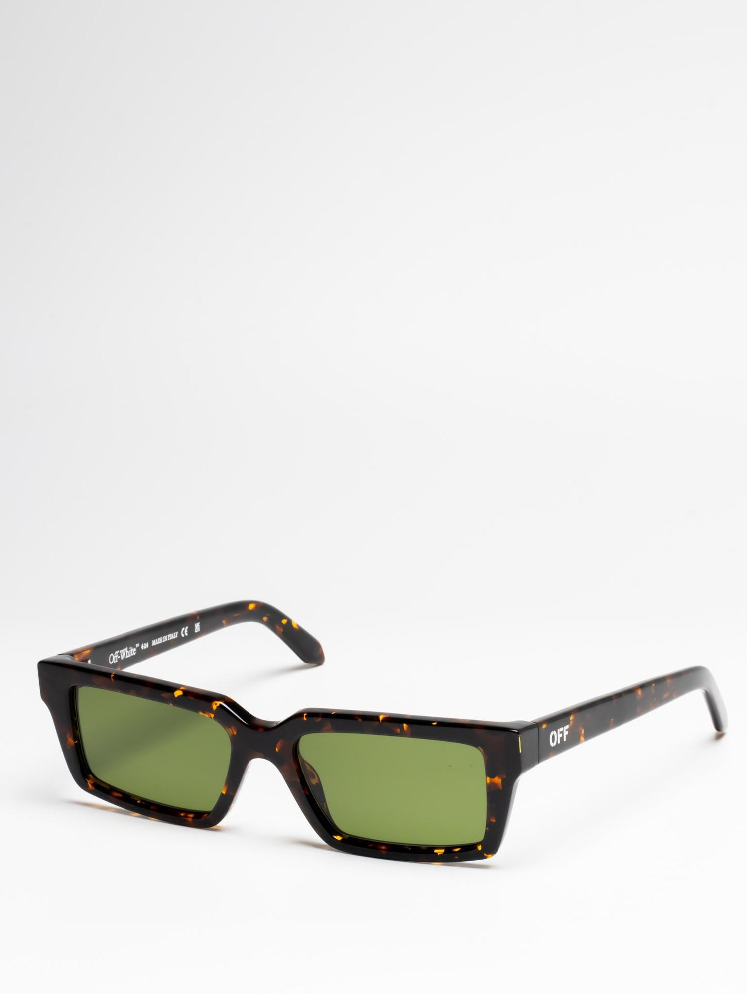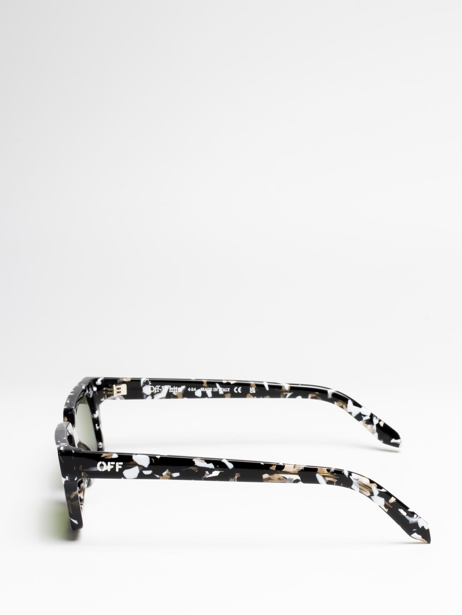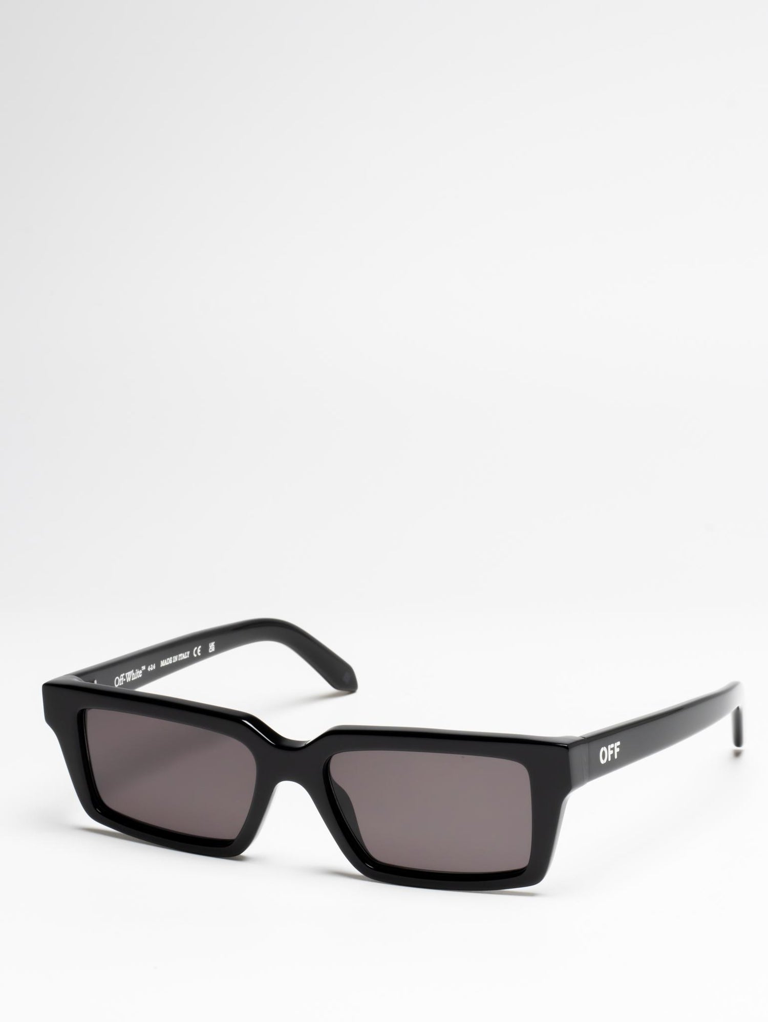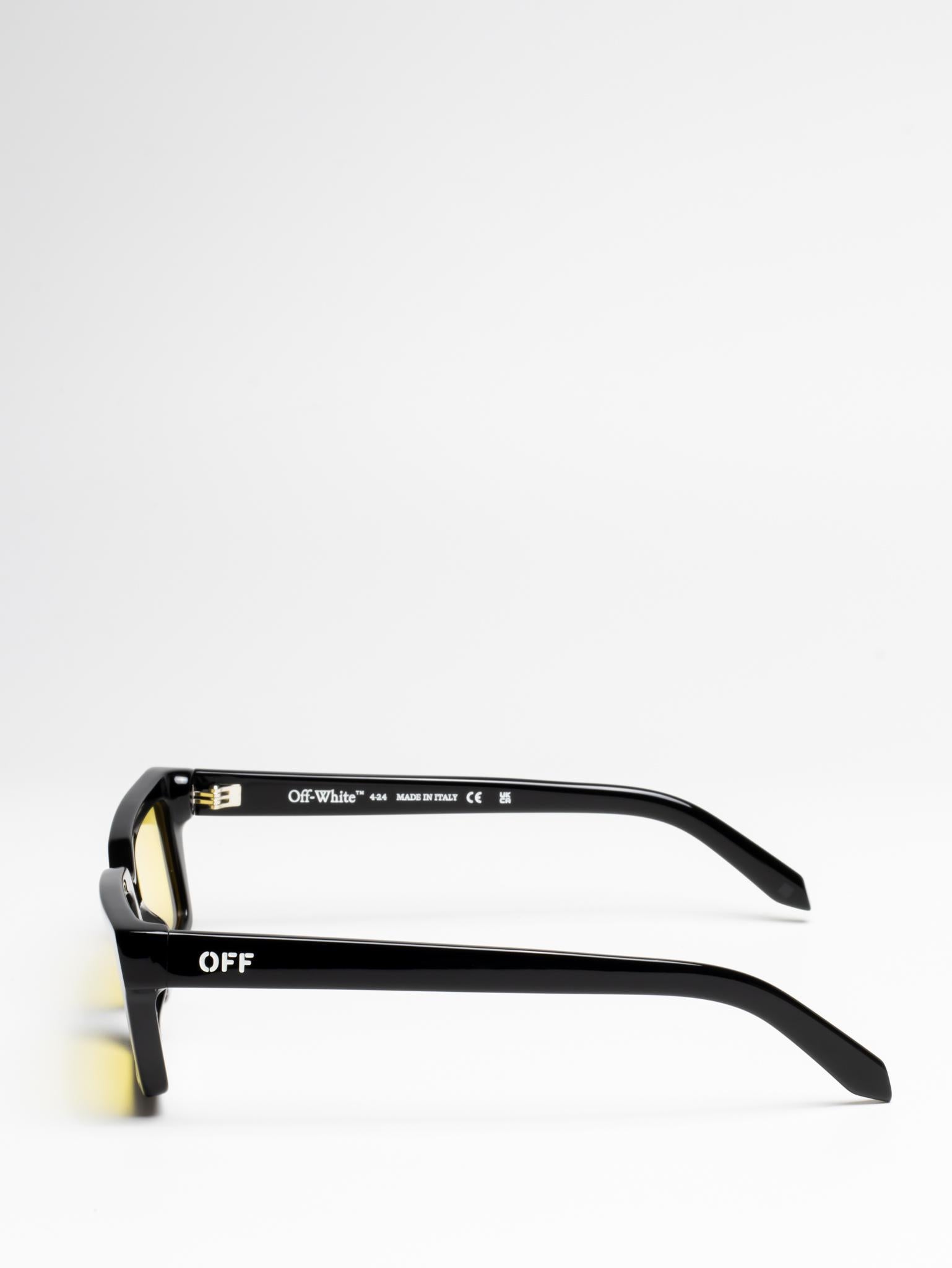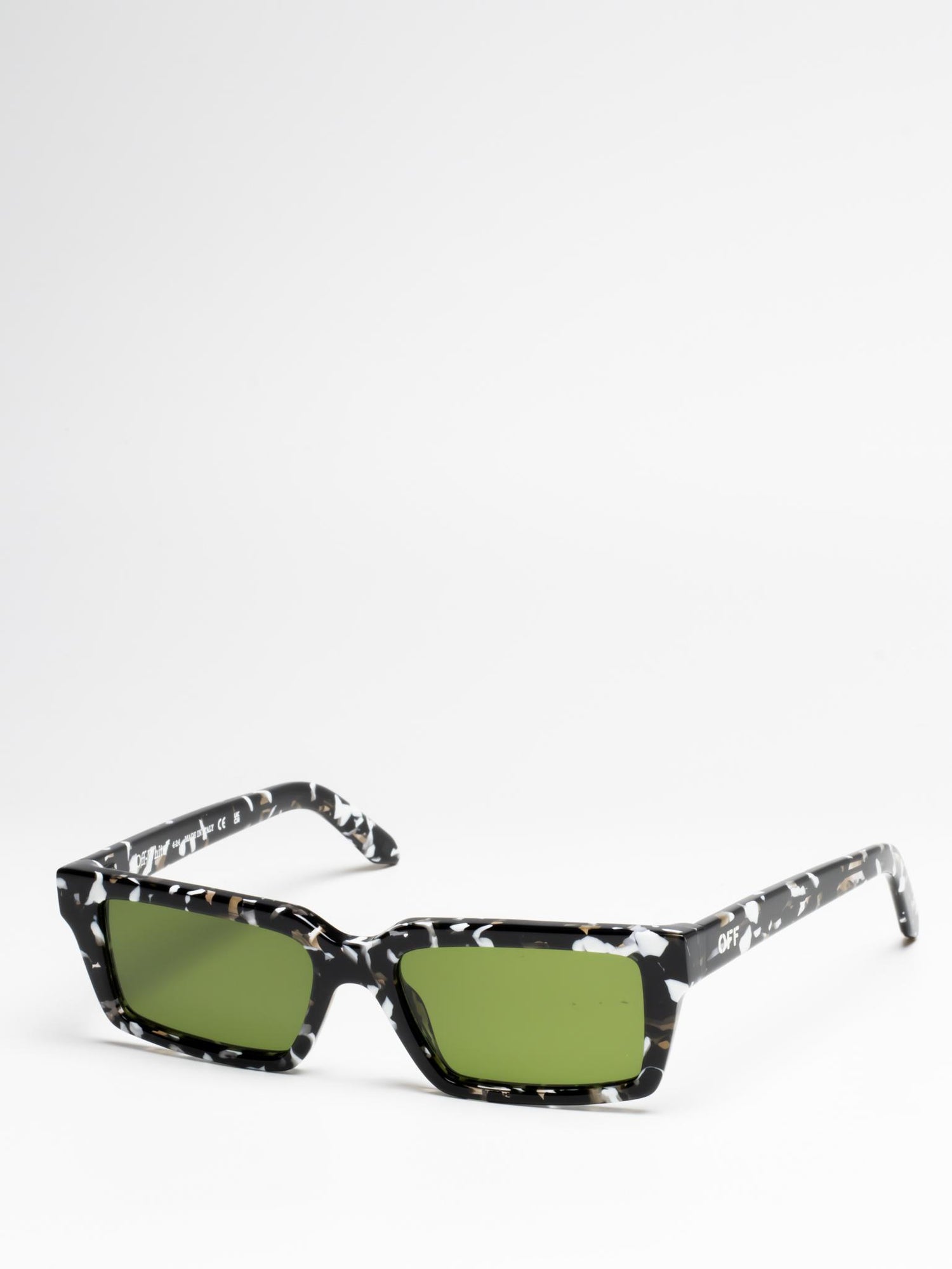 These acetate sunglasses feature a slim, rectangular silhouette with slightly elongated sides and a lightweight finish. They are completed with engraved OFF logos on the arms. Made in Italy.